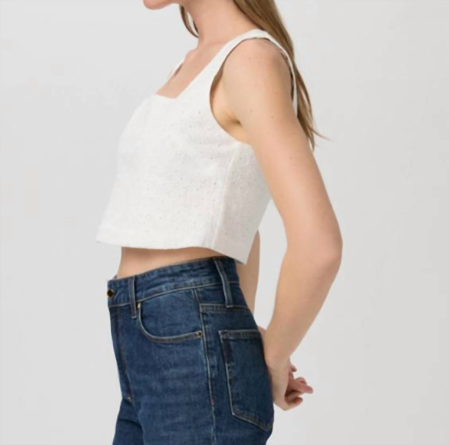 This classic tank top is perfect for layering and cute enough to wear on its own. Discover the Women's Aelita Eyelet Cropped Tank Top by Paige, a perfect summer staple in crisp white. This sleeveless design features a chic square neckline and delicate floral eyelet detailing throughout. Crafted from 100% cotton, it offers a breathable and comfortable fit. Easy to wear with a pull-on closure, this minimalist crop top is ideal for stylish vacations.