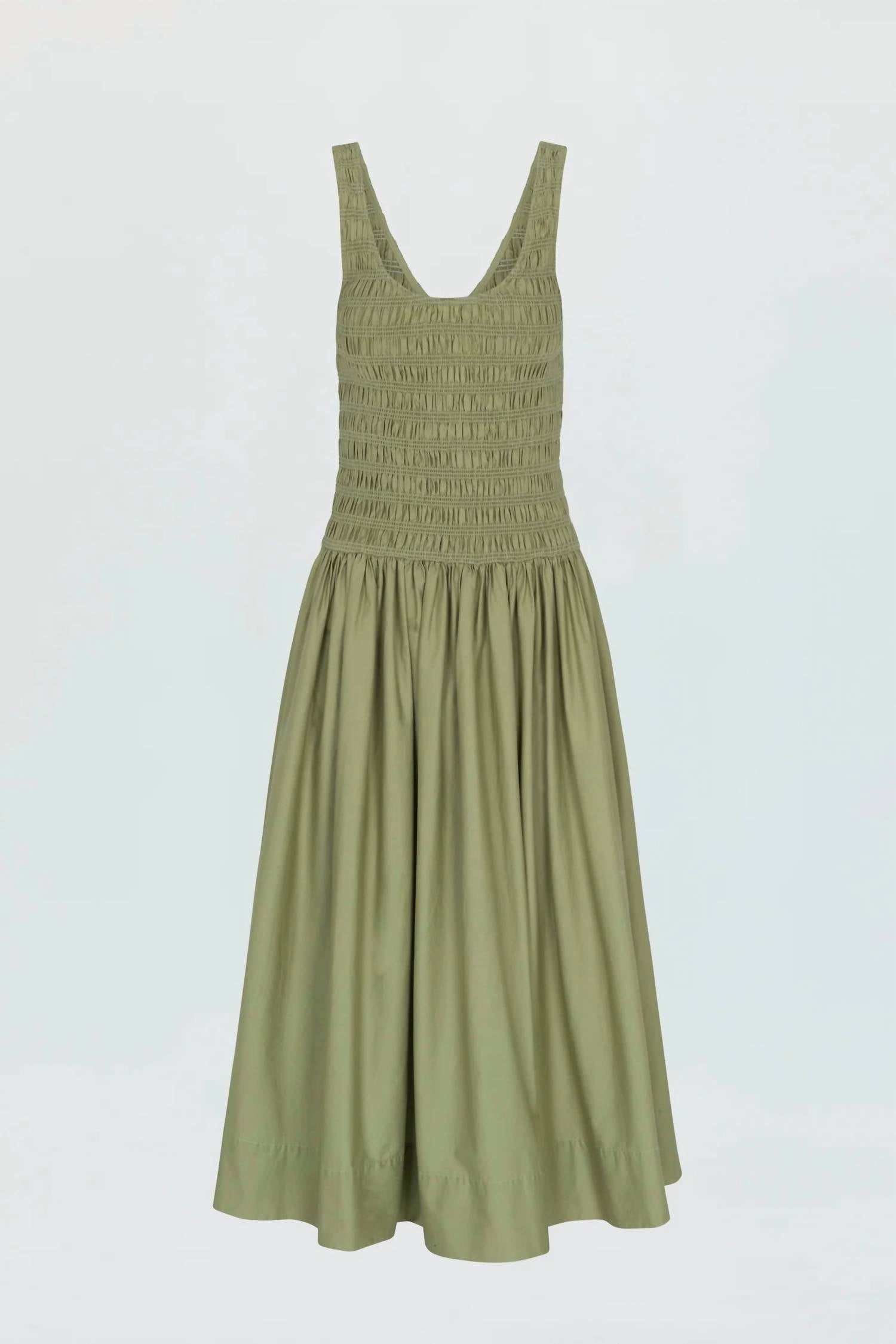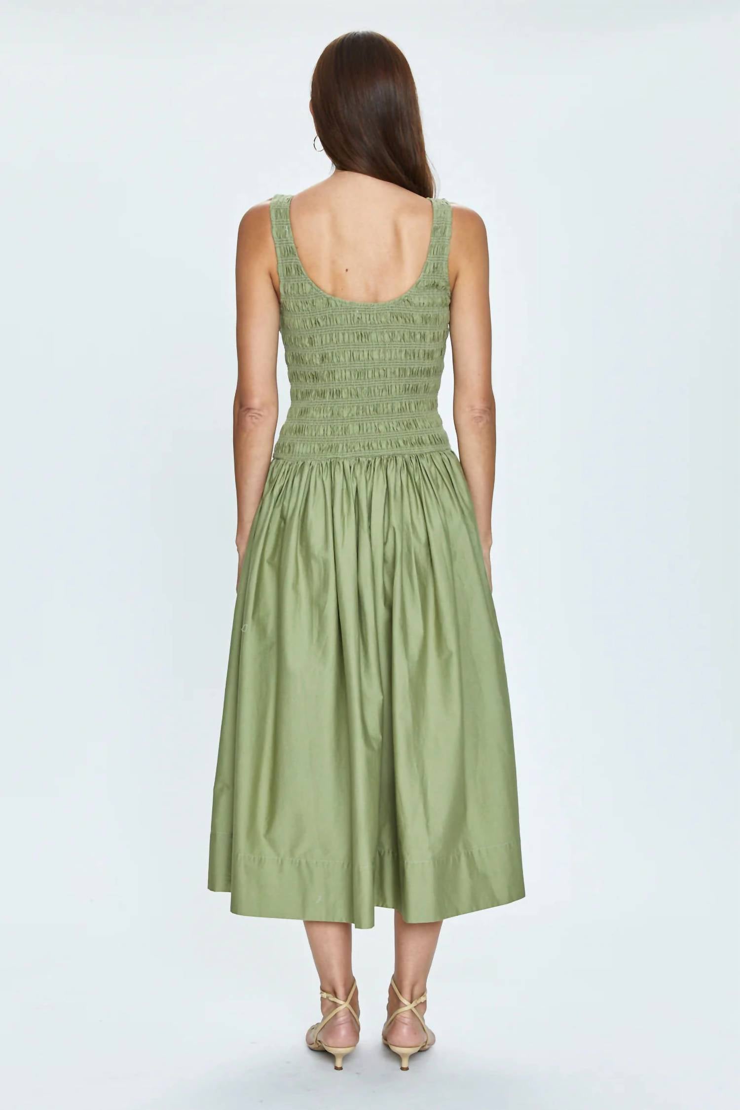 Just add slides or mules and you are good to go. Elevate your warm-weather wardrobe with the Alessia Dress by PISTOLA, a stunning midi in a Sage hue. This sleeveless number features a smocked tank-style bodice and a ruched waistband, flowing gracefully into a midi skirt. Made from a 97% cotton and 3% spandex blend, this imported dress offers breathable comfort with a lightly textured feel. Designed with a pull-on closure for easy wear, it's perfect for summer outings. For care, machine wash cold. Length is 52 1/2". Model is 5’10” and is wearing a size small.
