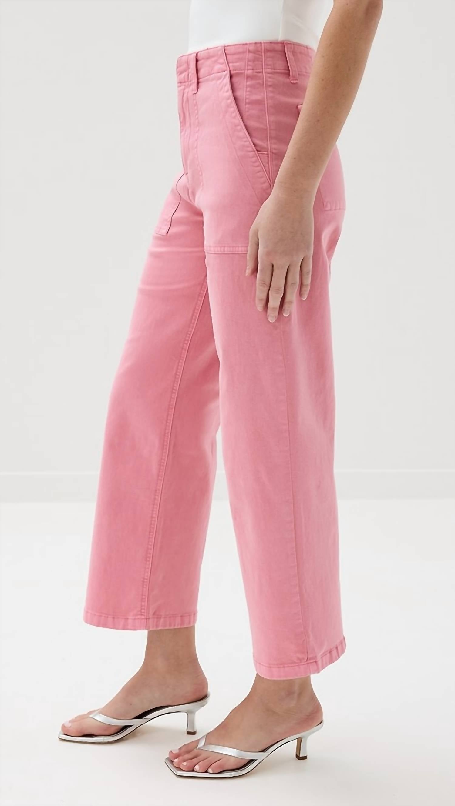 Presenting the Sophia Twill Wide Leg Pants by PISTOLA, your new go-to for chic comfort in Peony Pink. These relaxed, high-rise trousers feature a wide leg silhouette with a cropped ankle-length hem and a 26" inseam. Crafted from a stretchy cotton blend composition of 98% cotton and 2% spandex, the design includes practical patch front pockets and seamed button flap back pockets, emphasizing utility inspiration. Closure: Button closure. Care: Machine wash.
