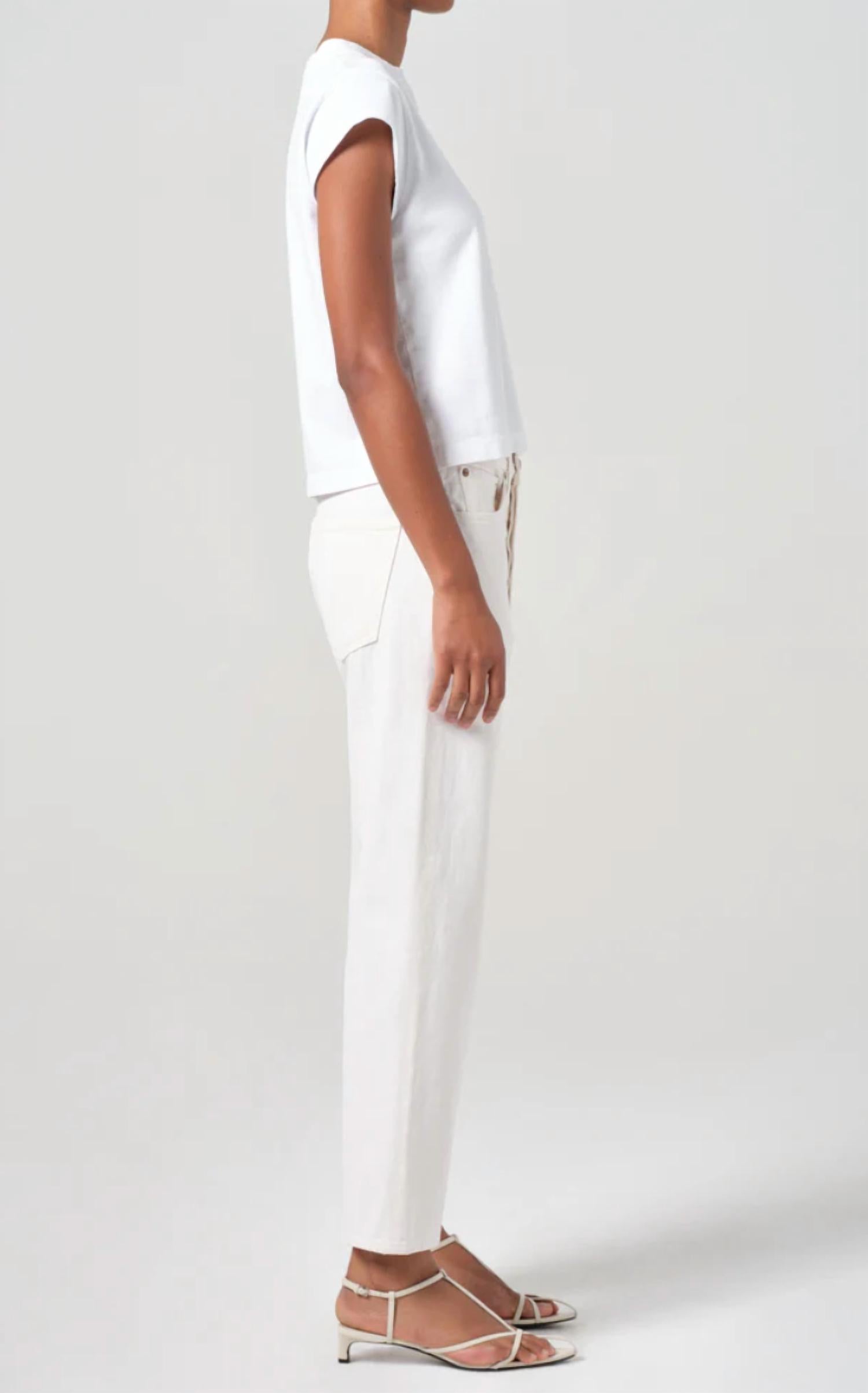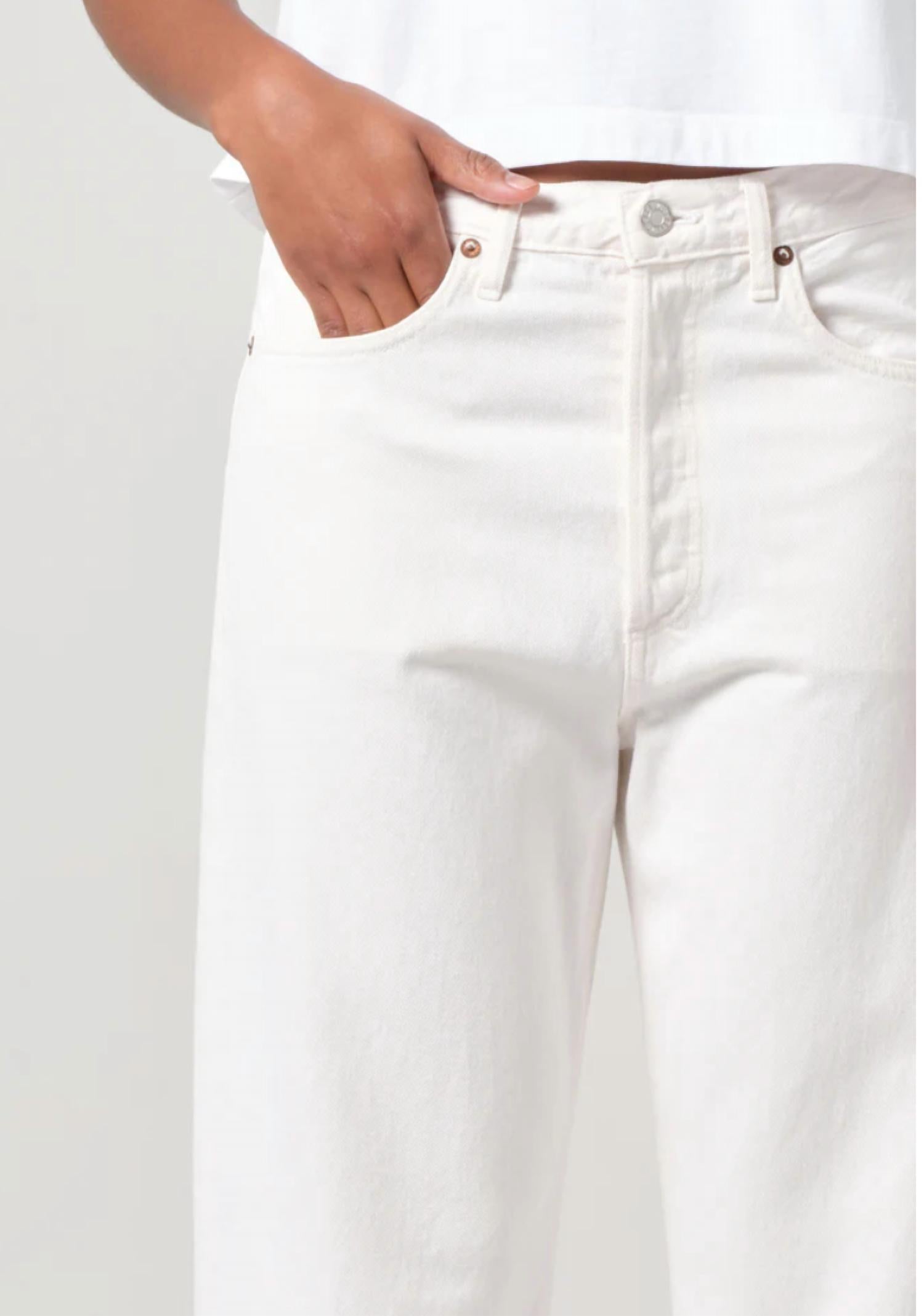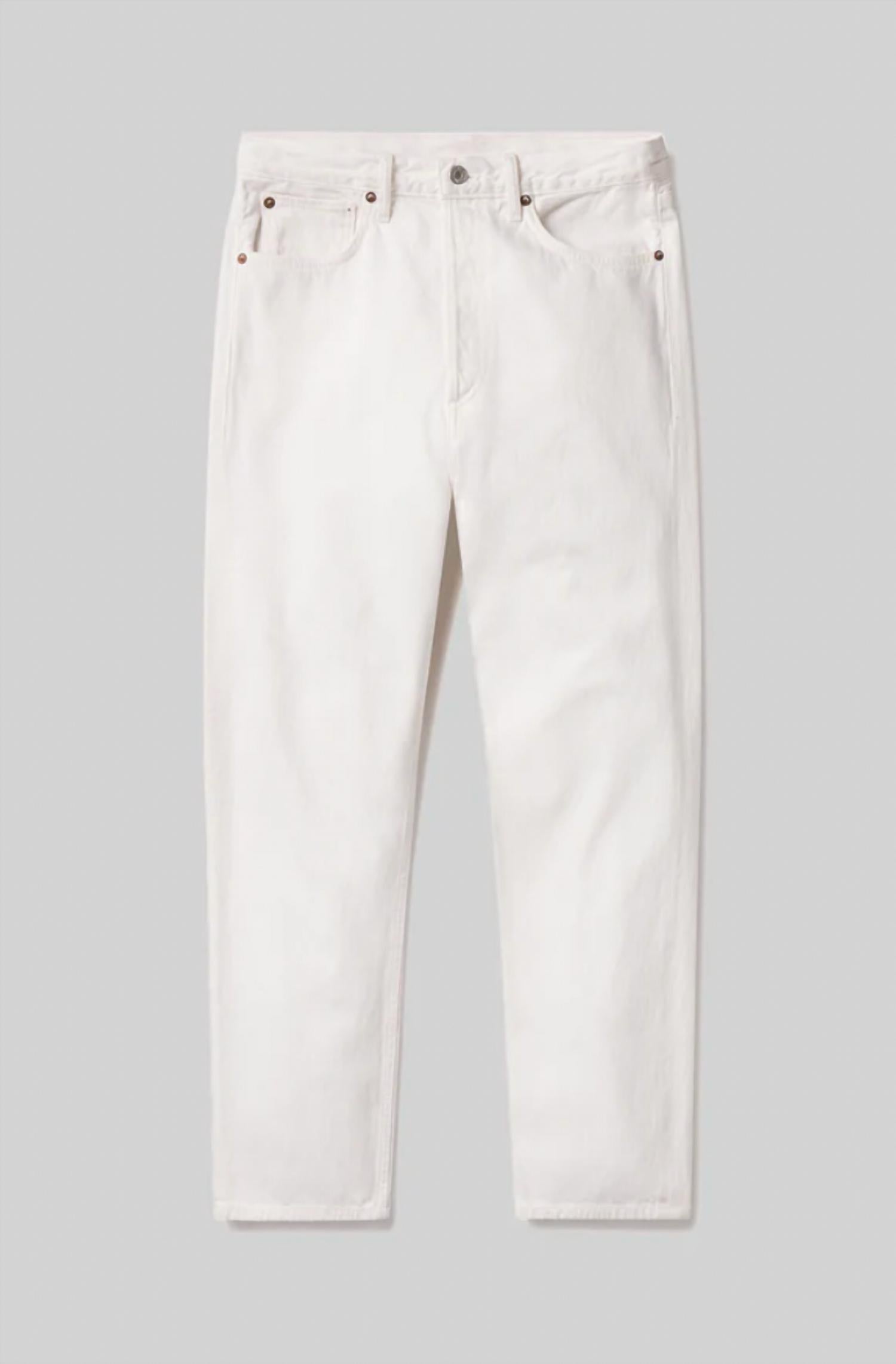 Comfortable and stylish, we love this cropped jean for all of the obvious reasons. Introducing the 90's Crop Jeans by AGOLDE, a vintage-inspired piece with a modern twist. Featuring a relaxed fit and mid-rise waist, these jeans transition into a straight leg for a laid-back silhouette. Crafted from regenerative cotton in the Fortune Cookie hue, they offer a timeless and breathable feel. Closure: Button closure. Care: Machine wash and tumble dry. Perfect for spring occasions, these jeans add minimalist charm to any look.