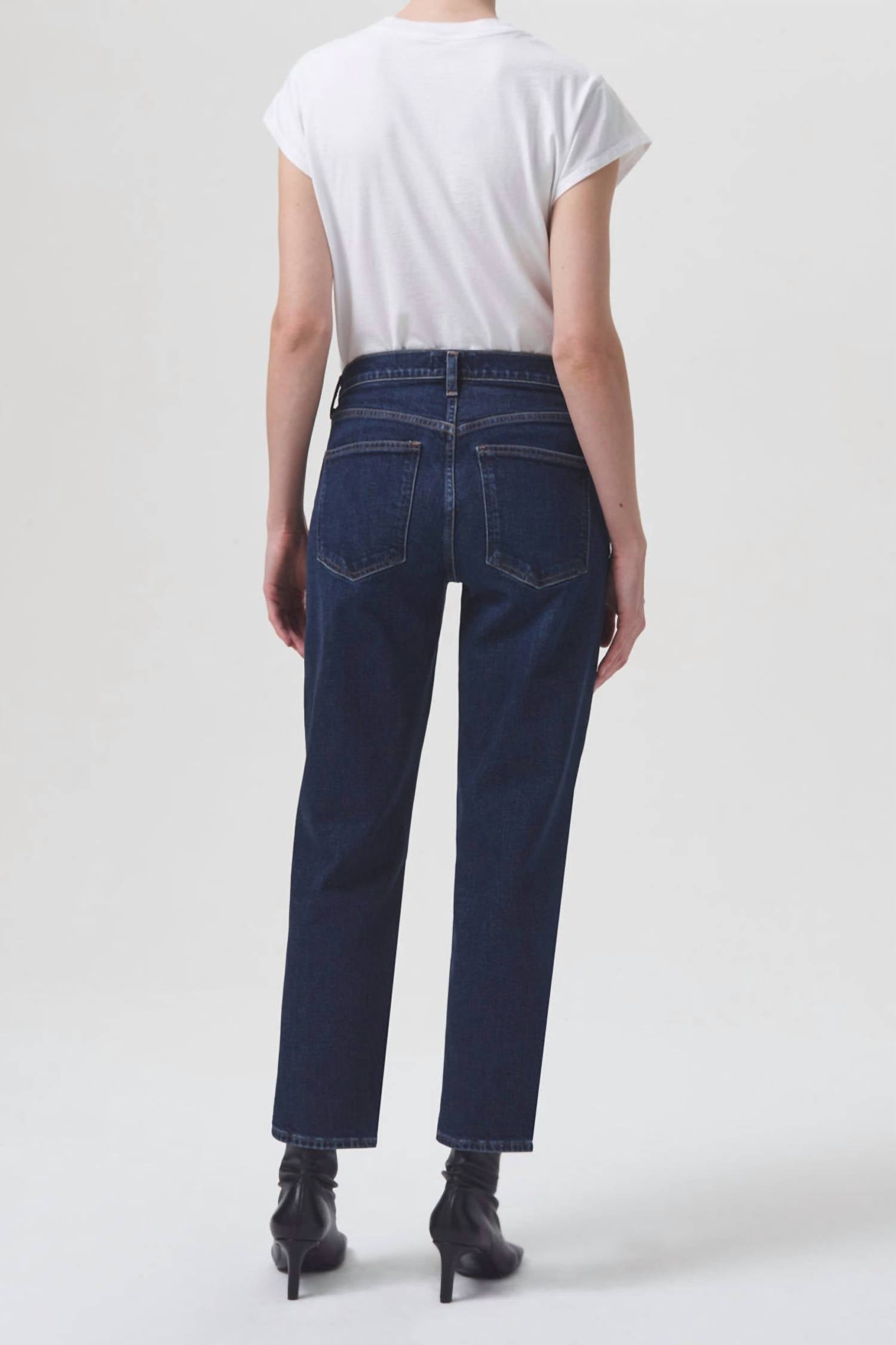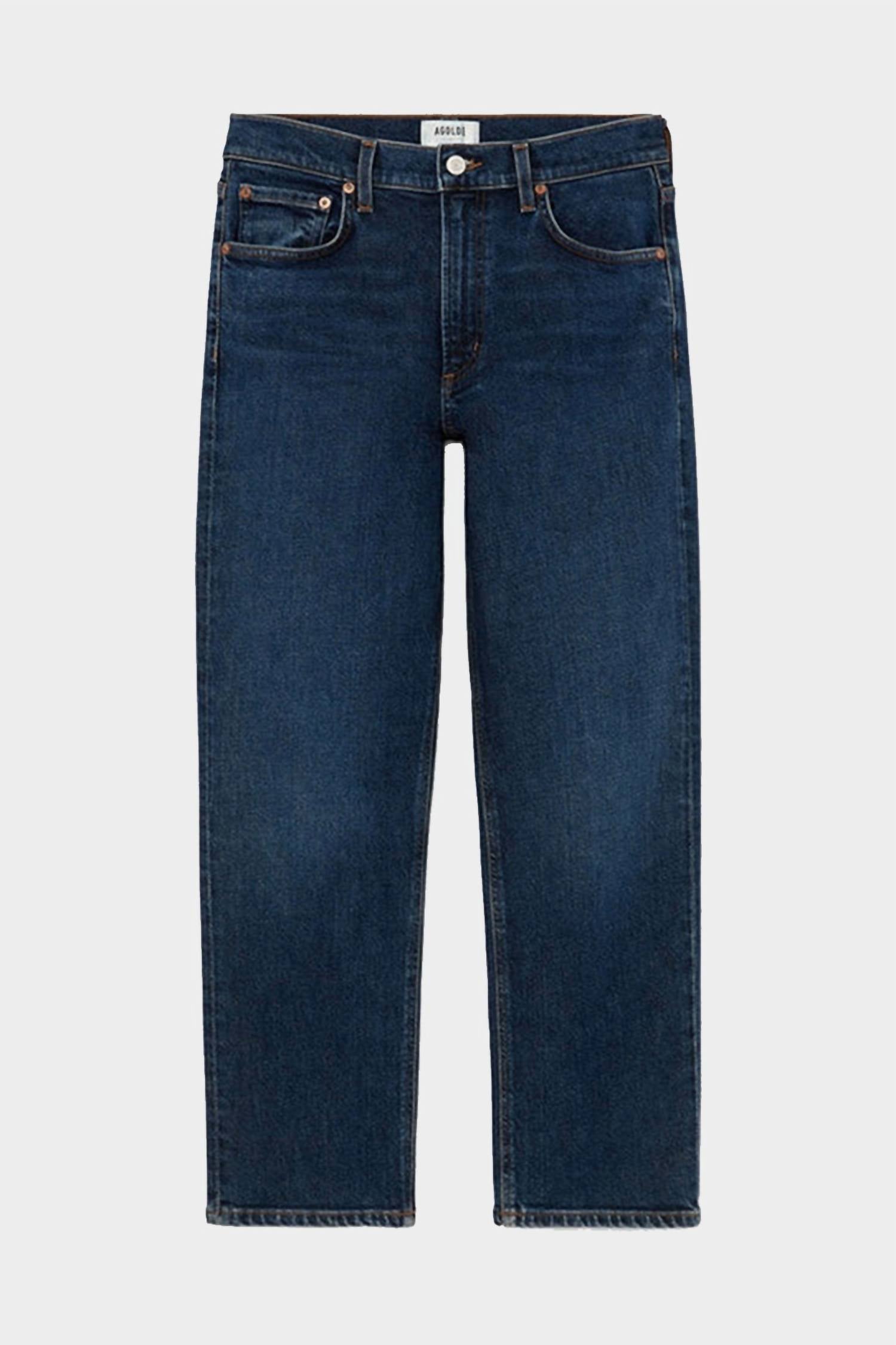 Pair these straight leg jeans with flats, sandals or even heels! You can't go wrong. Discover the Song-colored Kye Mid-rise Straight Crop Jean by AGOLDE, crafted for the minimalist at heart. Designed with a mid-rise waist and a relaxed fit, these jeans have a zip fly closure for effortless wear and practical pockets. Made from a sustainable blend of 59% Organic Cotton, 40% Ecovero Viscose, and 1% Elastane, this solid dark wash piece is perfect for a spring holiday party. Care for your jeans easily by machine washing cold inside out, avoiding bleach, and tumble drying on low. Model is 5'10" and is wearing a size 27.