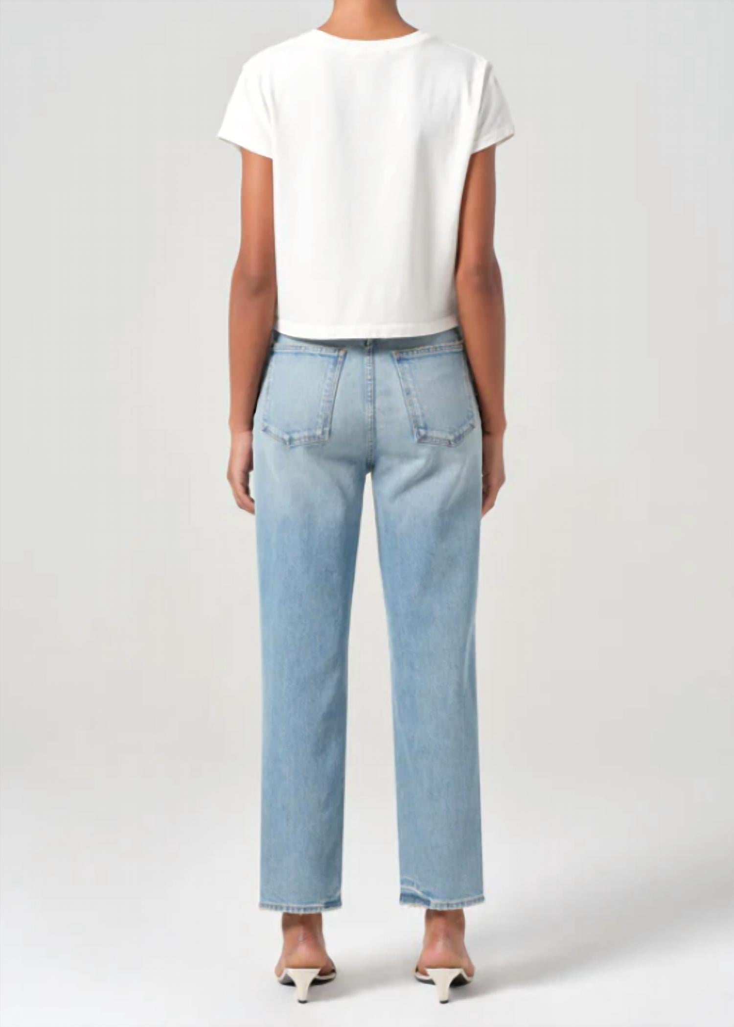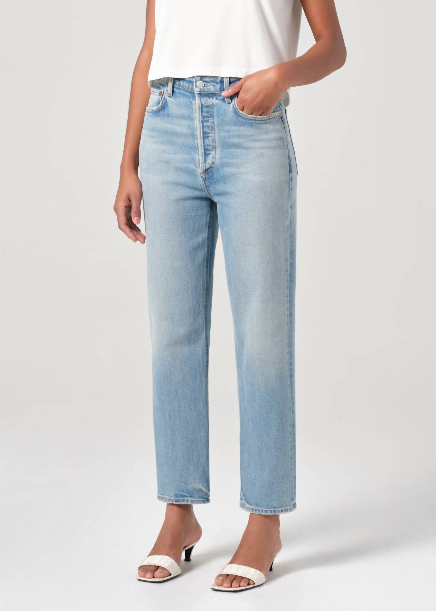 This classic straight leg jean has a perfect fit and goes with just about everything. Discover the AGOLDE Women's Straight Leg Jeans, perfect for those breezy spring days or a laid-back vacation getaway. These jeans offer a classic straight leg fit in a light wash ripple color, effortlessly fitting into any streetwear trend. Patterned in a solid design, they feature convenient pockets and a zip closure for practicality and style.