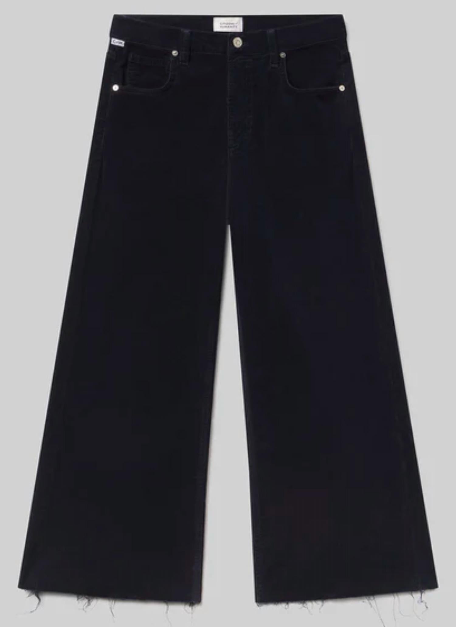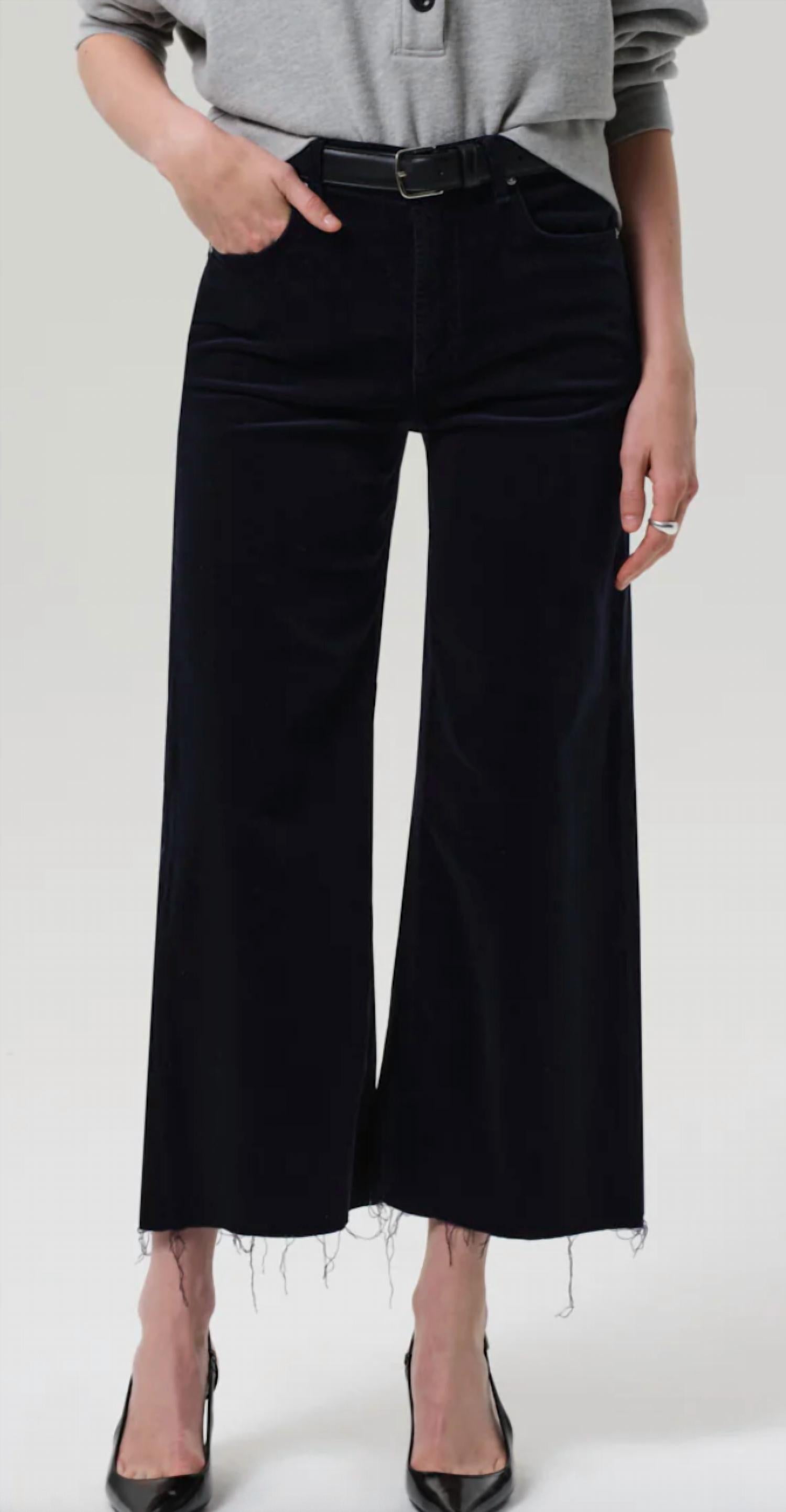 Embrace vintage elegance with the Lyra Wide Leg Crop Pants by Citizens of Humanity. These high-rise pants in corduroy Navy offer a relaxed fit and voluminous modern shape, perfect for any spring occasion. Crafted from soft stretch baby corduroy, they feature a solid pattern with practical pockets and a zip closure for easy wearability. Care for these stylish pants is simple with machine washing and laying flat to dry.
