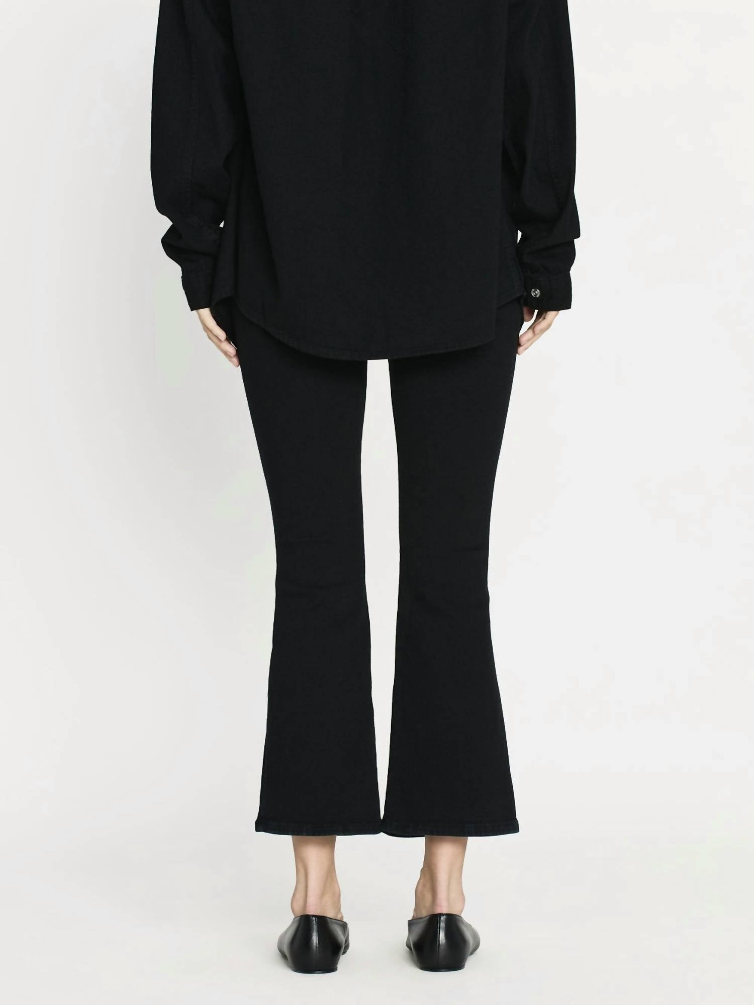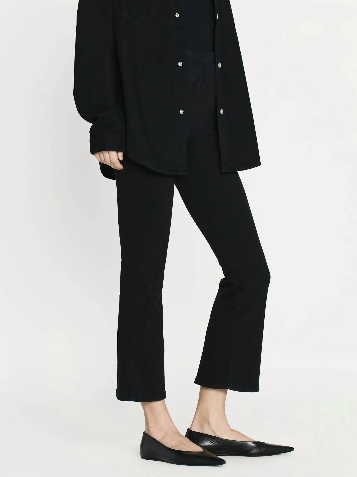 Slightly flared pants are all the rage right now and these are no exception. Pair these with your favorite tee for a more casual look, or with your favorite button-up blouse for an evening out. Experience the ultimate in comfort with FRAME's Jetset Crop Mini Boot Cut Pants in Sheen Noir. Designed with a high-rise fit and flattering cropped mini boot hem, these pants feature a comfortable pull-on closure for easy wear. Fabricated from a cotton blend of 92% Cotton, 4% Polyester, and 4% Elastane, they promise both style and flexibility. Care: Dry clean only. The pants offer a 10" front rise, 26.5" inseam, and an 18.25" leg opening, making them a chic choice for any holiday party.