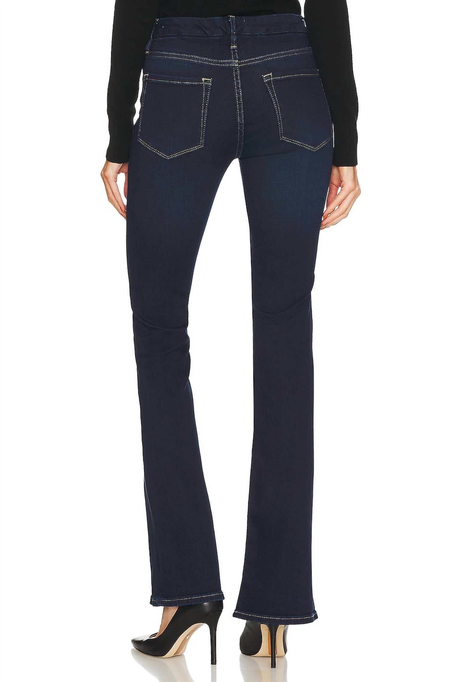 A boot-cut jean that not only looks good on, you'll be comfortable in them all day. Introducing the Le Mini Boot Jeans by FRAME in the Parkway color, perfect for your summer vacation wardrobe. These women's jeans boast a high rise with a 10" rise and a slim fit, seamlessly combining style with comfort. Crafted from a cotton blend, they feature a classic bootcut leg style and functional pockets, enhancing their practical appeal. Closure is provided by a button closure, and they are easy to care for with machine wash instructions. The solid pattern and 33.0" inseam make them a chic nod to 90s fashion.