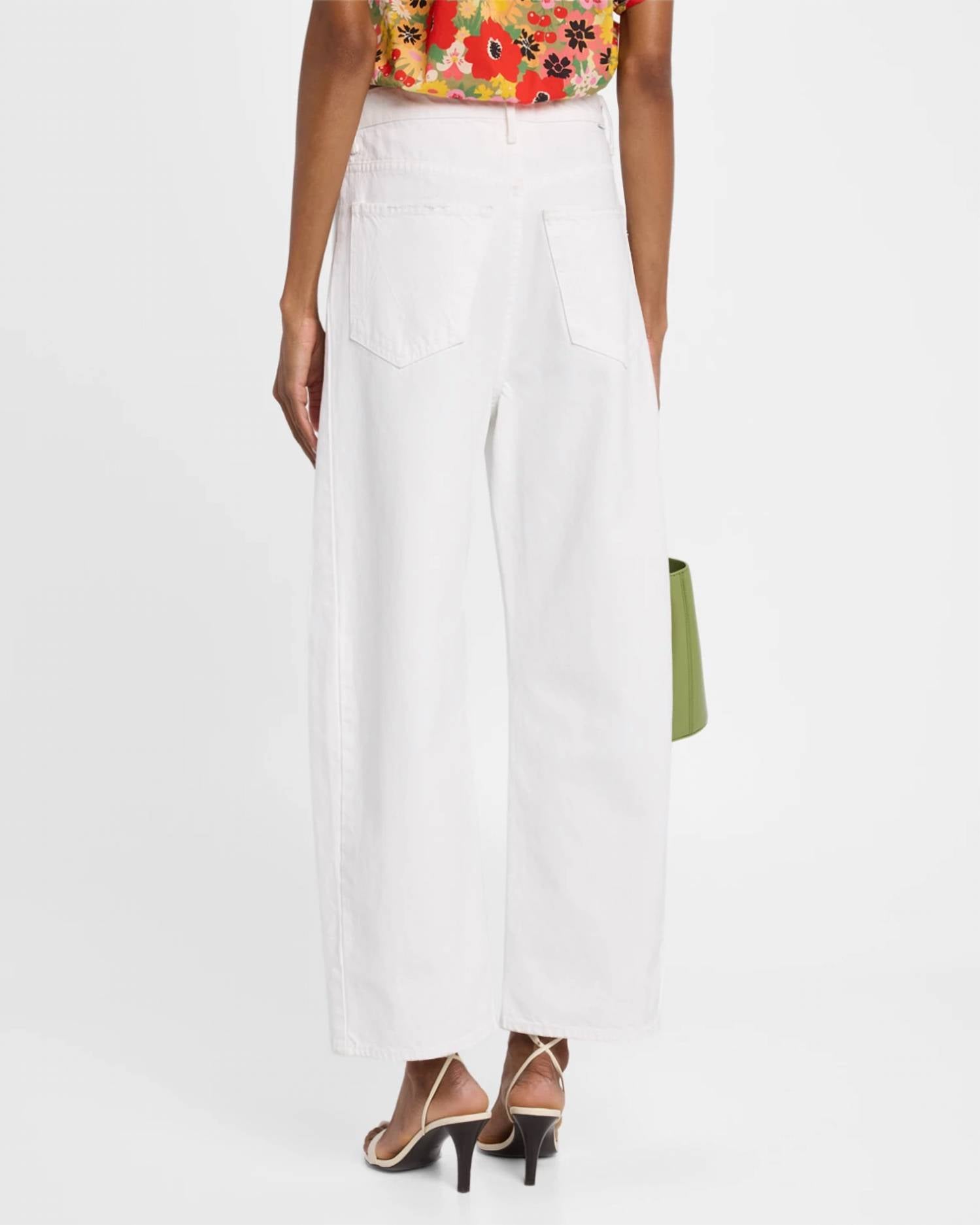 Comfortable and stylish, we love this cropped jean for all of the obvious reasons. Introducing the Full-pipe Ankle Jeans by Mother, a chic addition to your wardrobe in a crisp white hue known as Picket Fence. These women's jeans feature an ankle-length, wide leg style with a loose, curved fit. With a mid-rise 12.5" rise and a versatile 27.5" inseam, they are designed for comfort and style. Made in the USA from high-quality cotton, these jeans include a classic five-pocket style and button closure, making them perfect for streetwear-inspired travel this fall.