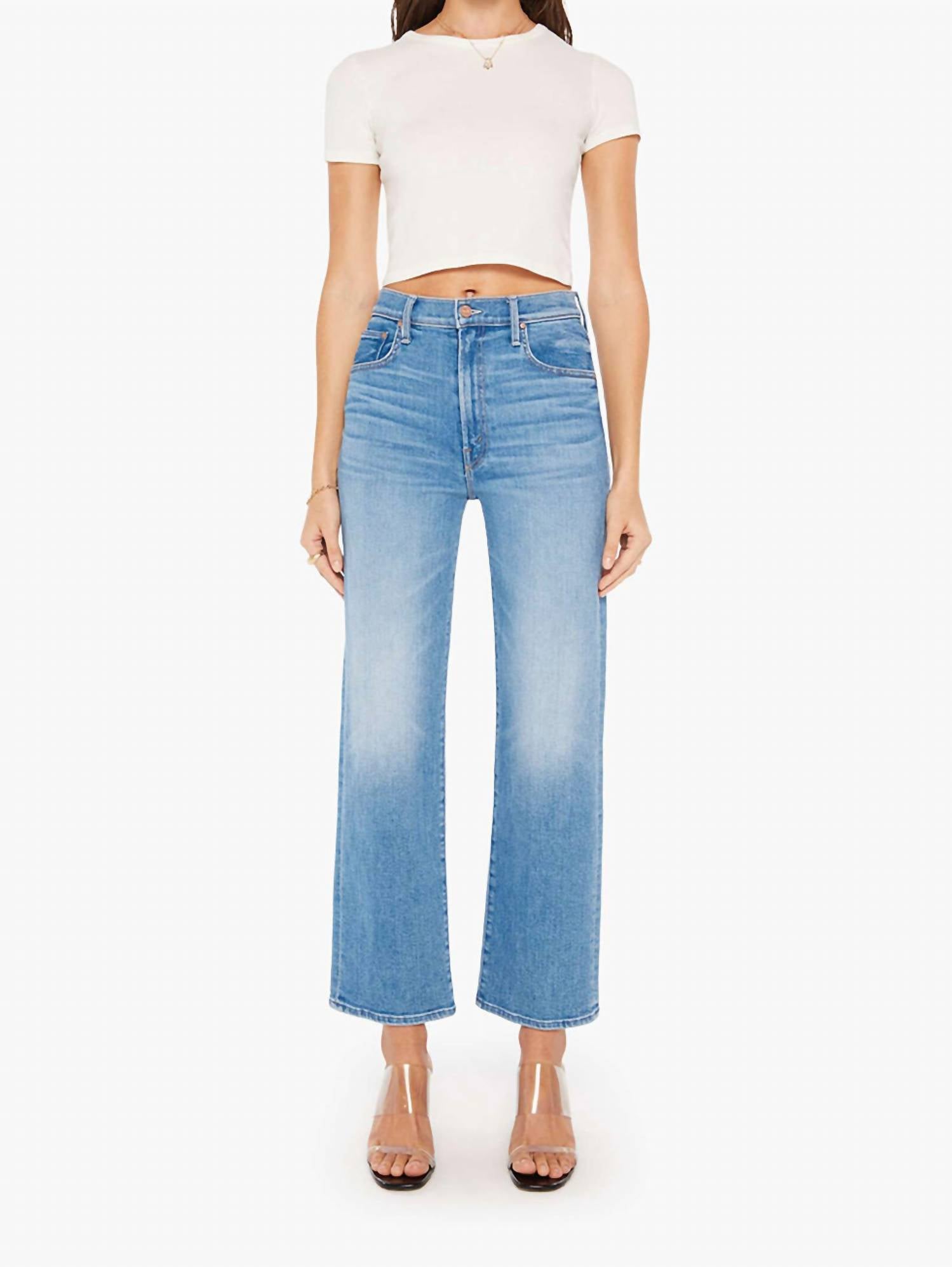 Pair these straight leg jeans with flats, sandals or even heels! You can't go wrong. Presenting the Rambler Zip Ankle Jeans by Mother, a stylish addition to your wardrobe in the versatile Out Of The Blue shade. These mid-rise jeans feature a relaxed fit with a wide straight leg and a clean, ankle-length 27.5" inseam. Crafted from 78% Cotton 16% Modal 4% Polyester 2% Elastane, they offer comfort and stretch for everyday wear. Closure: Button closure. Care: Machine wash and lay flat to dry. With a 9.75" rise, they’re perfect for a chic yet casual streetwear look.