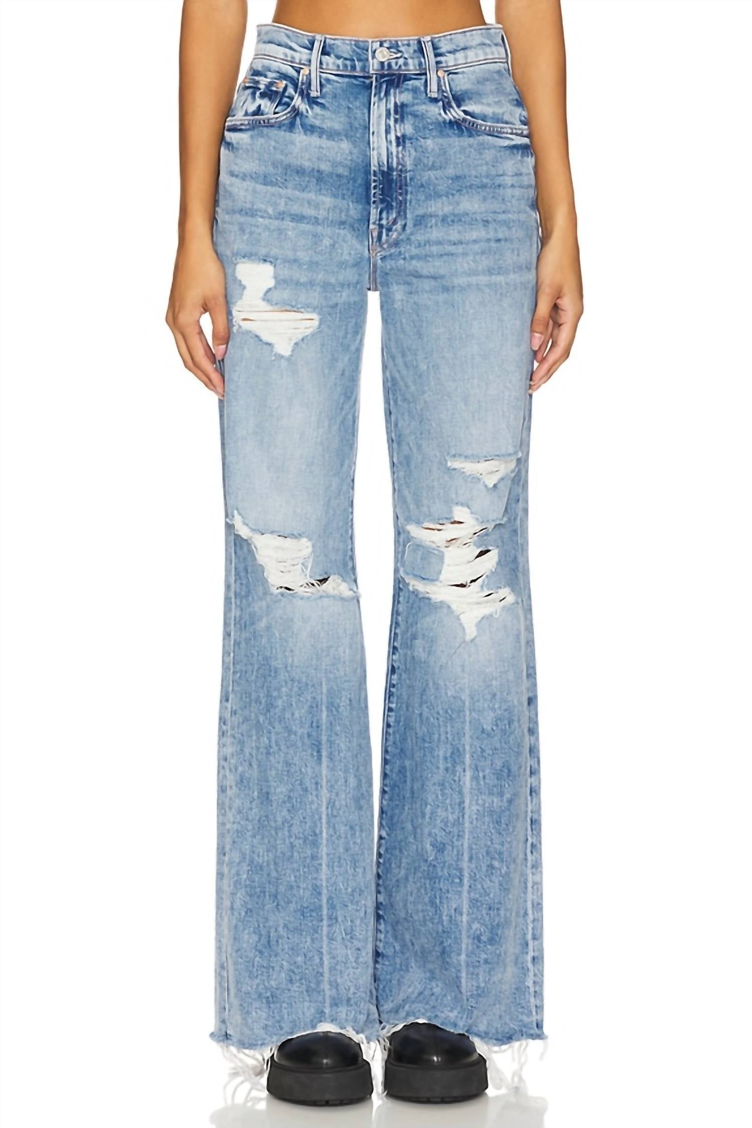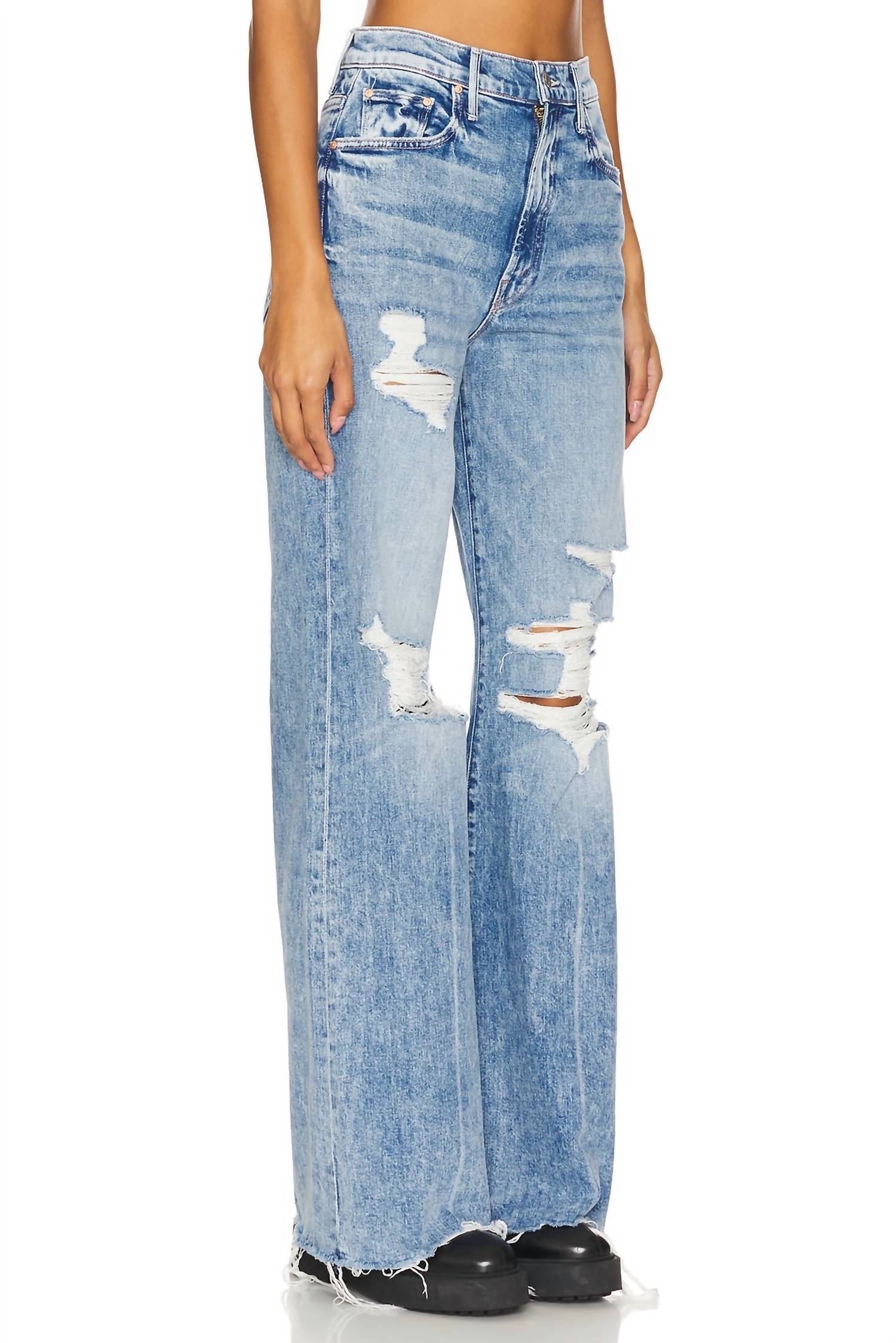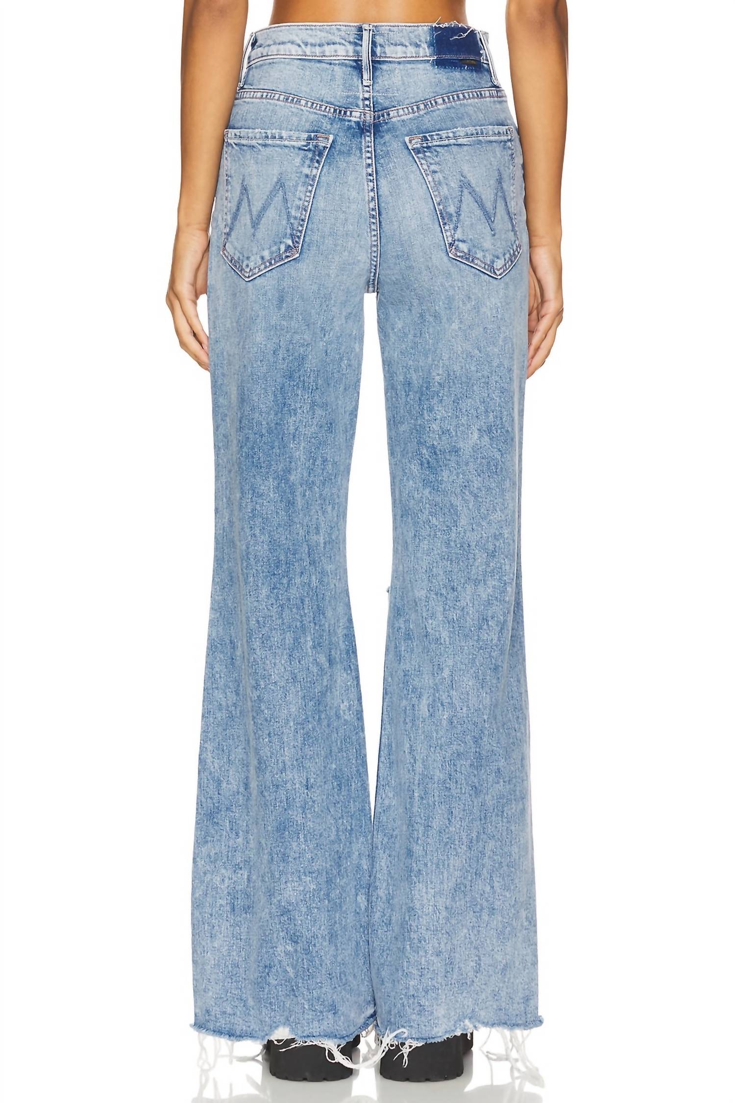 Fit to perfection, we love these high-waist jeans and you will too. Discover the Sidestepper Sneak Chew Jeans by Mother, a standout high-rise style perfect for your spring wardrobe. These women's jeans in the limited-edition STFU vintage-blue wash feature a relaxed fit with a wide leg and a long 32.5-inch inseam, complete with a chewed hem. Crafted from a durable cotton blend, 98% cotton and 2% elastane, they boast a pattern design and include pockets for functionality. Closure: Button closure. These jeans are designed to break in over time, embodying both style and patience.