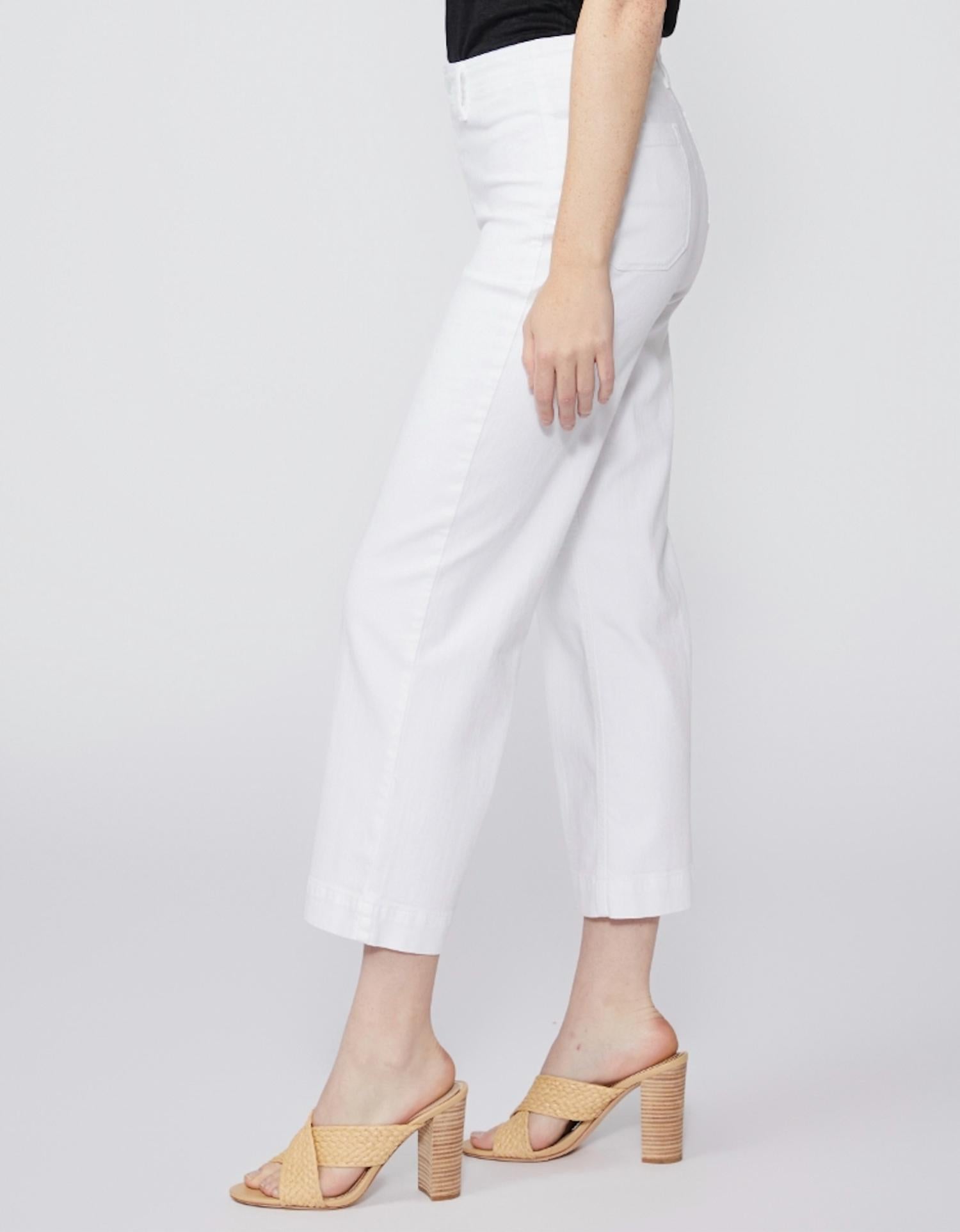 We especially love this cropped jean with a cute pair of slides or sandals. Discover effortless style with the Clean Front Nellie Culotte Jeans by Paige, crafted in a crisp white cotton blend. These high-rise jeans feature a regular fit with a straight leg silhouette, perfect for a chic summer streetwear look. The design includes functional pockets and a convenient zip closure. Composition: 92% Cotton, 6% Elastomultiester, 2% Elastane. Care is easy with machine wash and tumble dry instructions.