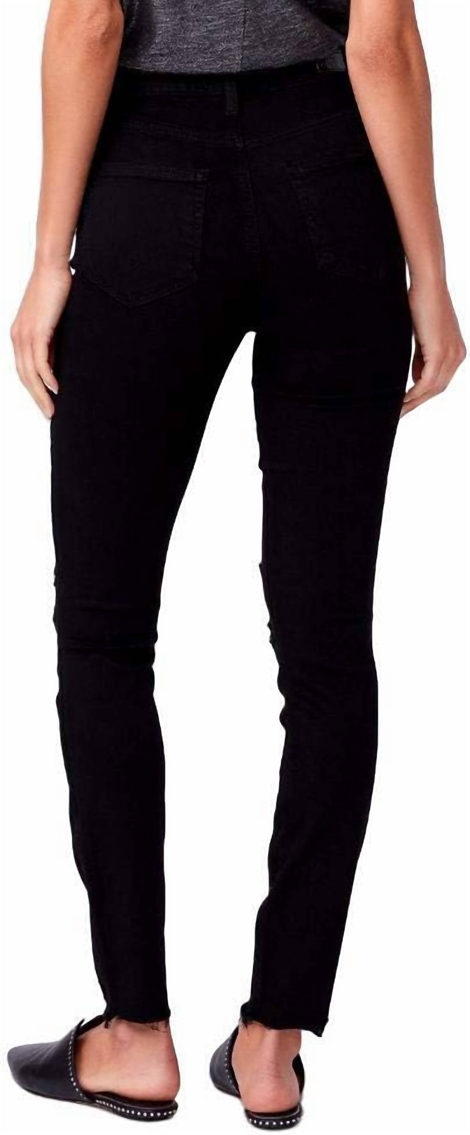 A skinny jean that is both flatering and comfortable. We love this style because it works great with boots, or without! Introducing the Margot Ankle Jean by Paige, perfect for embracing a minimalist style in the hottest summer trends. These jeans feature a high-rise, slim fit and are crafted from luxurious Rayon material for comfort and style. The skinny leg design in a solid Midnight Storm Destructed color is enhanced by convenient pockets. Closure: Button closure. Care: Machine wash. Ideal for vacation wear, these jeans are a staple in any wardrobe.