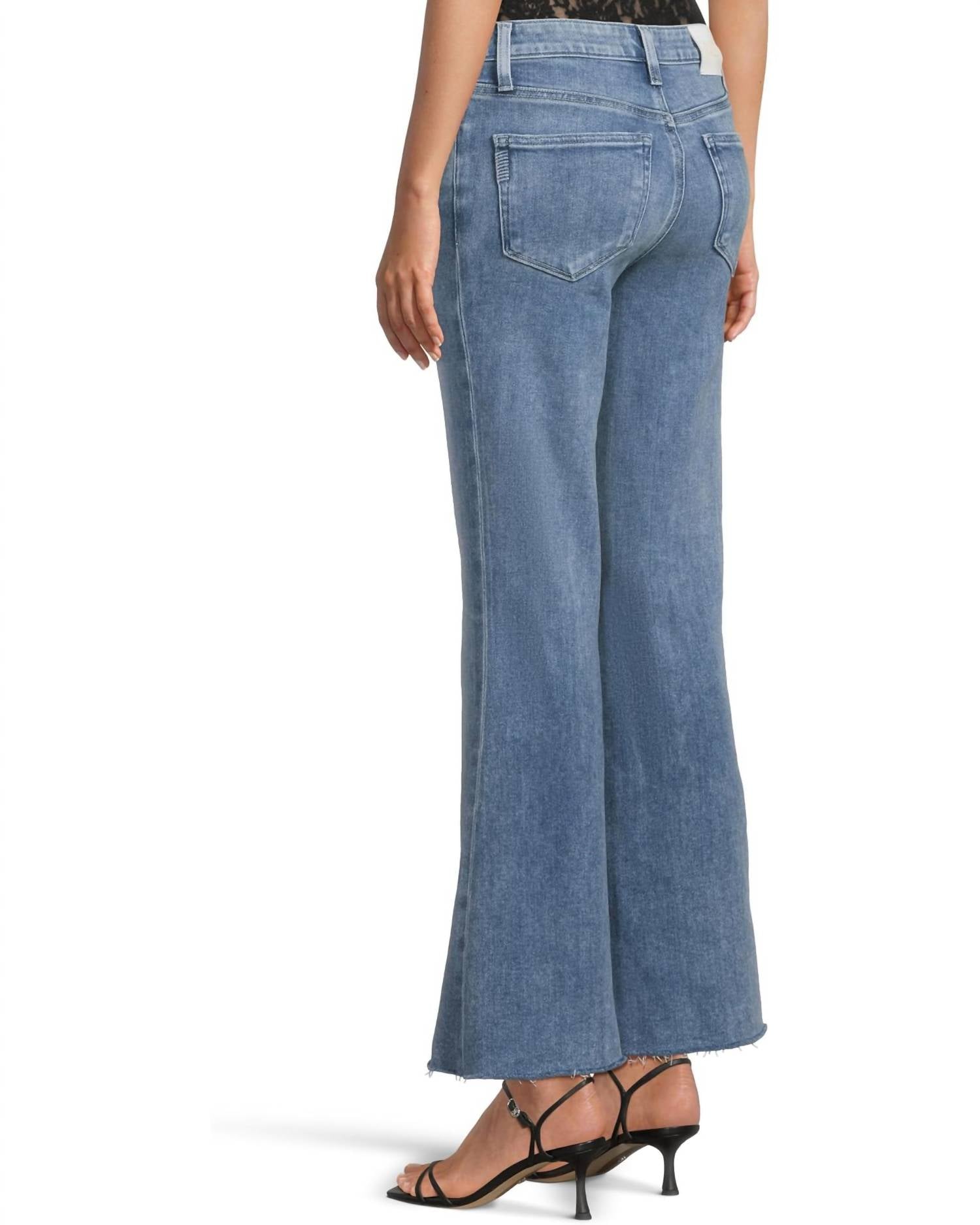 A flattering silhouette that's suprisingly versatile. Meet the Marlow Skimmer Raw Hem Jean by Paige, a chic addition to your denim collection in the distinctive Bebop color. These stylish jeans feature a classic five-pocket style with a mid-rise and a flare silhouette, crafted from a cotton blend composition of 93% cotton, 5% polyester, and 2% spandex. The jeans measure an inseam of 30 inches with a flattering front rise of 10.5 inches, ensuring a comfortable and trendy fit. Closure: Zip closure, care for these medium wash jeans is made easy with machine wash instructions. Imported and ideal for a spring holiday party.