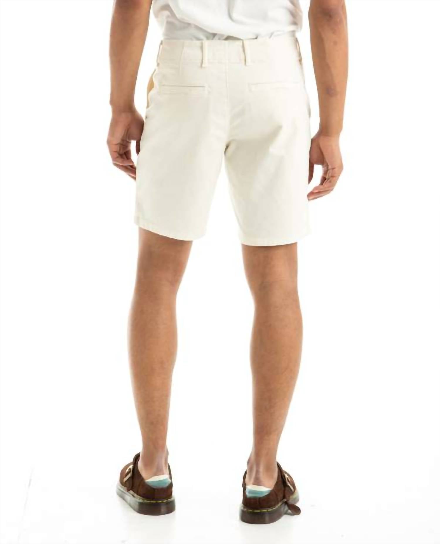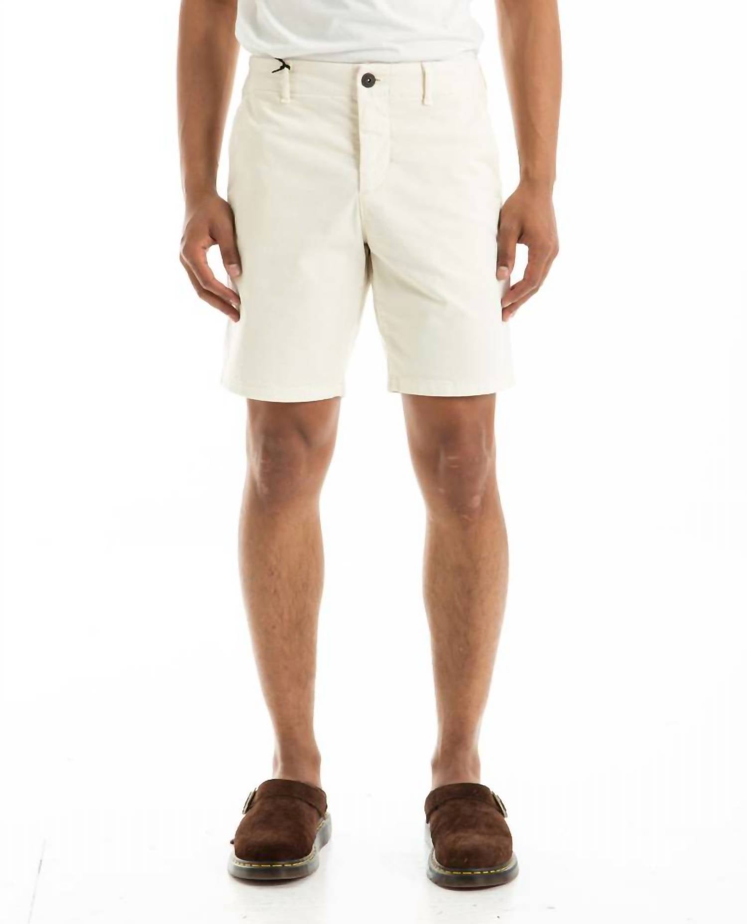 Meet the Phillips Short in ecru by Paige, ideal for the modern chino style enthusiast. With a solid pattern and an 8-inch inseam, this flat front design offers both a refined look and comfort, thanks to its cotton blend with added stretch. The shorts are equipped with pockets and feature a convenient zip closure. Easy to care for, they are machine washable and safe for tumble drying, making them perfect for minimalist summer vacations.