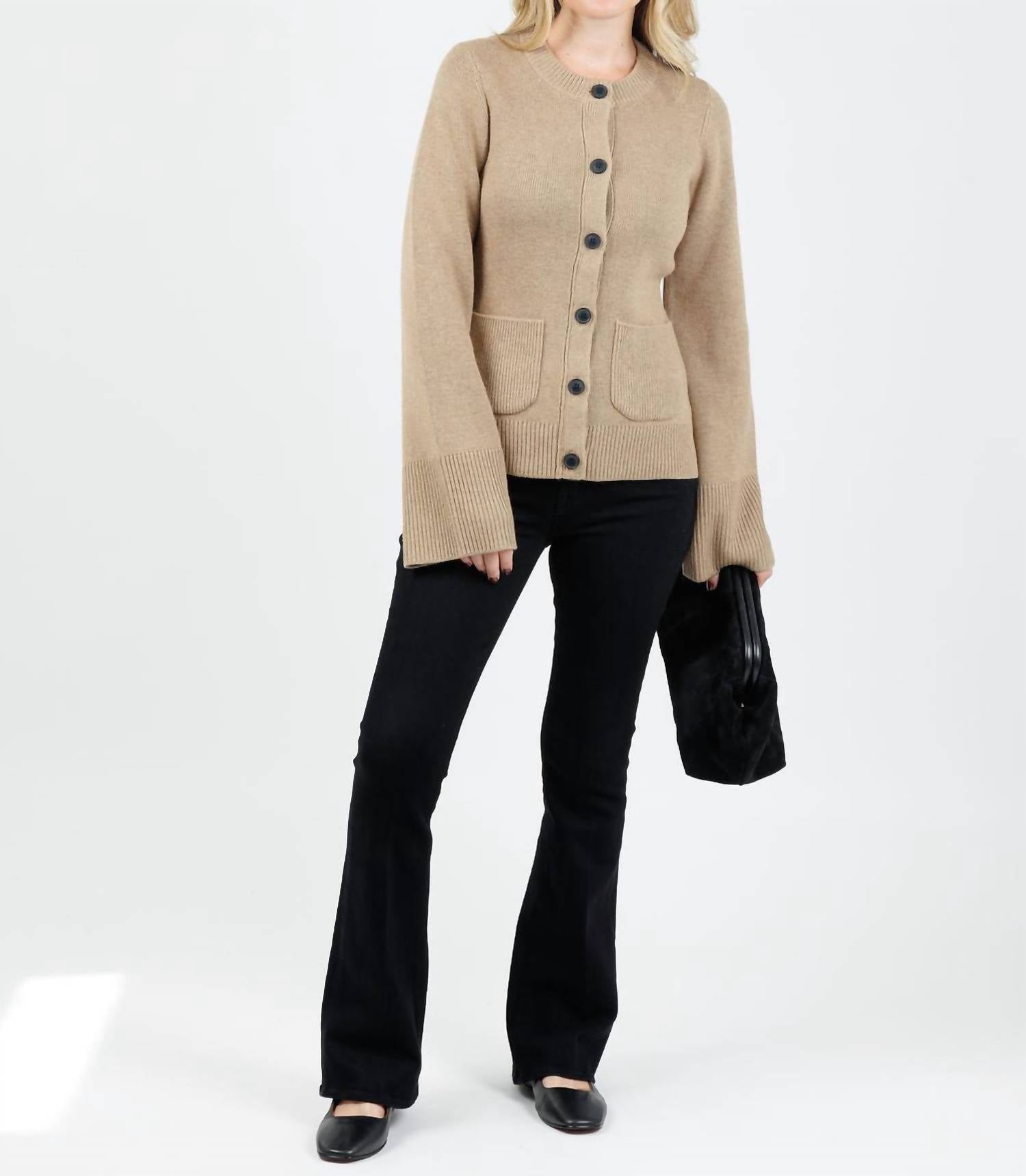 Throw this adorable cardigan over any cami or tank top. Stay effortlessly stylish with the Dani Sweater Cardigan by PISTOLA in Toasted Wheat, a perfect choice for the fall season or a holiday party. This medium-weight cardigan features long sleeves, a flattering cinched waist, and a crew neckline, all woven into a chic solid pattern. Its composition includes 35% Nylon, 30% Wool, 30% Cotton, and 5% Cashmere, ensuring both comfort and warmth. Closure: Button front closures make it ideal for versatile layering. Length measures 23". Model is wearing a size Small.