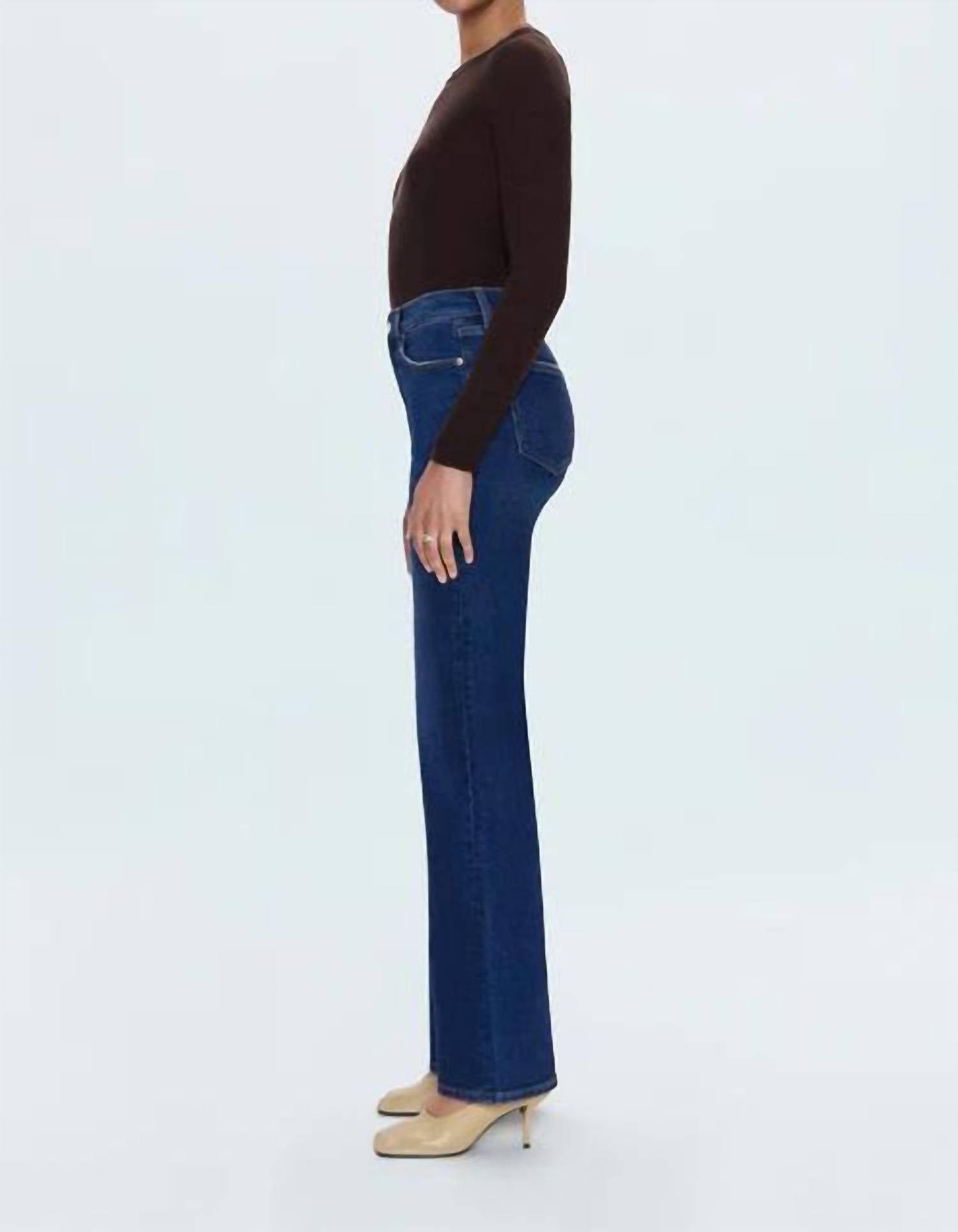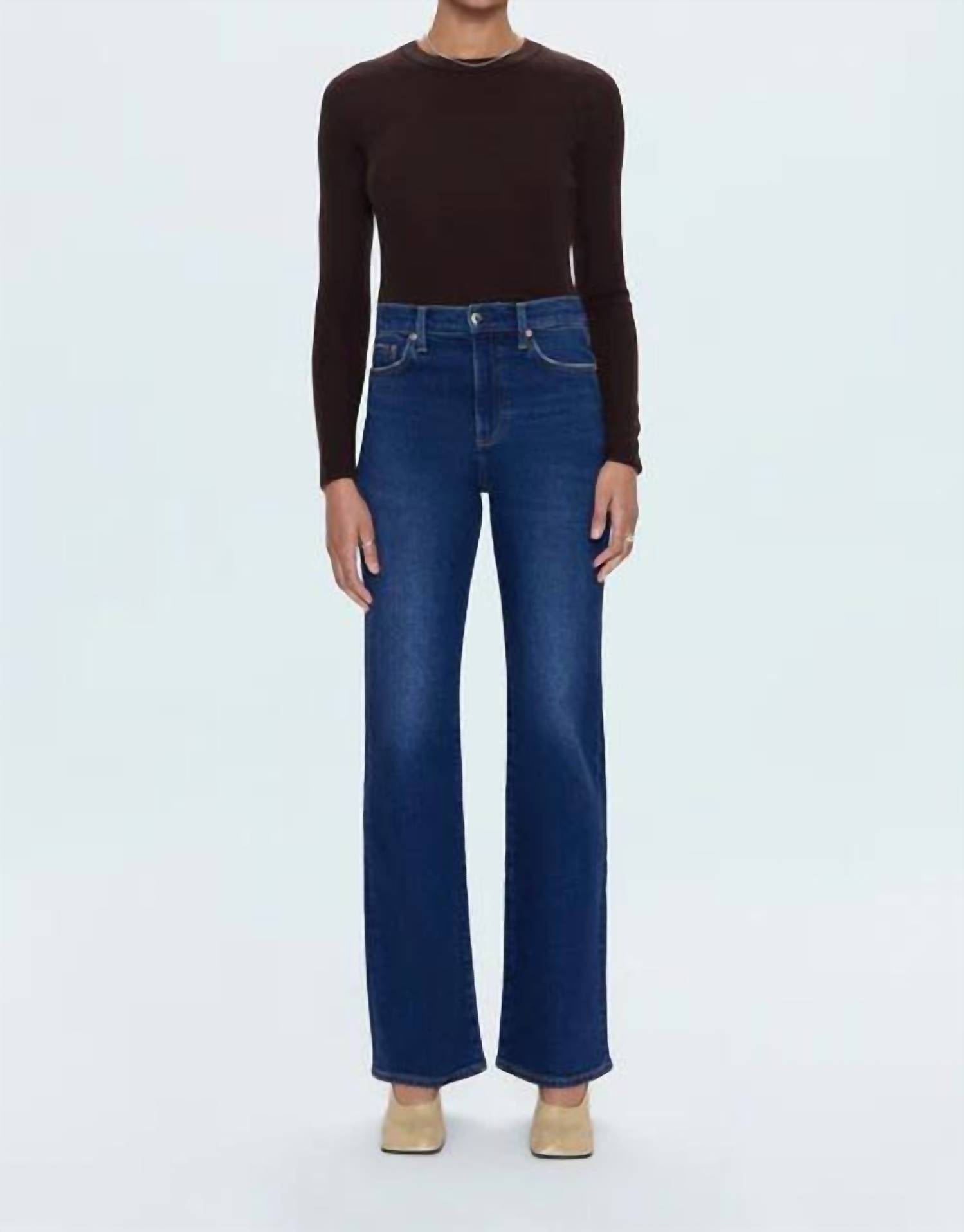 Pair these wide leg jeans with mules, slides or your favorite strappy sandals. Elevate your wardrobe with the Evie High Rise Slim Boot by PISTOLA, a statement piece designed to flatter every frame. These jeans feature a high rise with a slim fit through the hips and thighs, transitioning into a subtle bootcut leg style for long, lean lines. Crafted from a comfortable cotton blend, 99% cotton and 1% spandex, in a dark indigo wash named Penthouse, the jeans are tailored to create depth and sophistication. A full-length 33" inseam pairs effortlessly with heels or boots, while the zip closure ensures a perfect fit for those special holiday parties.