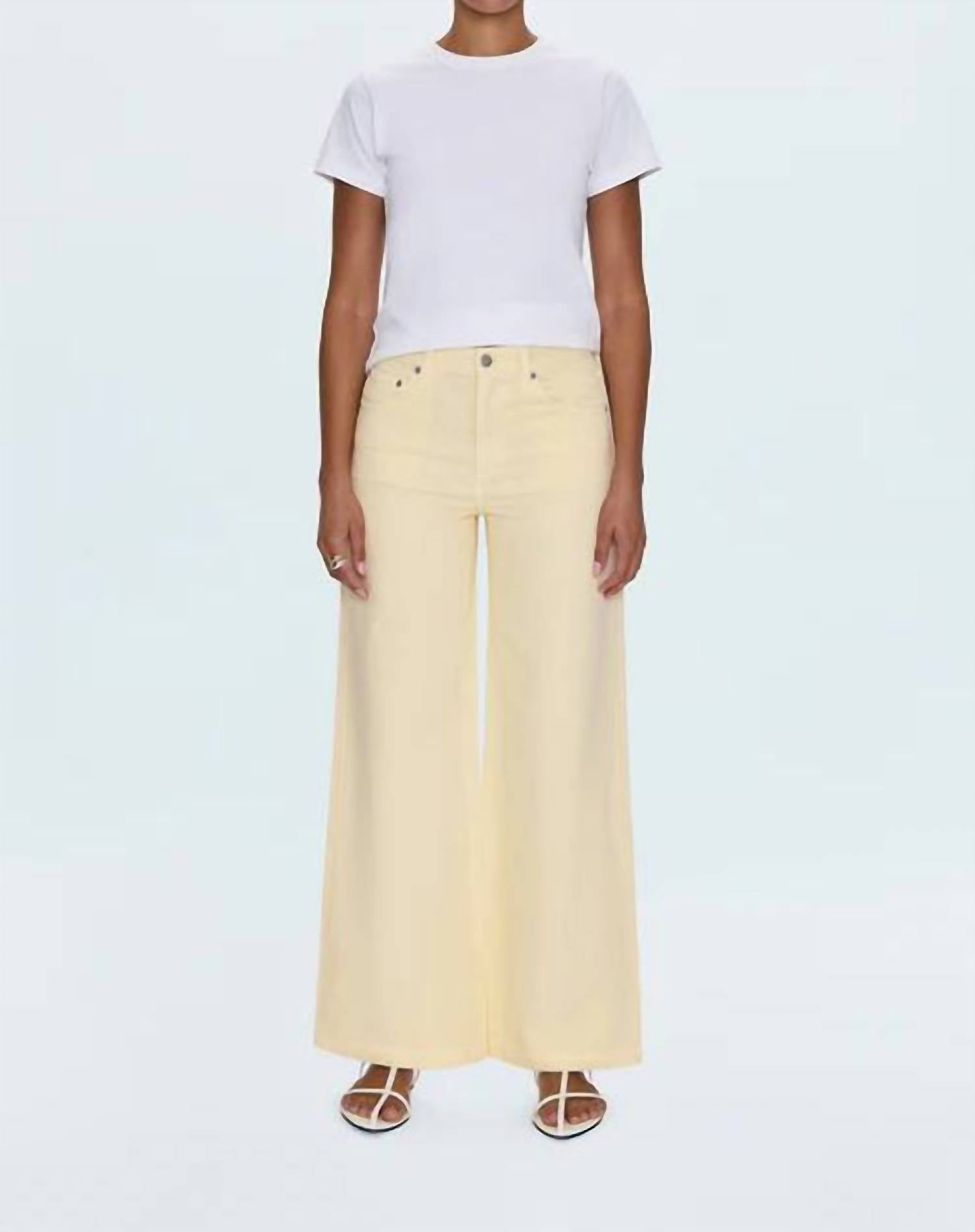 A flattering silhouette that's suprisingly versatile. Meet the Jadyn Low Slung Palazzo Jeans by PISTOLA, a streetwear-inspired staple in a refreshing Lemonade hue. These wide-leg jeans feature a relaxed fit and a low-rise waist, designed to sit comfortably on the hips. Crafted in a cotton blend composed of 62% Cotton and 38% Cotton Lyocell, they offer a lightweight feel with a solid pattern. The button closure ensures a secure fit, while convenience is maintained with pockets; care is simple with machine wash instructions.