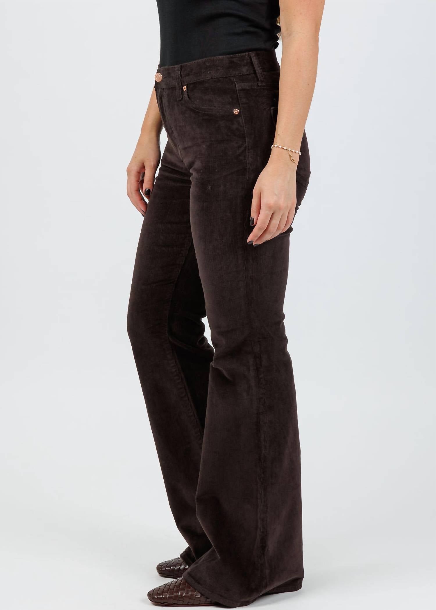 A flattering silhouette that's suprisingly versatile. Elevate your wardrobe with PISTOLA's Kinsley Mid Rise Ultra Flare Jeans in a striking Mocha hue. These jeans boast a mid-rise waist and an ultra-flared leg, enhancing your silhouette with a flattering fit and dramatic movement. Crafted from a cotton blend with 2% spandex, they offer excellent stretch and comfort throughout the day. Closure: Zip closure. Ideal for holiday parties, these jeans will add a touch of sophistication to any outfit.