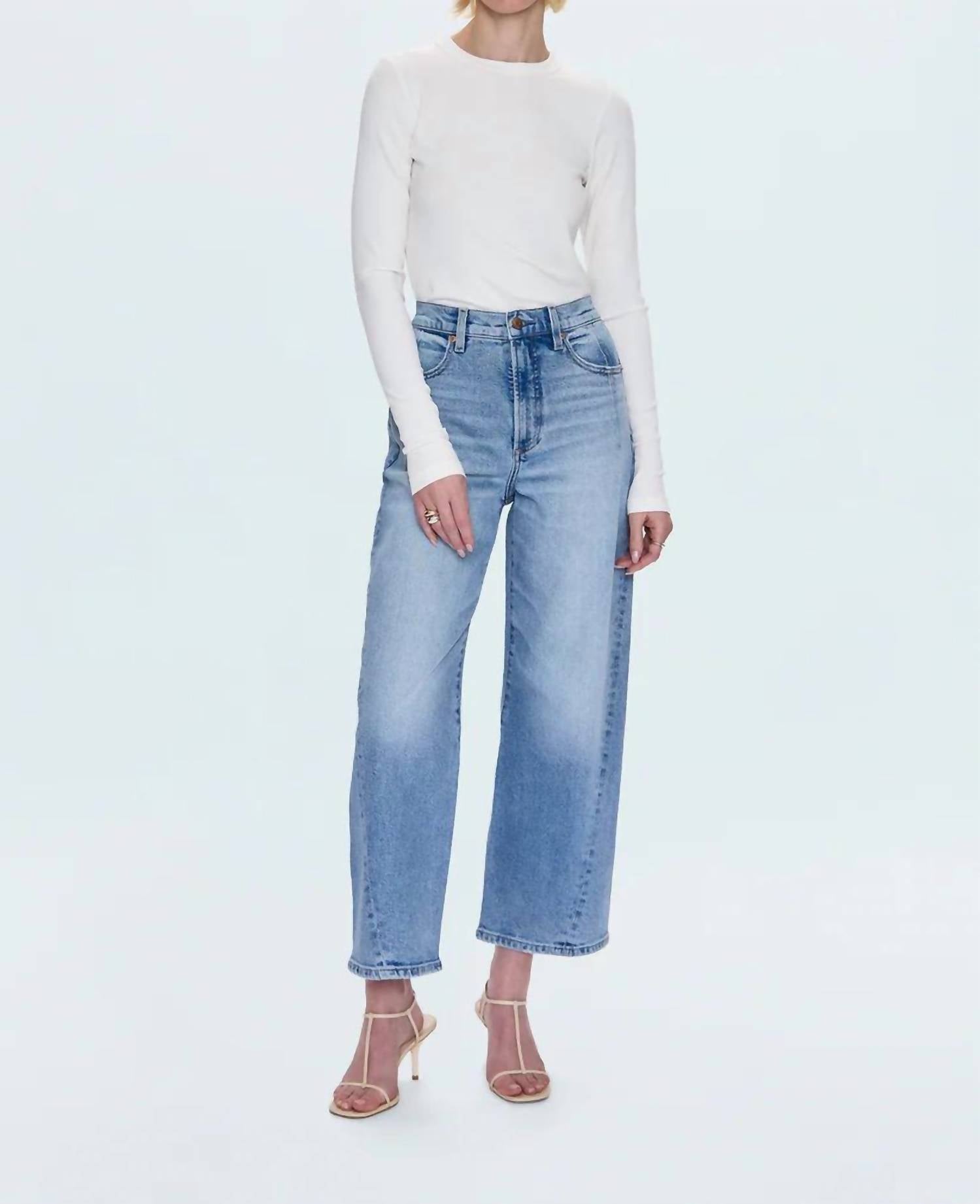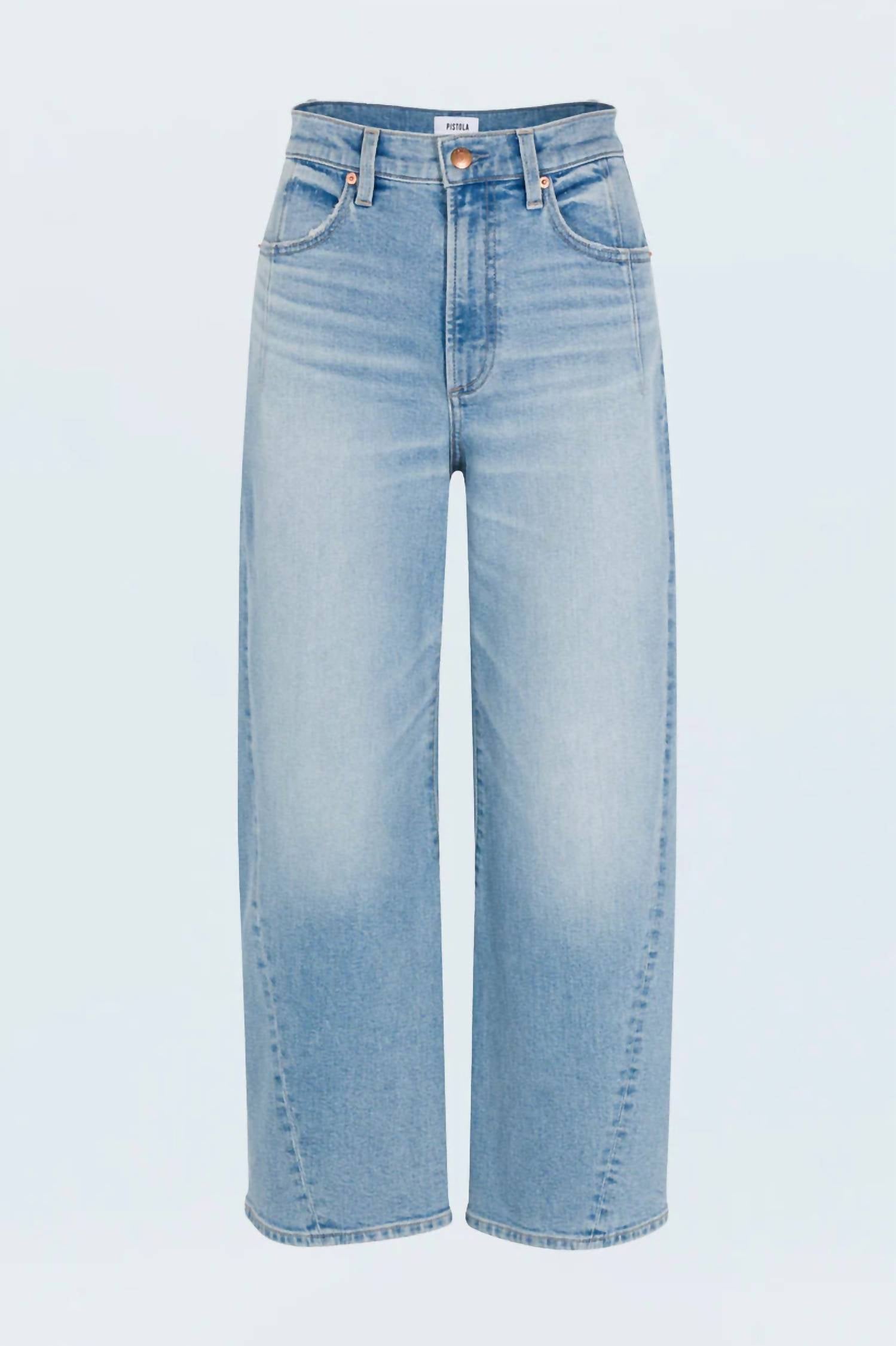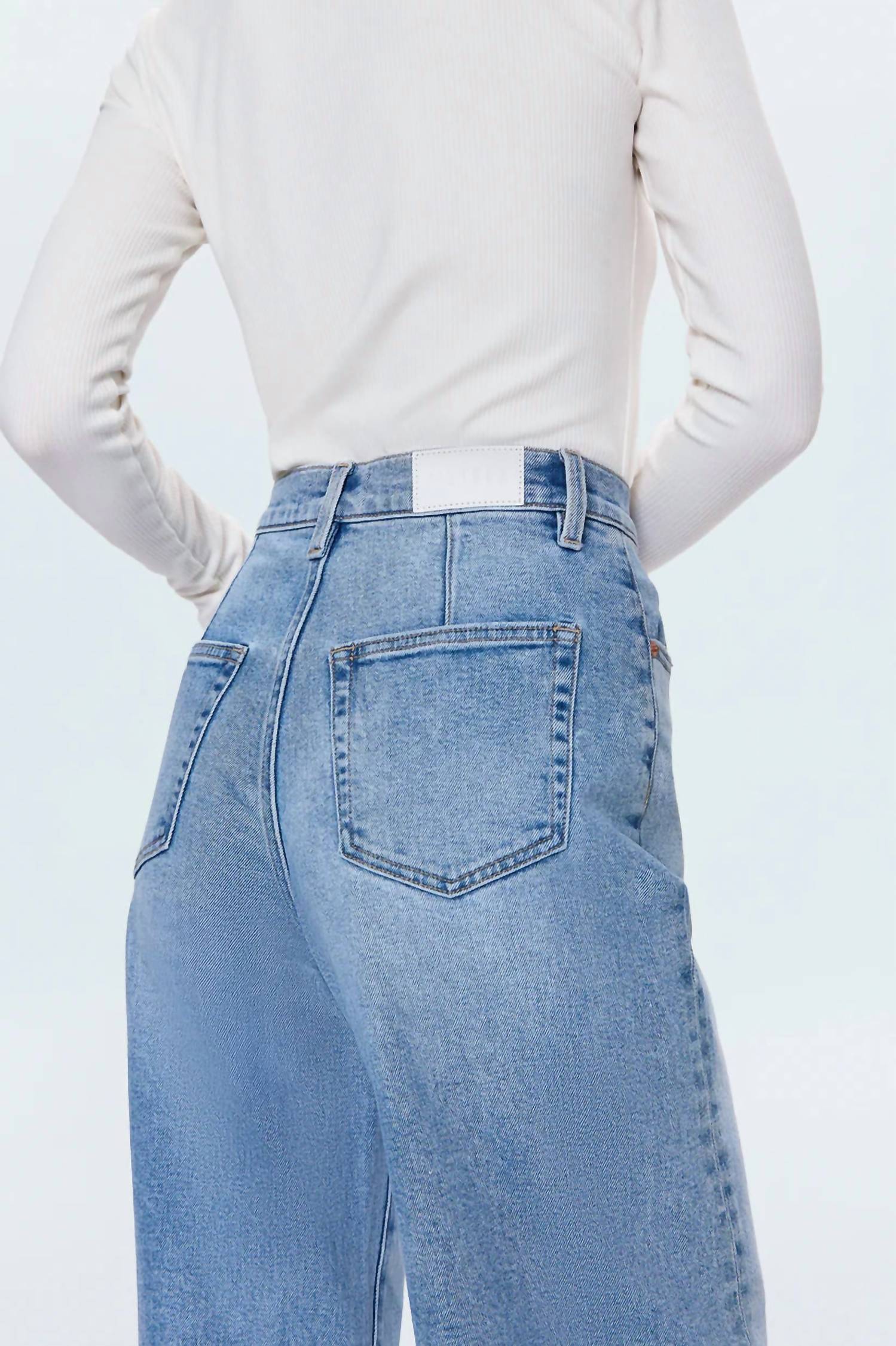 We especially love this cropped jean with a cute pair of slides or sandals. Introducing the Kyra High Rise Bowed Ankle Jeans by PISTOLA, crafted from a cotton blend with 99% cotton and 1% spandex for comfortable stretch. These high rise jeans feature a 12" rise and a wide leg style with a modern 28" cropped inseam. The denim comes in a light wash for that timeless vintage-inspired look, perfect for summer streetwear. Easily fastened with a button closure, these jeans offer a regular fit and can be machine washed and tumble dried for effortless maintenance.