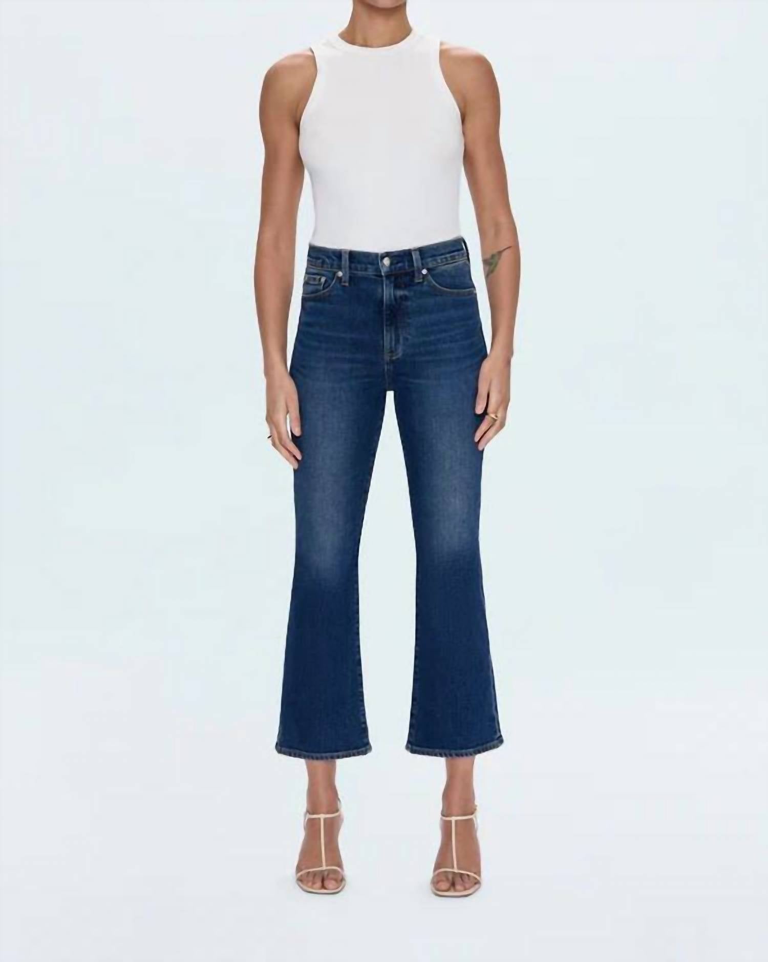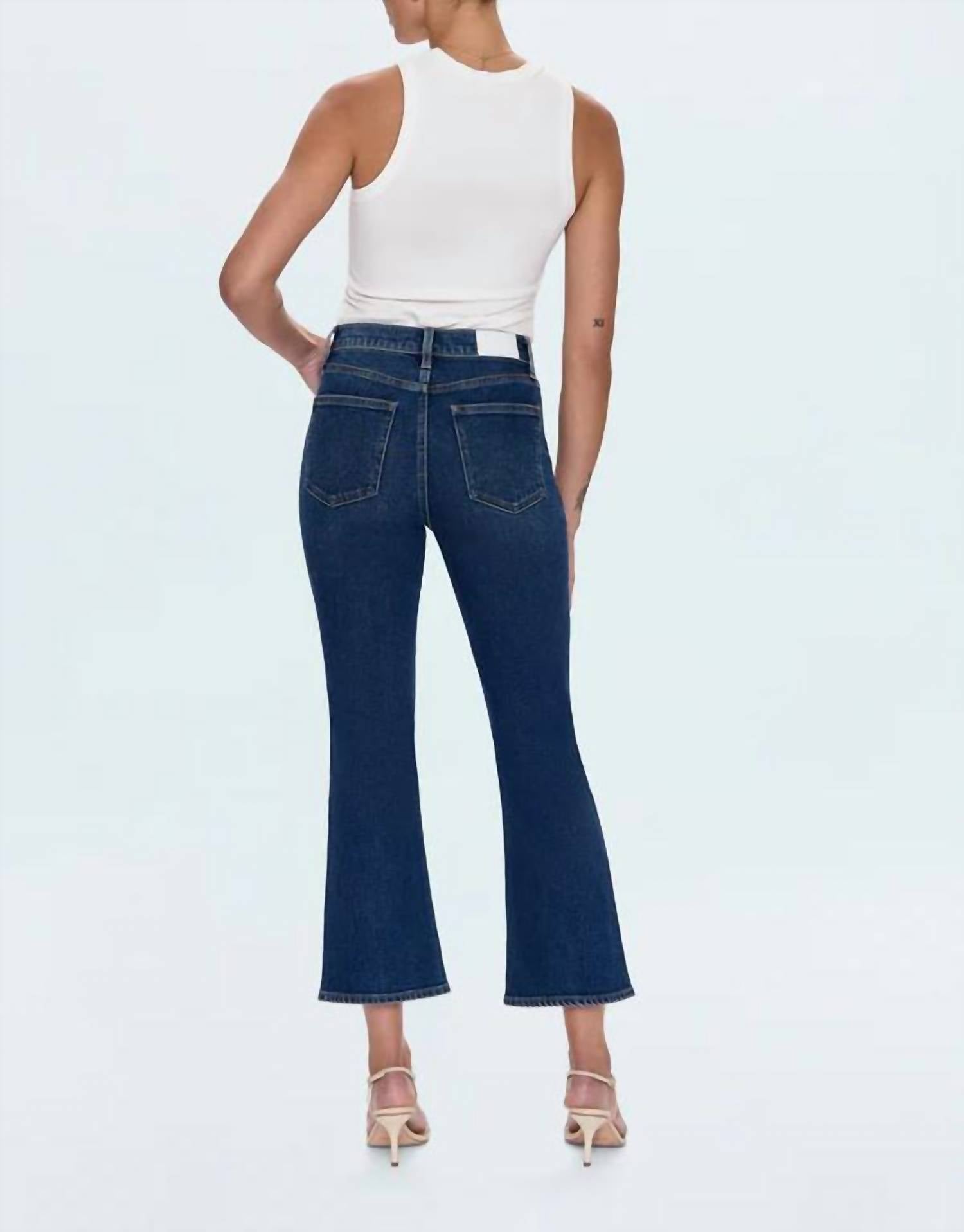 Comfortable and stylish, we love this cropped jean for all of the obvious reasons. Introducing the PISTOLA Lennon High Rise Boot Jeans in a sophisticated Broadway dark wash, perfect for creating a flattering silhouette. These jeans feature a high rise and slim-to-the-body fit that transitions into a cropped, bootcut leg with a versatile 27" inseam. They are crafted from a 99% Cotton and 1% Spandex blend, ensuring a high stretch fit that maintains its shape. Closure: Zip closure. Ideal for any shoe and occasion, whether you're heading to a holiday party or stepping out in spring. Model is 5’9” wearing size 26, with a rise of 11" and a leg opening of 16 1/2".