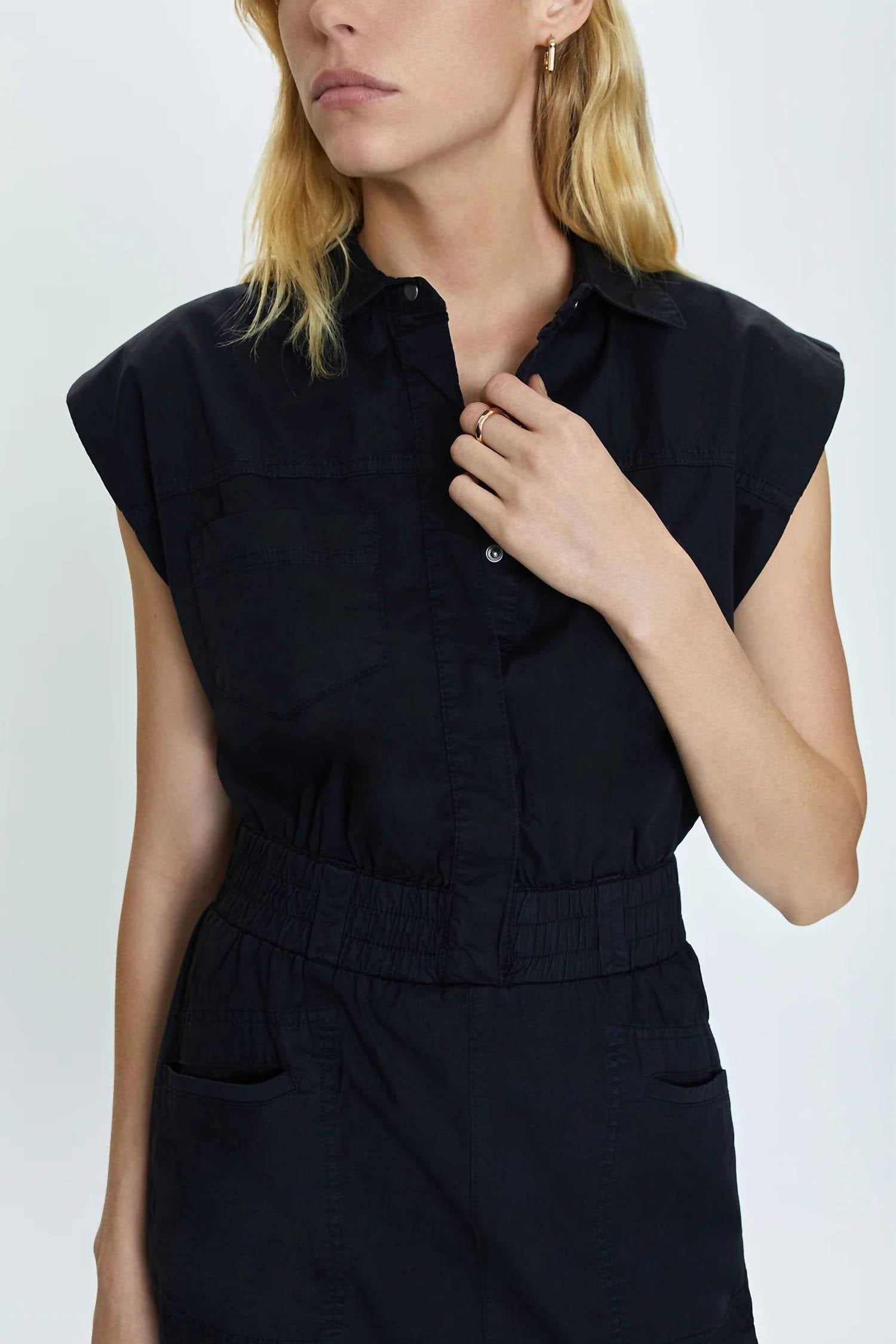 The perfect mini dress for those warmer months. Introducing the Rosie Mini Dress by PISTOLA, a chic streetwear staple perfect for your next dinner party. This sleeveless sheath dress is made from a lightweight stretch twill, featuring a cotton blend composition of 98% Cotton and 2% Spandex. It is designed with slight shoulder pads for added structure, smocking along the waist for a flattering fit, and practical pockets. With a 34" length and button closure, this solid black mini dress is ideal for summer gatherings. Care is easy with a machine wash cold, making it both stylish and low maintenance.