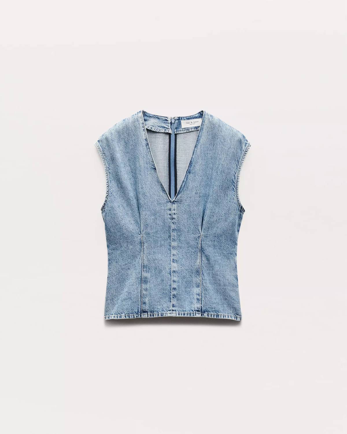 Fit, fabric and functionality. This tank top checks all the boxes. Sleeveless tank in the versatile Tilden hue, perfect for warm-weather occasions. Crafted from a lightweight blend of 60% cotton and 40% lyocell. Features a V-neck and chic denim detailing. Closure is achieved with a zip and hook & eye, and this overseas garment offers the convenience of machine washing and tumble drying. With its sculptural V-shaped profile and fitted waist, the light indigo wash denim promises an ultra-featherweight, airy drape ideal for any summer day.