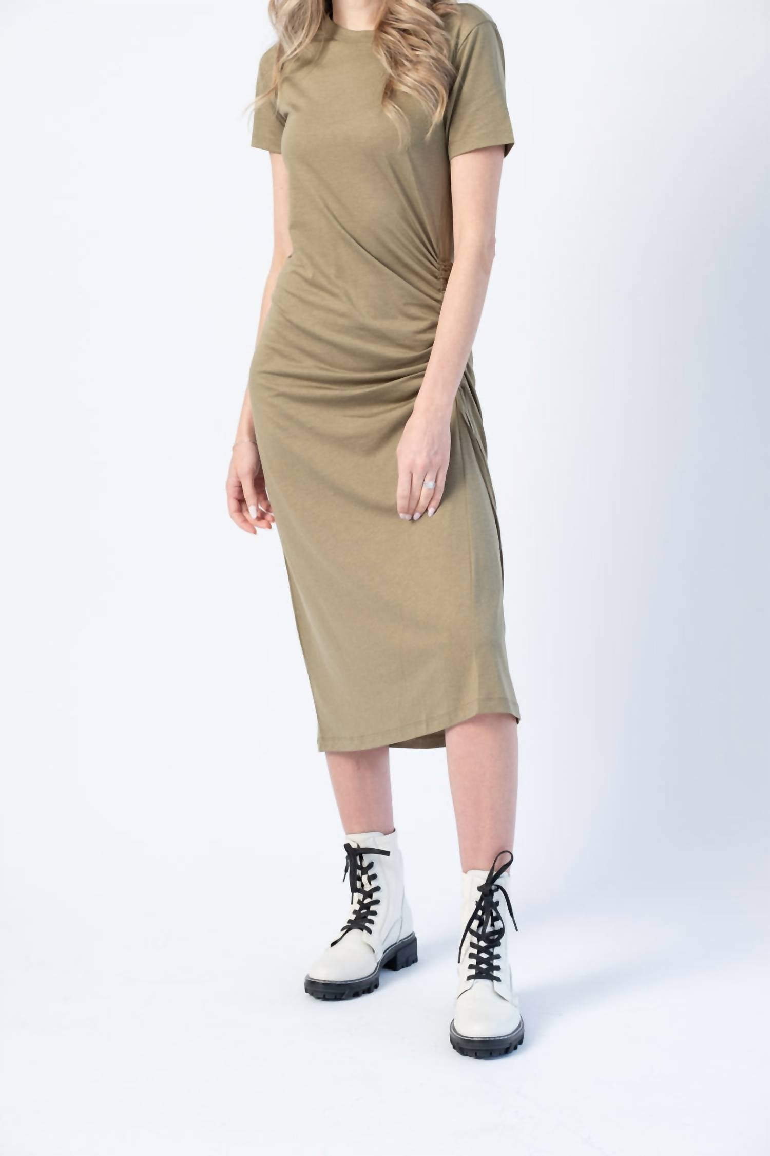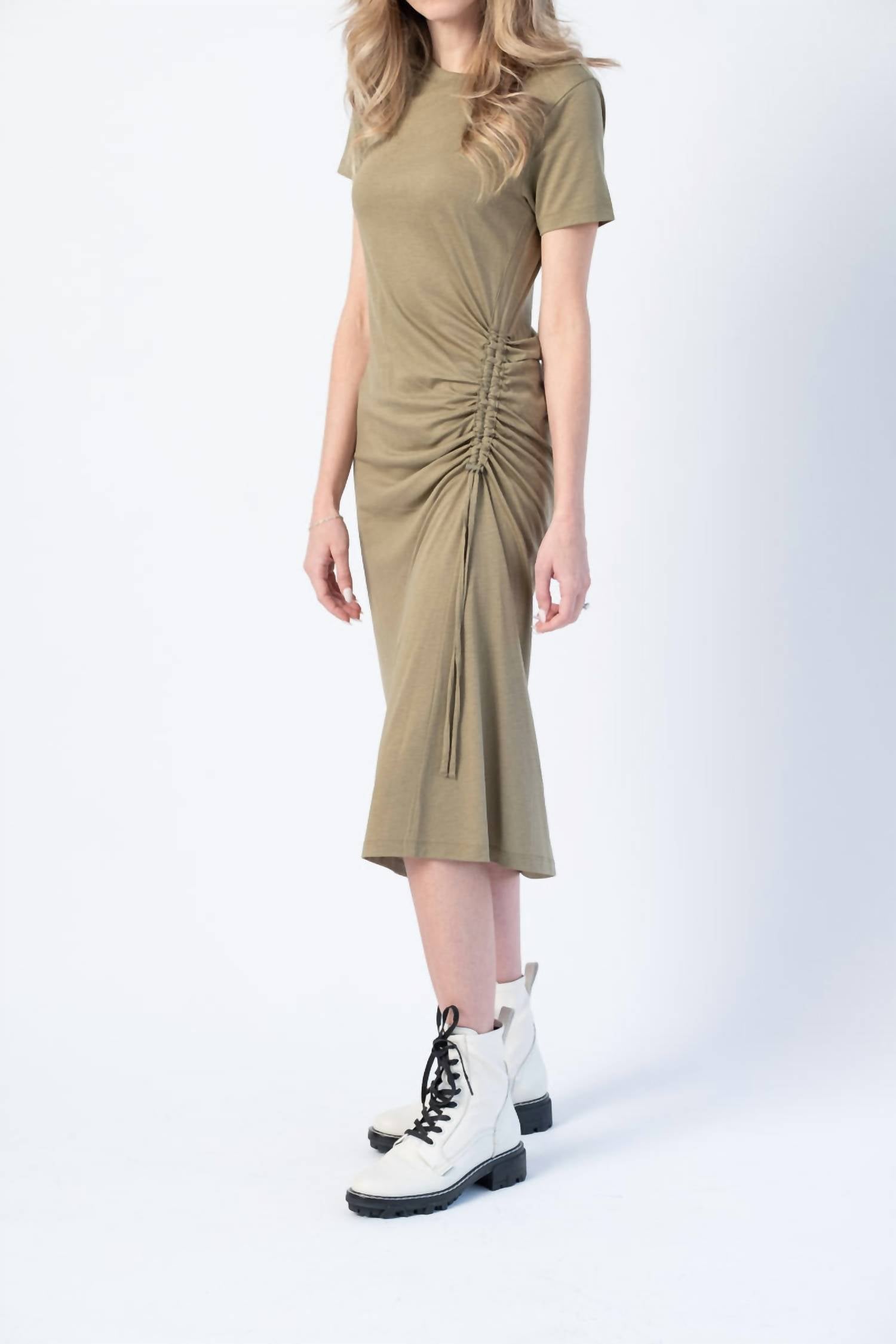 The perfect length dress does exist. Experience the chic versatility of the Rag & Bone Ina Midi Dress, a minimalist bodycon silhouette in light olive, perfect for spring events. This dress boasts short sleeves and a crewneck, crafted with a soft blend of 67% Lyocell and 33% Cotton. Its unique gathering detail at the left side, complete with an adjustable drawcord, offers a customizable fit for varied occasions. Closure: Pull-on style. Care: Hand wash.