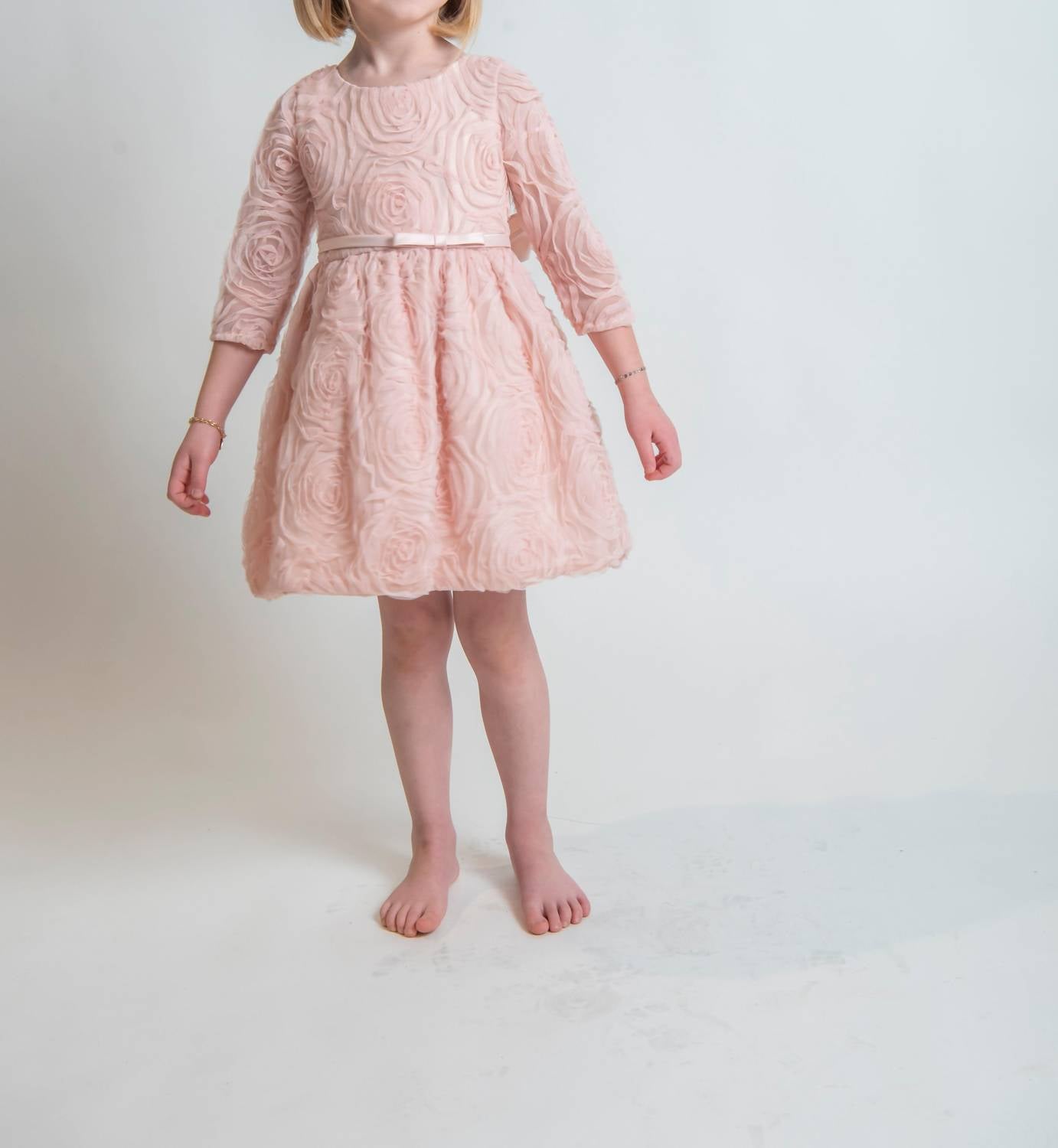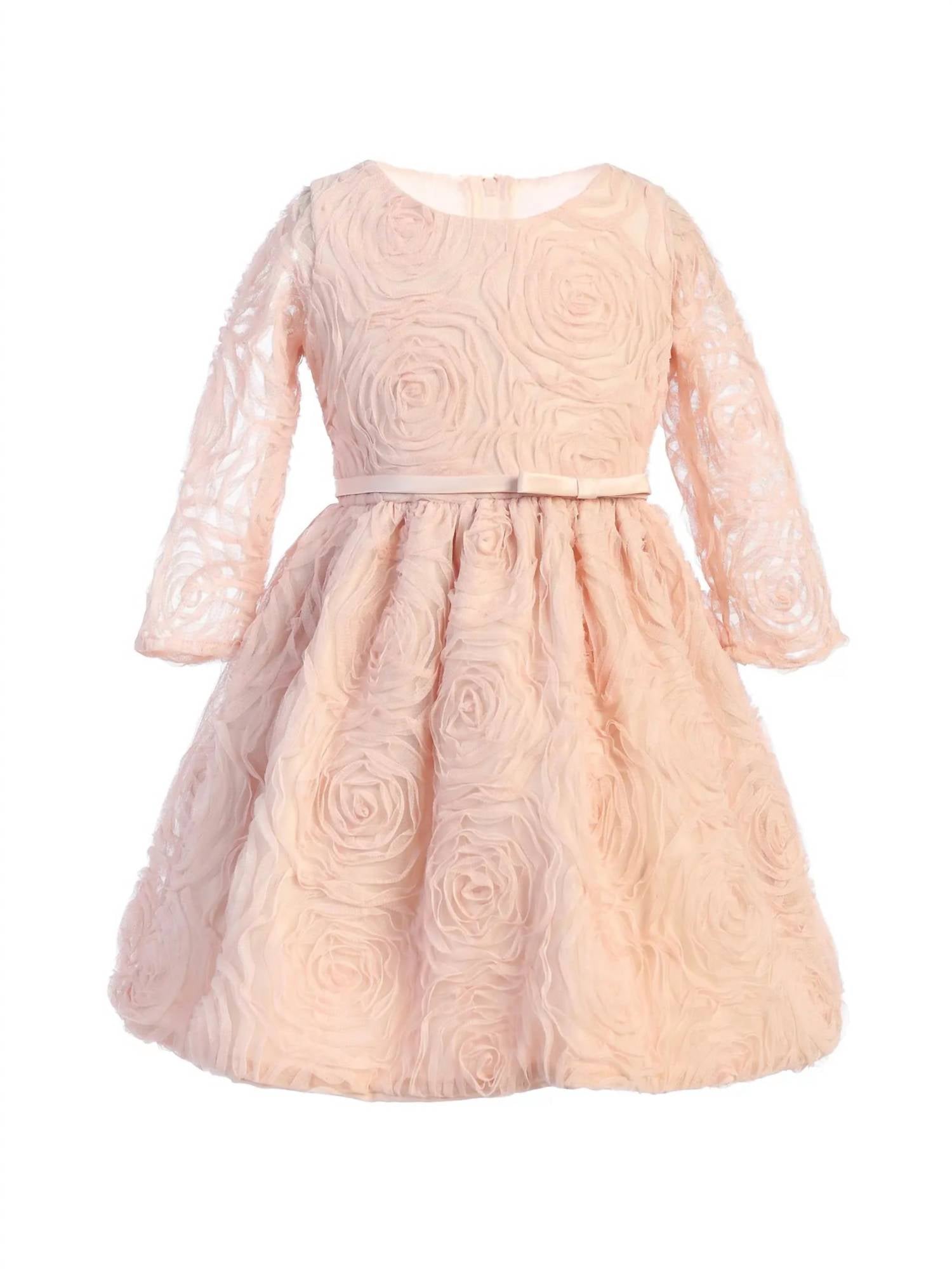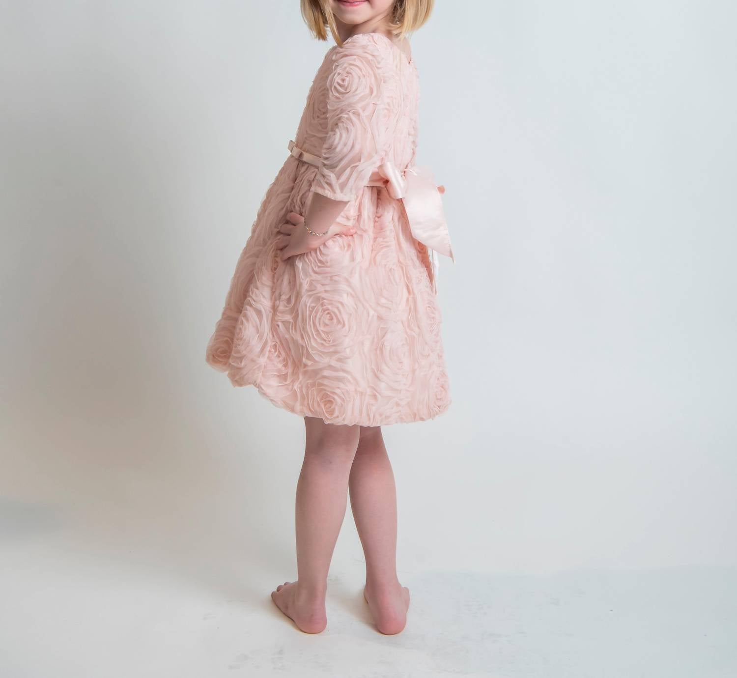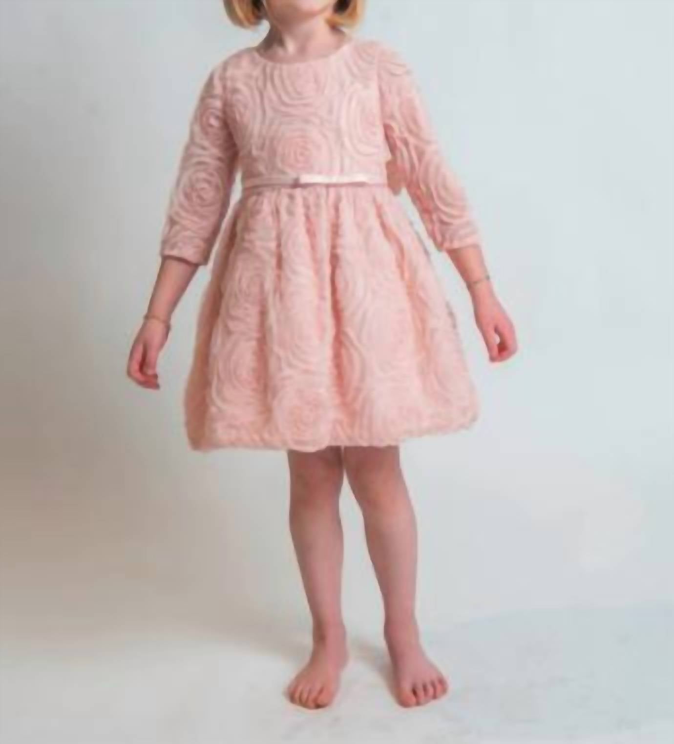 Sweet Kids - Three Quarter Sleeve Rosette Mesh Satin Dress