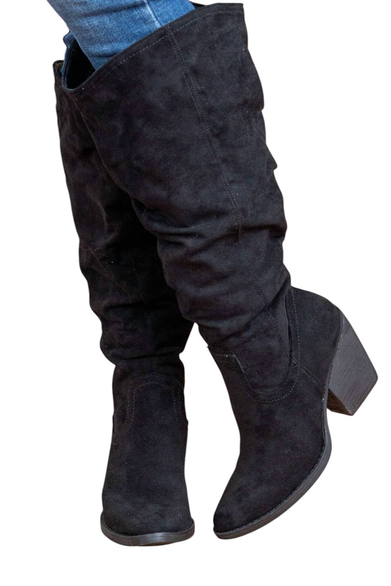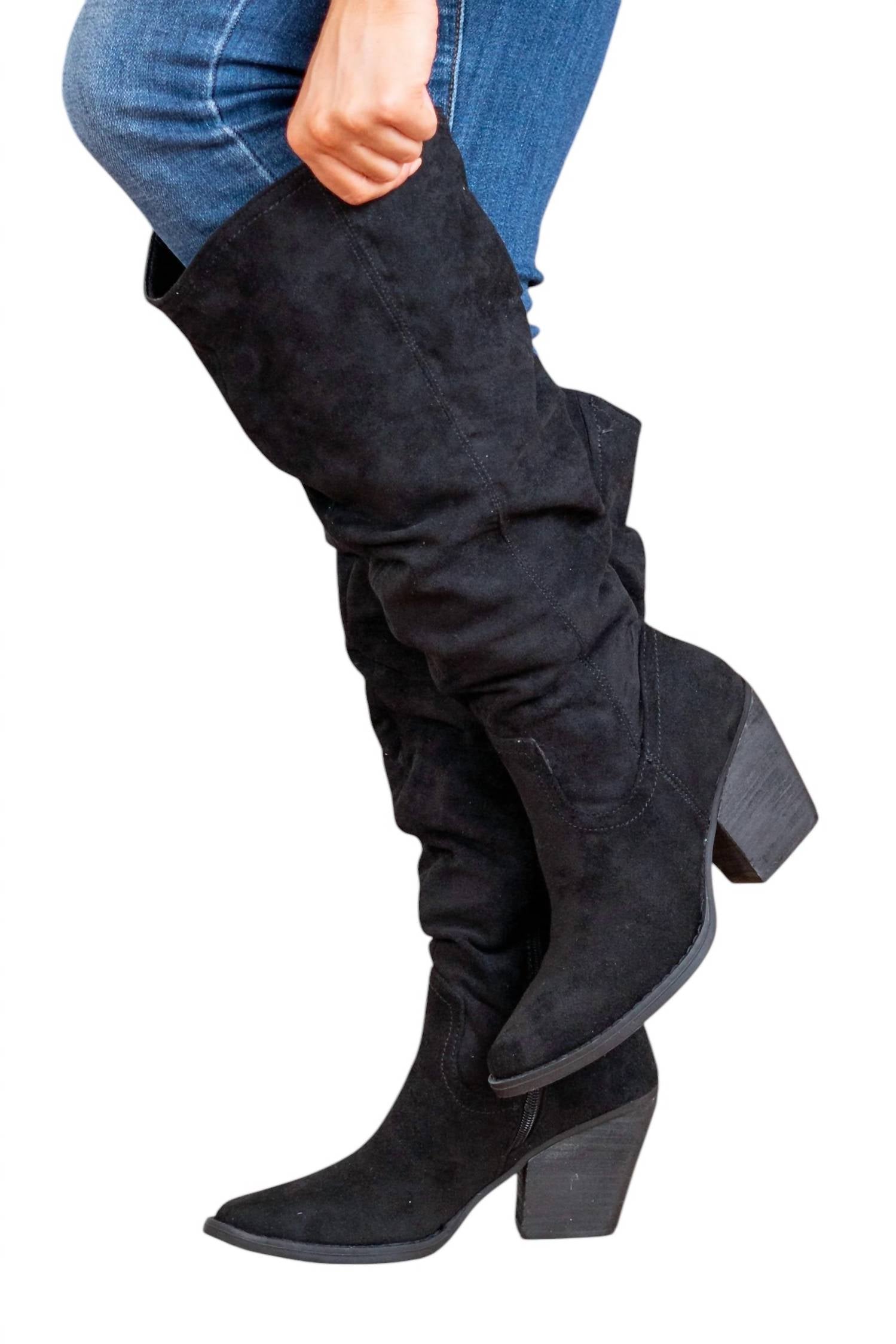 This tall boot features soft suede material with a slouchy knee-high body style and a simple stitching detail along the ankles. It has a zipper closure for easy wear and a 3.5" heel for added height.