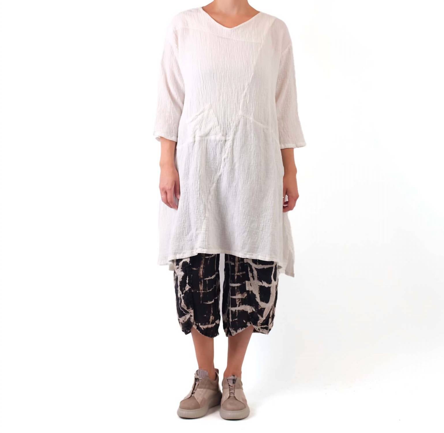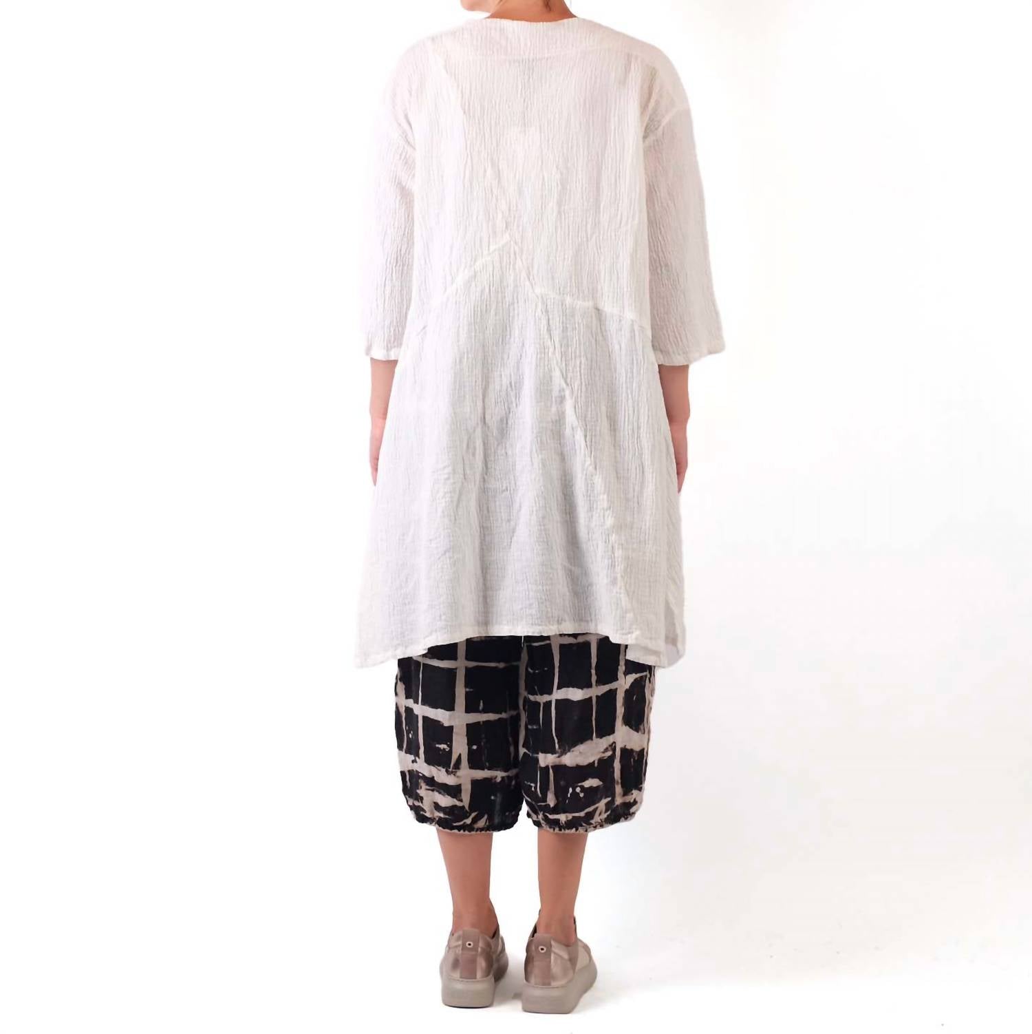 Embrace the versatility of this tunic-style blouse, expertly crafted for seamless layering or perfect to wear on its own. Its detailed design and comfortable fit make it a perfect addition to any closet. Embrace timeless style with the Lyle V-neck Tunic by Cynthia Ashby, showcasing a textured design in a natural hue. This women's tunic features a flattering V-neckline and relaxed three-quarter sleeves, crafted from a breathable blend of 52% Linen and 48% Cotton. The versatile piece offers a pull-on closure, perfect for pairing with crop pants or leggings. Available in two sizes, the tunic measures 46” bust and 36” length from shoulder to hem for Size 1, and 53” bust and 39” length for Size 2.