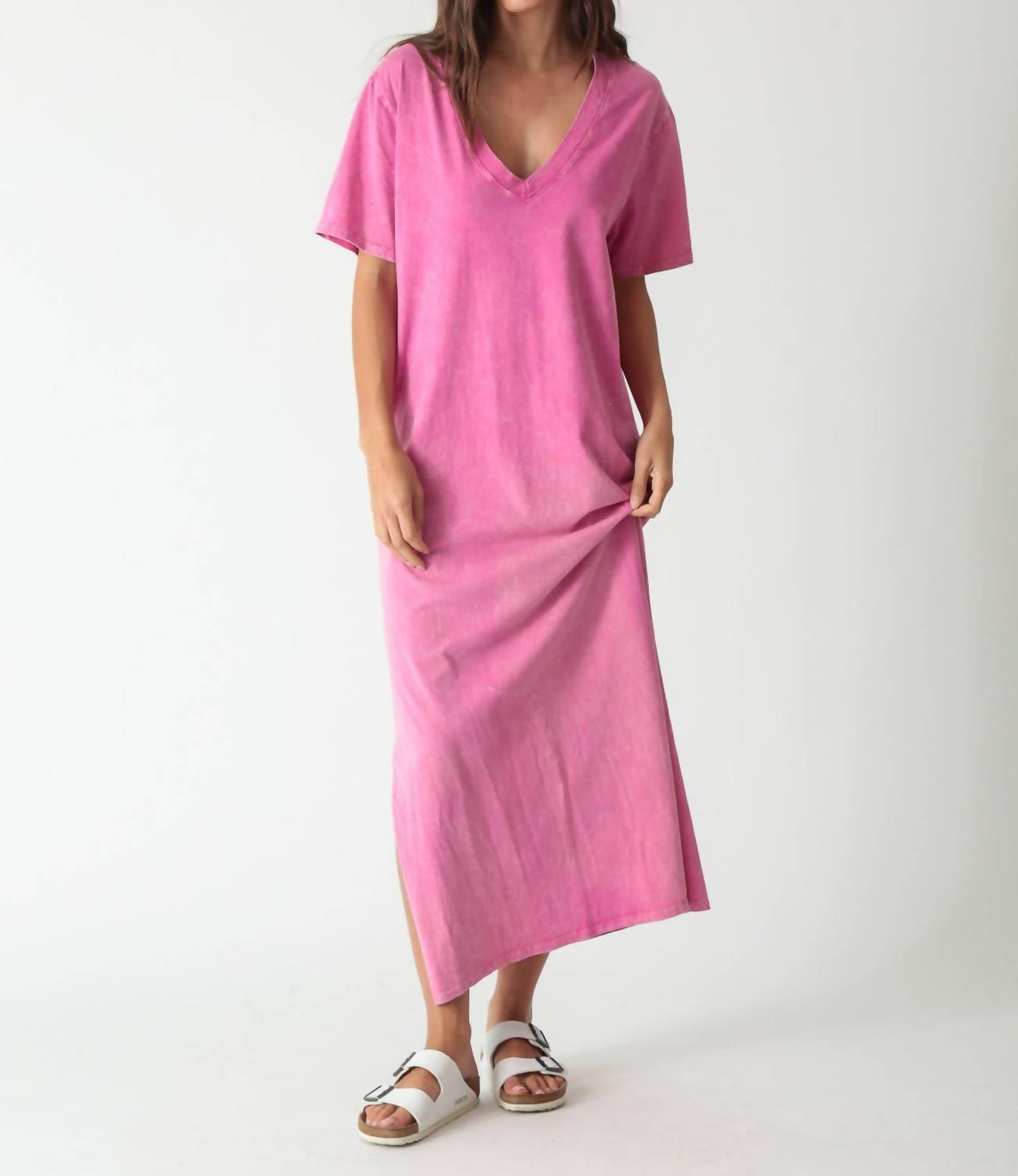 Casual, comfortable and cute! The dress that you'll be reaching for all season long. Discover the Weylan Maxi Dress by Electric & Rose, perfect for sunny days and laid-back adventures. This casual dress features short sleeves and a chic V-neck, tailored in a solid sheath silhouette. Made from breathable 100% cotton, it offers easy, pull-on wear and minimalist style, all crafted with care in the USA. Care instructions include a machine wash and tumble dry on low for convenience. Model is 5'9" and wearing a size small.