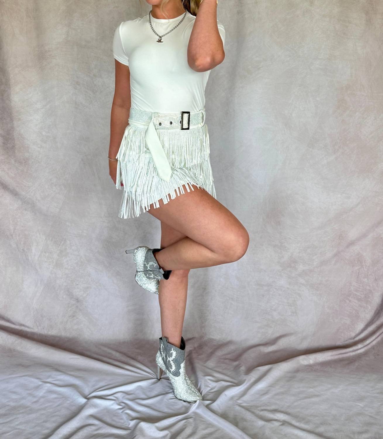 The cutest skort that combines style and functionality. Discover the Giddy Up Fringe Skort by Nylon Apparel, an ideal choice for boho chic concert looks. Crafted for a textured, Western fringe style, this skort is made of 95% polyester and 5% spandex, featuring a solid fabric lining. It offers a back zip closure and includes a belt for added flair. Please note this piece is true to size and requires special care as it should not be washed. The skort comes in a refined white color, perfect for making a statement.