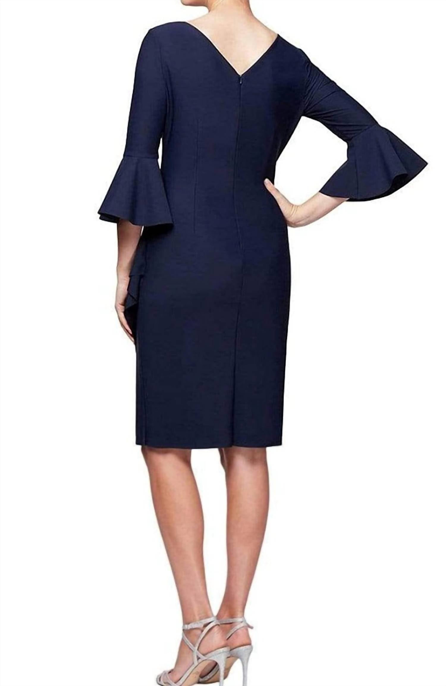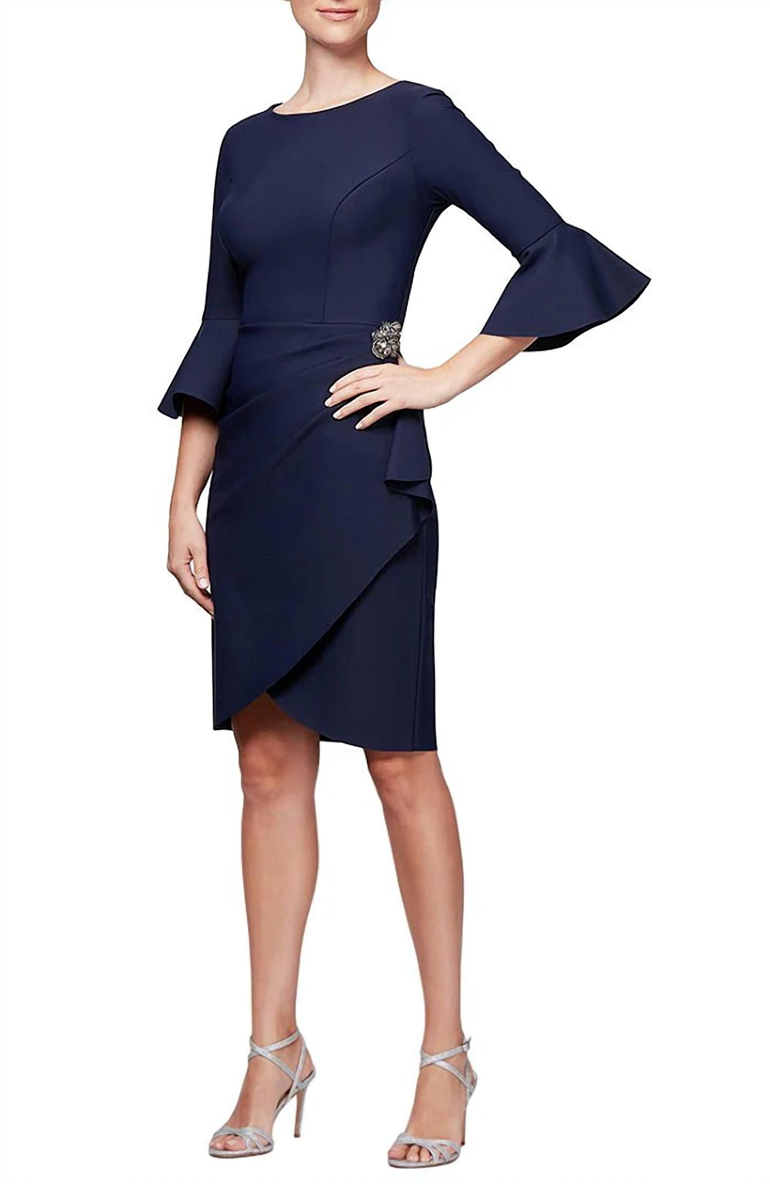 A dress you'll be reaching for season after season. Pair it with your favorite denim jacket for a more laid-back look. Elevate your evening wear with the Bell Sleeve Bateau Sheath Dress by Alex Evenings, an expressive choice for special occasions. Featuring three-quarter bell sleeves and a graceful bateau neckline, this navy dress is crafted from a blend of 78% nylon and 22% spandex for a flattering fit. Its knee-length faux-wrap skirt and V-back add sophistication, while a zip closure ensures a sleek silhouette. Care instructions recommend hand washing and laying the dress flat to dry, perfect for maintaining its stunning design.