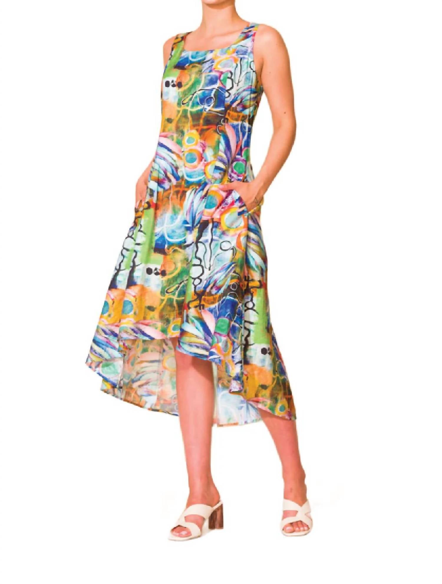 Show off just the right amount of skin in this adorable assymetrical dress. Unveil your boho chic style in a vibrant multicolor design, perfect for a spring holiday party. Asymmetrical dress features a sleeveless silhouette with a scoop neck and a convenient zip closure. Made from durable polyester. Combines a trendy patterned look with the functionality of pockets. Care for your dress with a simple hand wash to keep it looking fresh for Thanksgiving festivities.