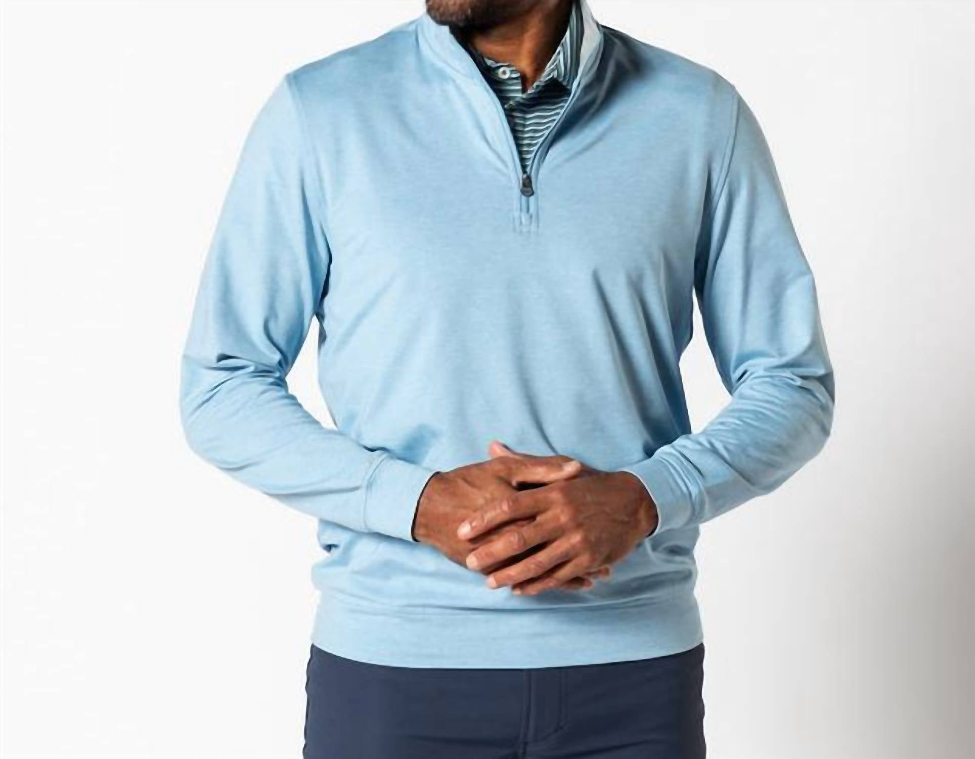 The Colton Pique 1/4-zip Sweater by DUCK HEAD is a stylish addition to any wardrobe, perfect for travel or workwear. Crafted in a light blue, this long sleeve turtleneck features a mockneck design with a convenient zip closure and showcases an embroidered logo on the back yoke. Made from 87% recycled polyester and 13% spandex in a peached mélange jersey, it includes a brushed fleece back and ensures permanent moisture wicking and odor resistance. For easy care, simply machine wash and tumble dry.