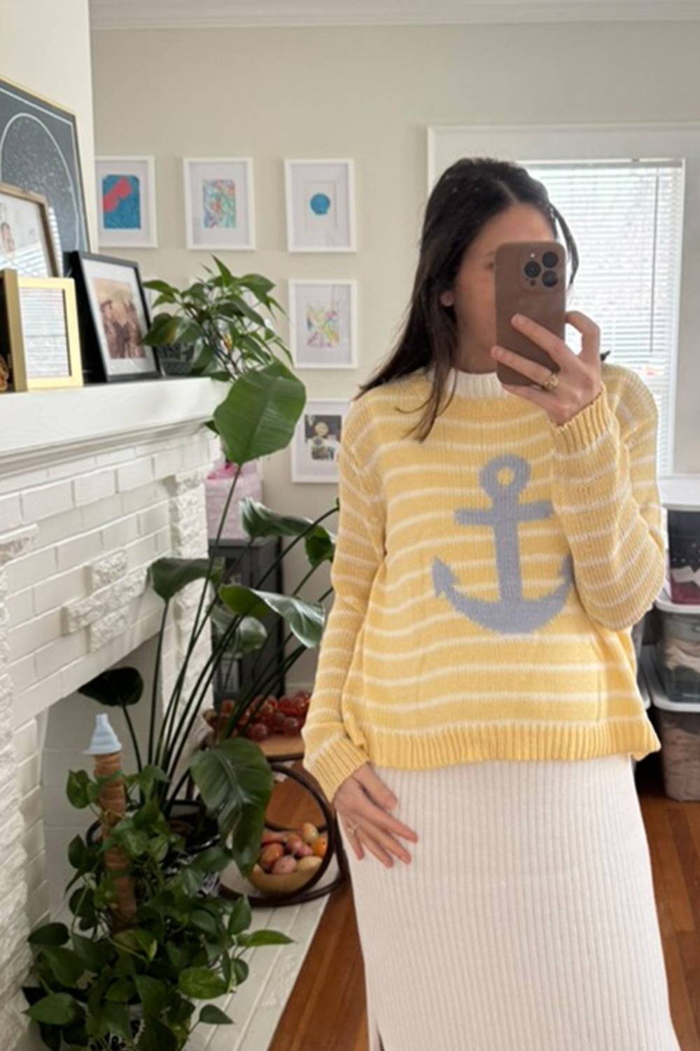 This cardigan will be a sweater-rotation favorite. Introducing the Anchor Striped Cotton Crew Sweater by Wooden Ships, an airy, lightweight knit perfect for a breezy style. This yellow beauty features long sleeves and a round crew neck, making it bra-friendly and perfect for comfort. It's made in Bali, Indonesia, and adds a breathable touch to any casual outfit. Care: Machine wash on the cold delicate cycle, ideally inside a garment bag. The model is 5'8" and is wearing a size Small/Medium.