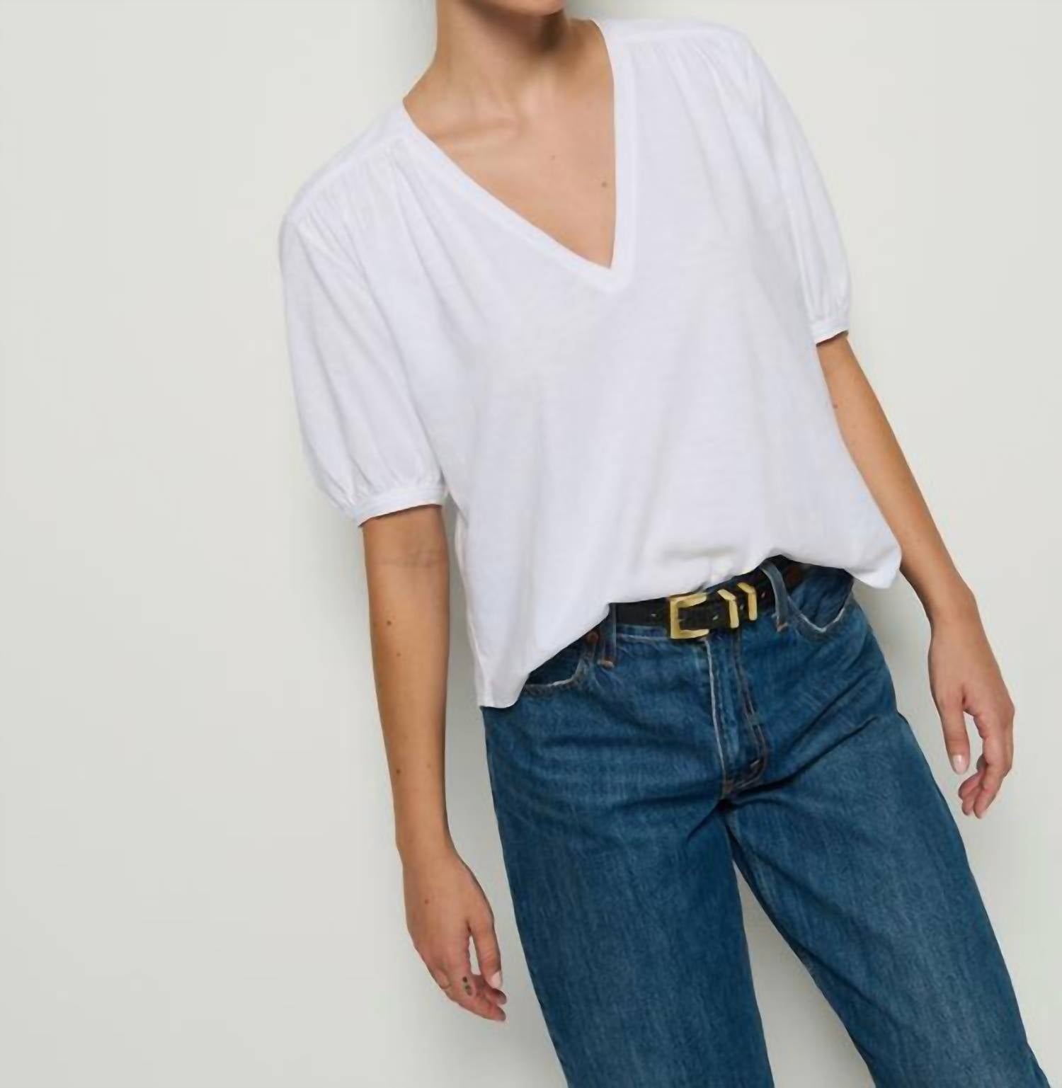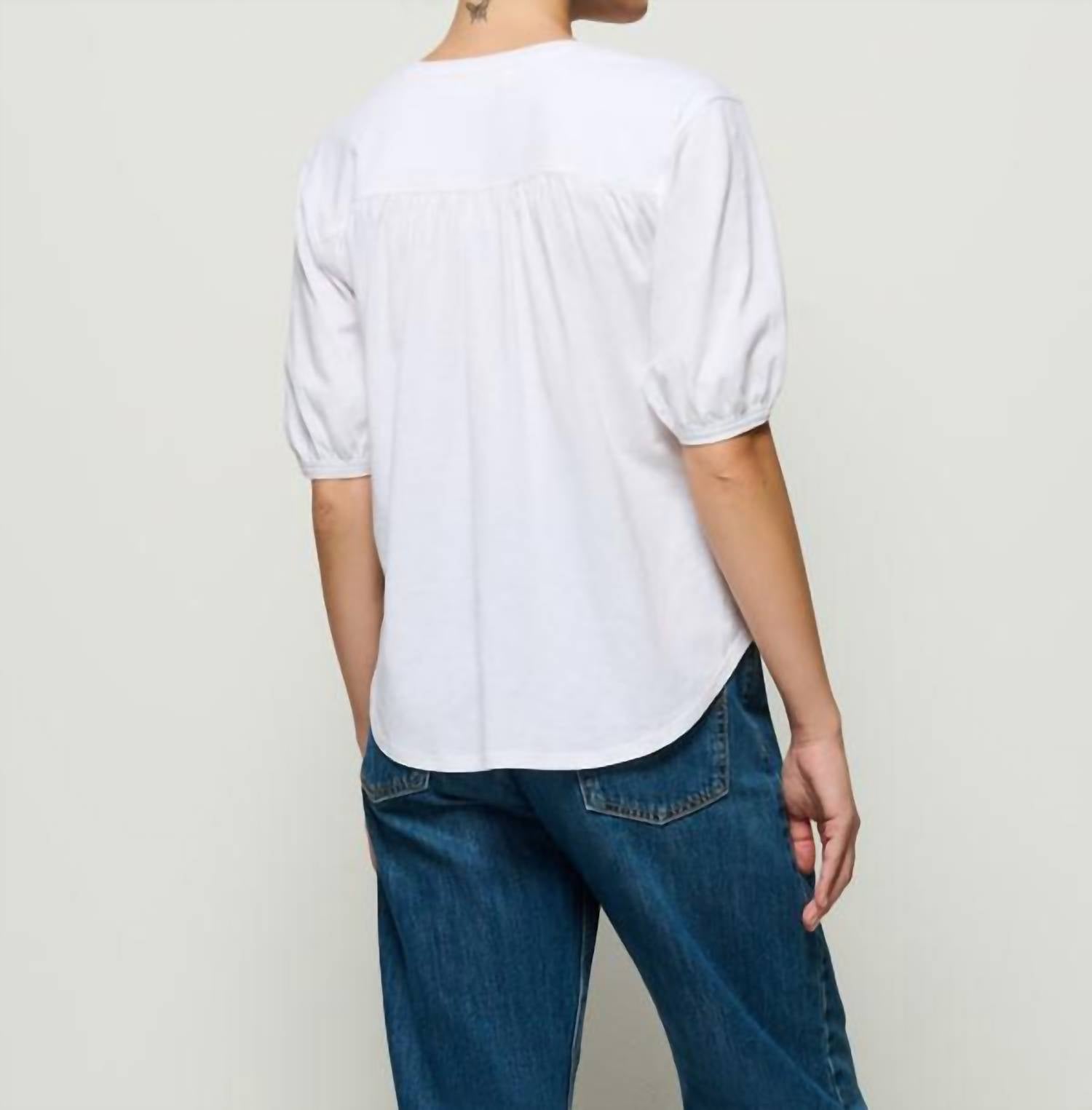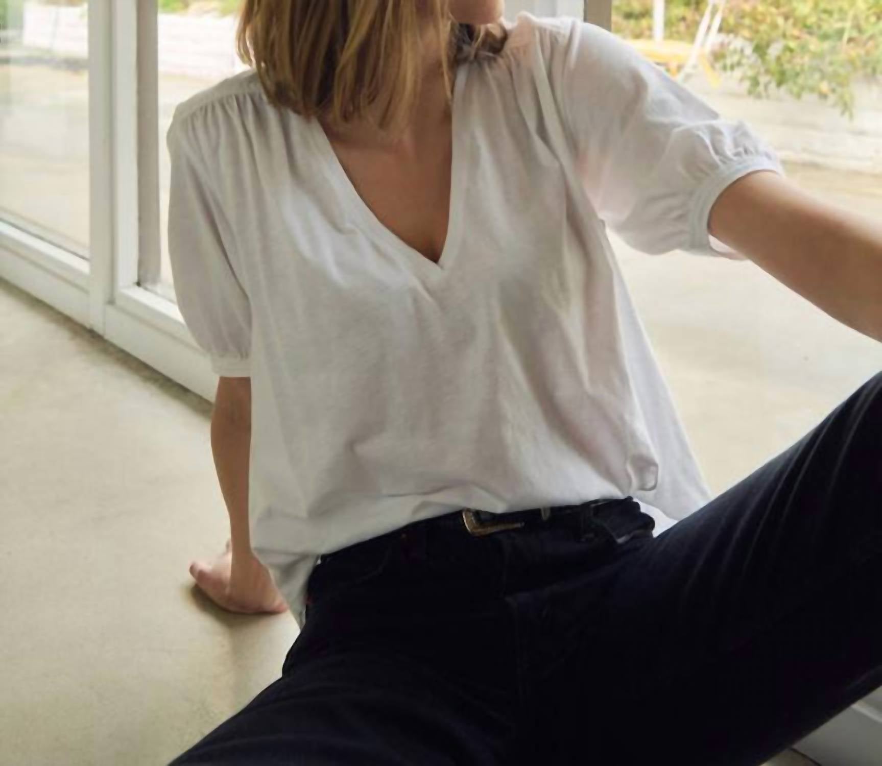 This classic, short sleeve tee will be your go-to staple this season and beyond. Introducing the Edie Top by Nation LTD, a chic and feminine piece in crisp white. This short sleeve tee features a V-neck design with shirring and smocked yoke details, complemented by shirred cuffs and a subtle balloon sleeve. Crafted from a blend of 75% Cotton and 25% Hemp, it offers a relaxed fit that's slightly roomier than traditional styles. For care, machine wash and line dry to maintain its quality and comfort.