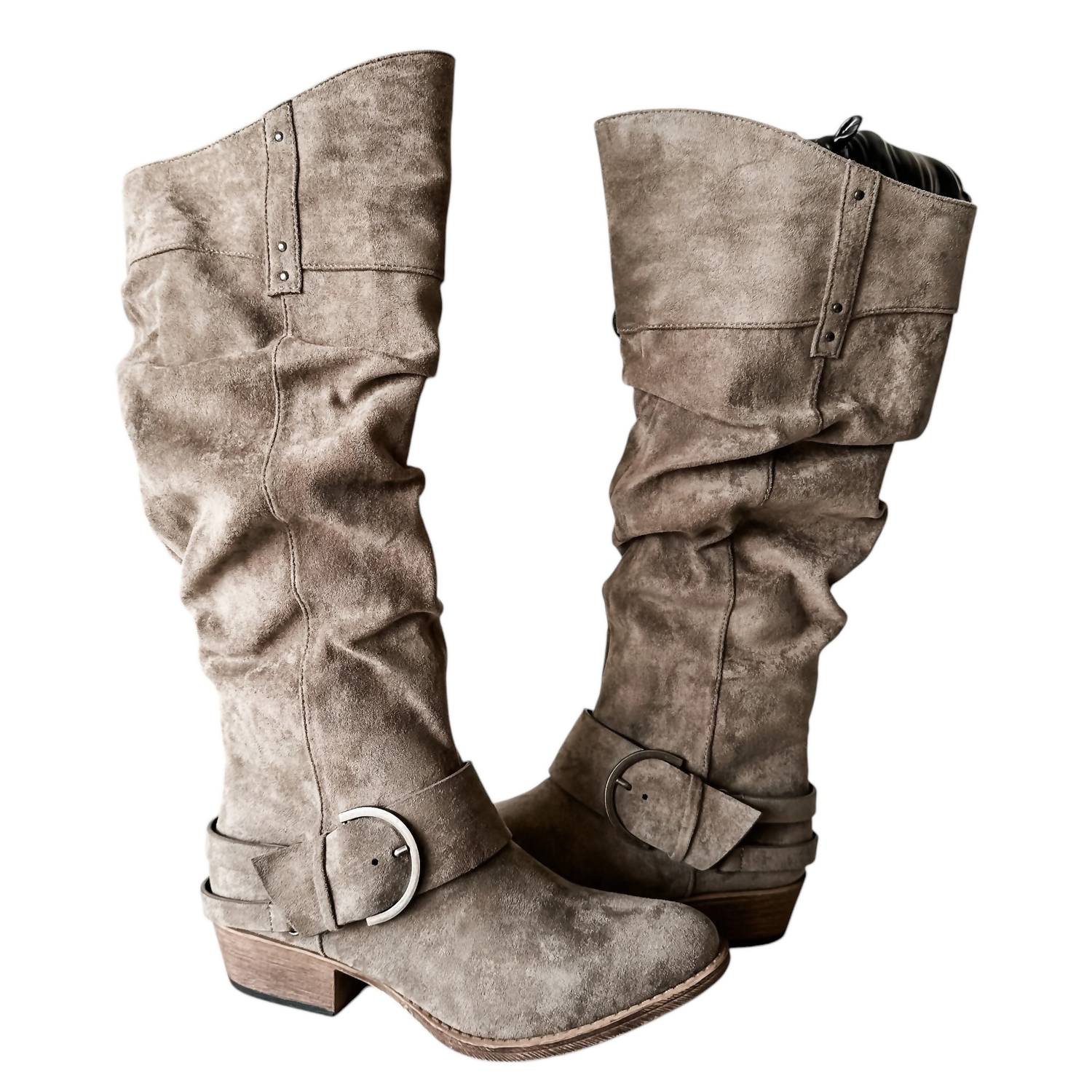 These knee-high boots feature a faux suede upper with a side zipper for easy on/off. They have an approximate 1.5-inch stacked heel and buckle strap detail for added style. Imported.