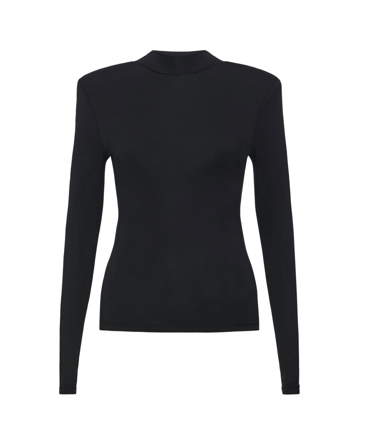 This long sleeve top features a high neckline with structured shoulder pads and fitted sleeves to the cuff. It has a center back zip. Made from 95% viscose and 5% elastane. Dry clean only.