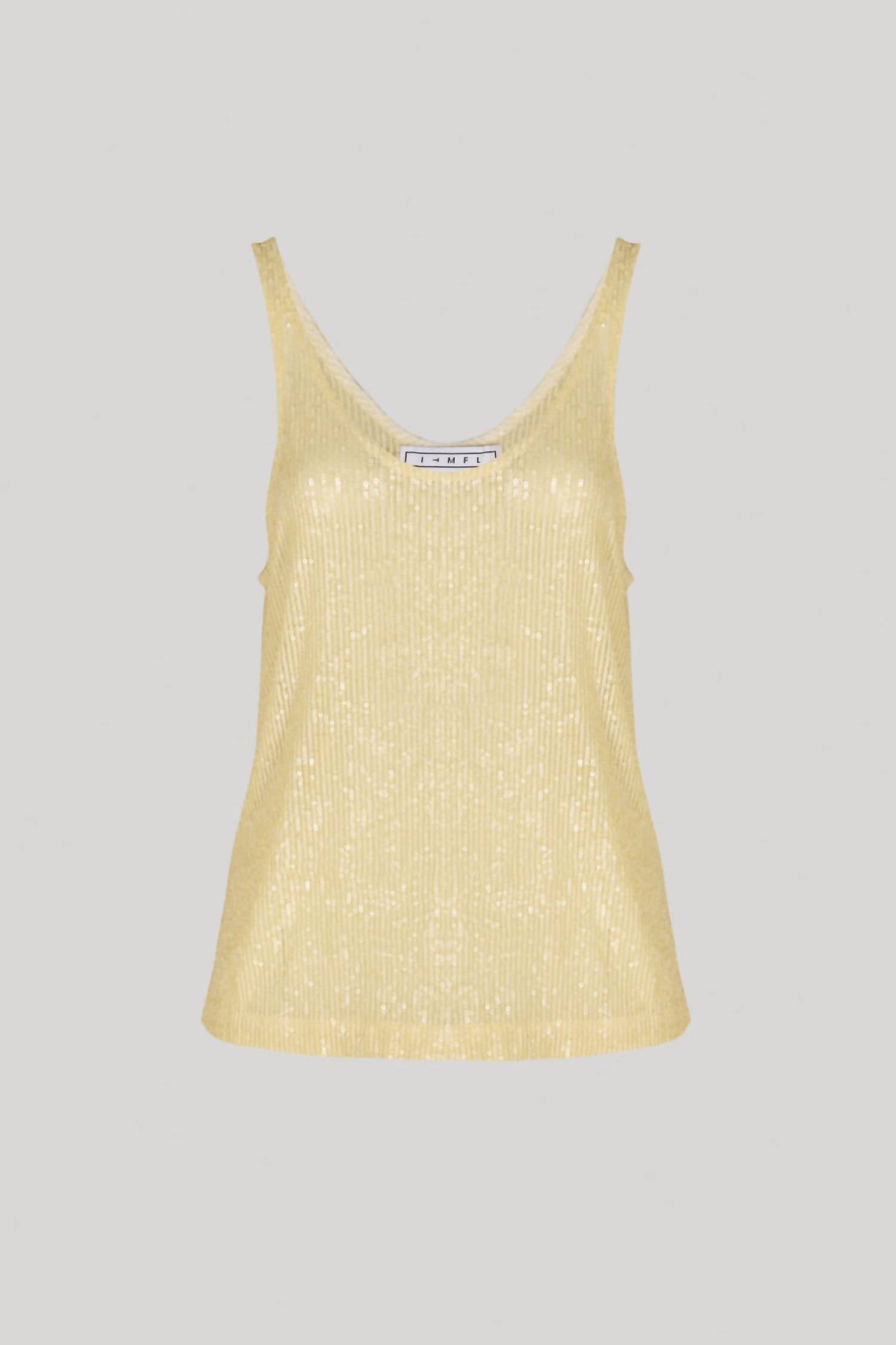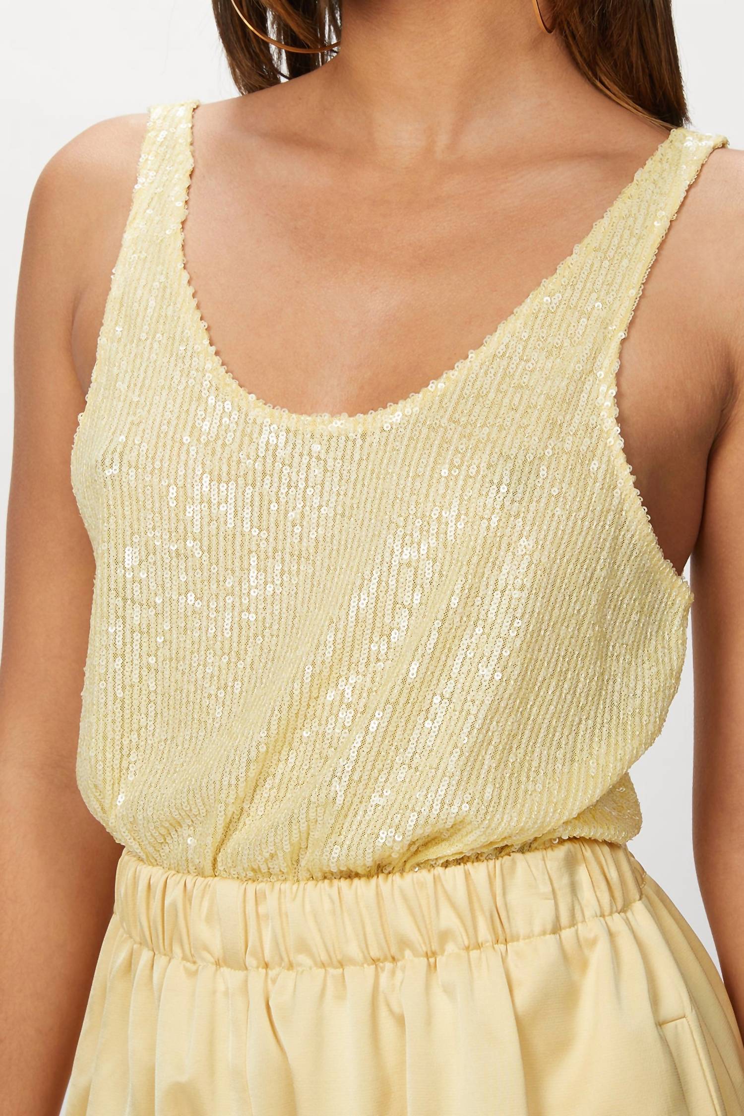 In The Mood For Love's 'Odette' top is draped with sequins that sparkle prettily under the lights. It is cut from yellow jersey with a scoop neckline that highlights the décolletage. Complement the soft yellow hue with other pastels.Fabrication: 100% PolyesterCare: Dry cleanMade in Turkey - Standard Clothing SizingCheyenne is wearing size XS