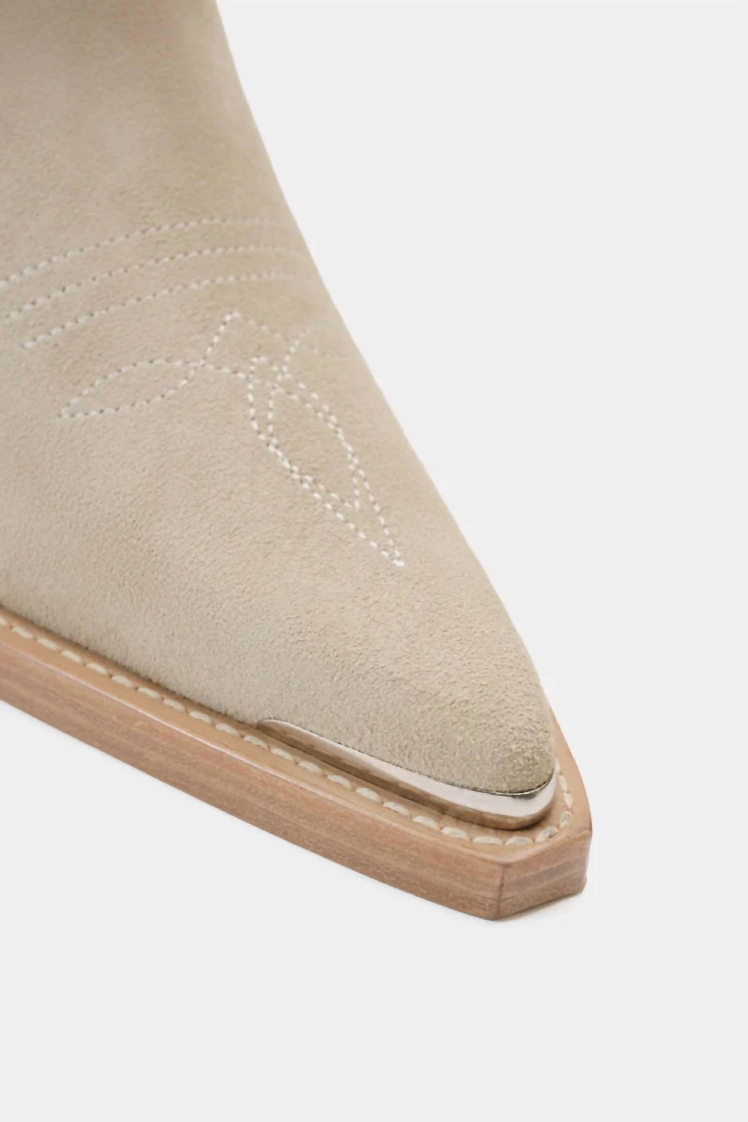 Step out in confidence and showcase your impeccable taste with these fashionable and versatile boots. Their classic style will have you reaching for these boots season after season. Elevate your style with the Women's Gilia Western Fashion Leather Boots by Dante Shoes, crafted in stone-colored suede for a sleek finish. Featuring a bold metallic pointed toe and a sturdy block heel, these knee-high boots redefine elegance with a 2.95-inch lift. Perfect for evening events and New Year's Eve celebrations, they embrace the Western trend with modern sophistication. Designed for the modern woman, these statement boots offer a blend of luxury and comfort ideal for fall gatherings.