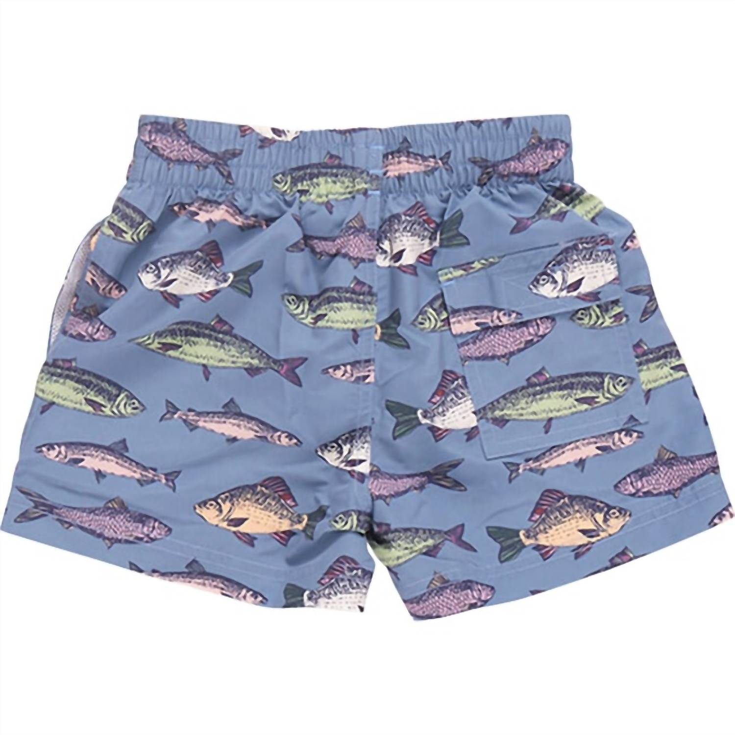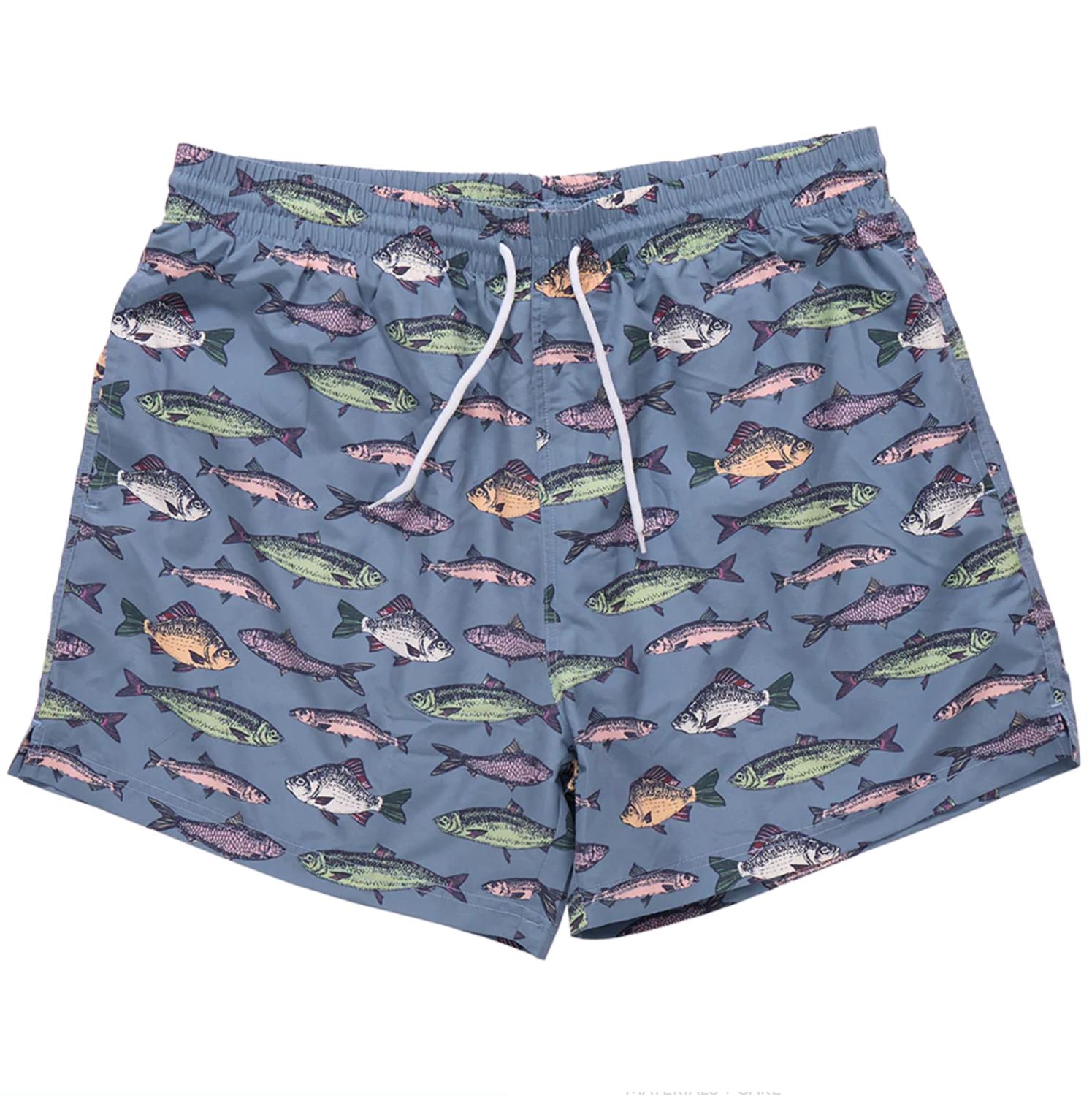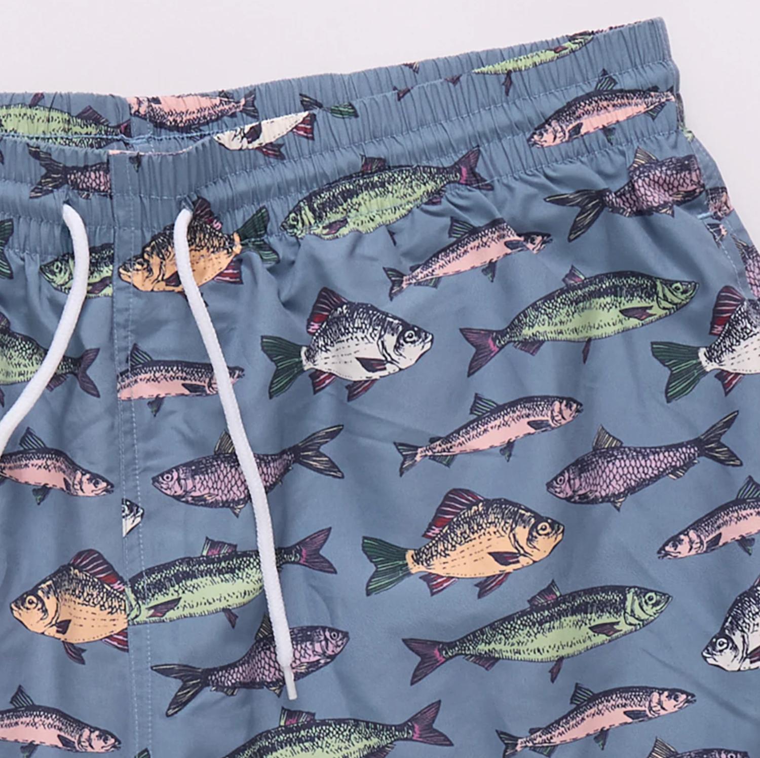 Dive into summer with PINK CHICKEN's Men's Swim Trunk, featuring a playful Bluestone Multi Fishies design. These classic swim trunks are crafted from durable nylon and hit above the knee for a modern fit, while the elasticized waistband ensures comfort and easy movement with a faux drawstring-tie closure. Practical features include roomy side pockets and a velcro back pocket, complete with mesh lining for added support. Care is a breeze with machine washing and tumble drying instructions.