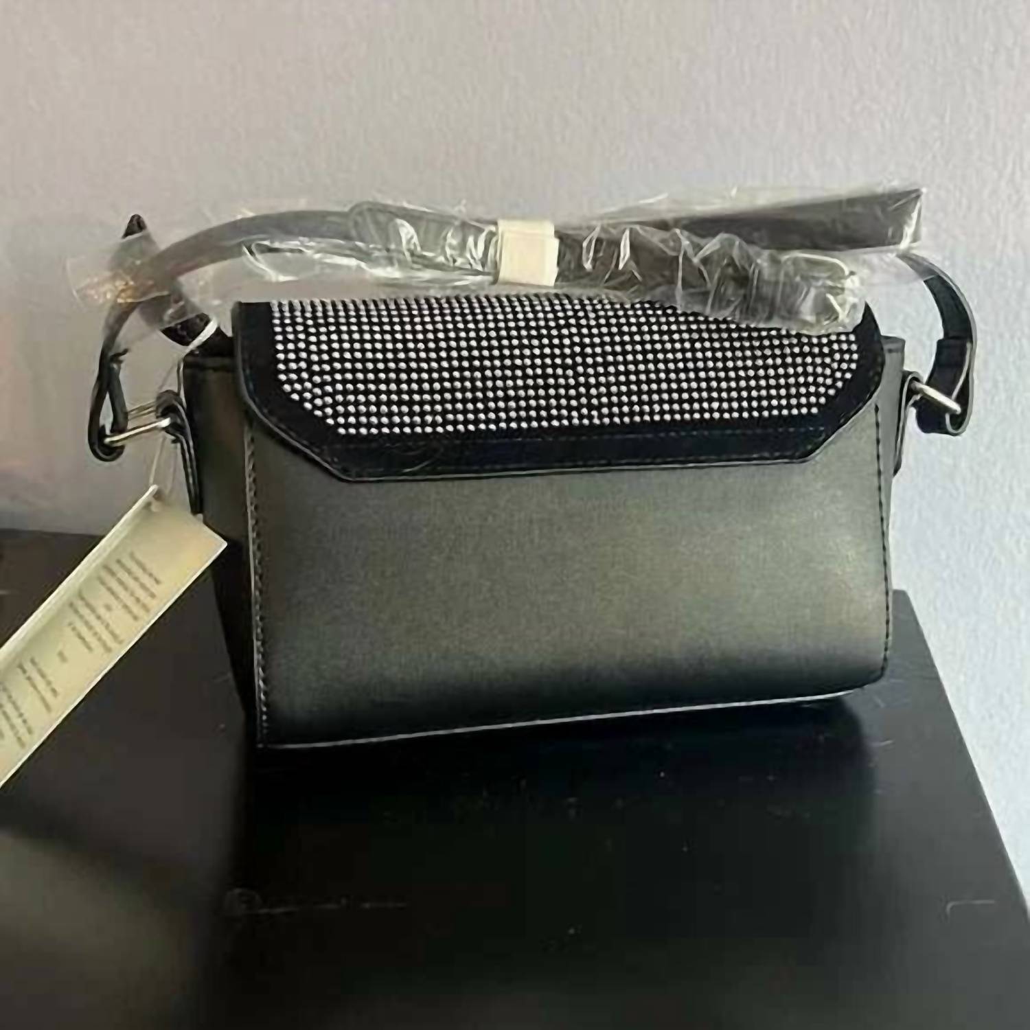 A casual and cute take on everyone's favorite crossbody bag. Elevate your accessory game with the Women's Rhinestone Studded Crossbody by BADGLEY MISCHKA. This black and silver bag is crafted from sustainable vegan leather, showcasing a dazzling rhinestone-studded design. It features an adjustable crossbody strap and a secure zip closure, with expert Italian design. Dimensions: 8 by 5 by 2.5 inches.