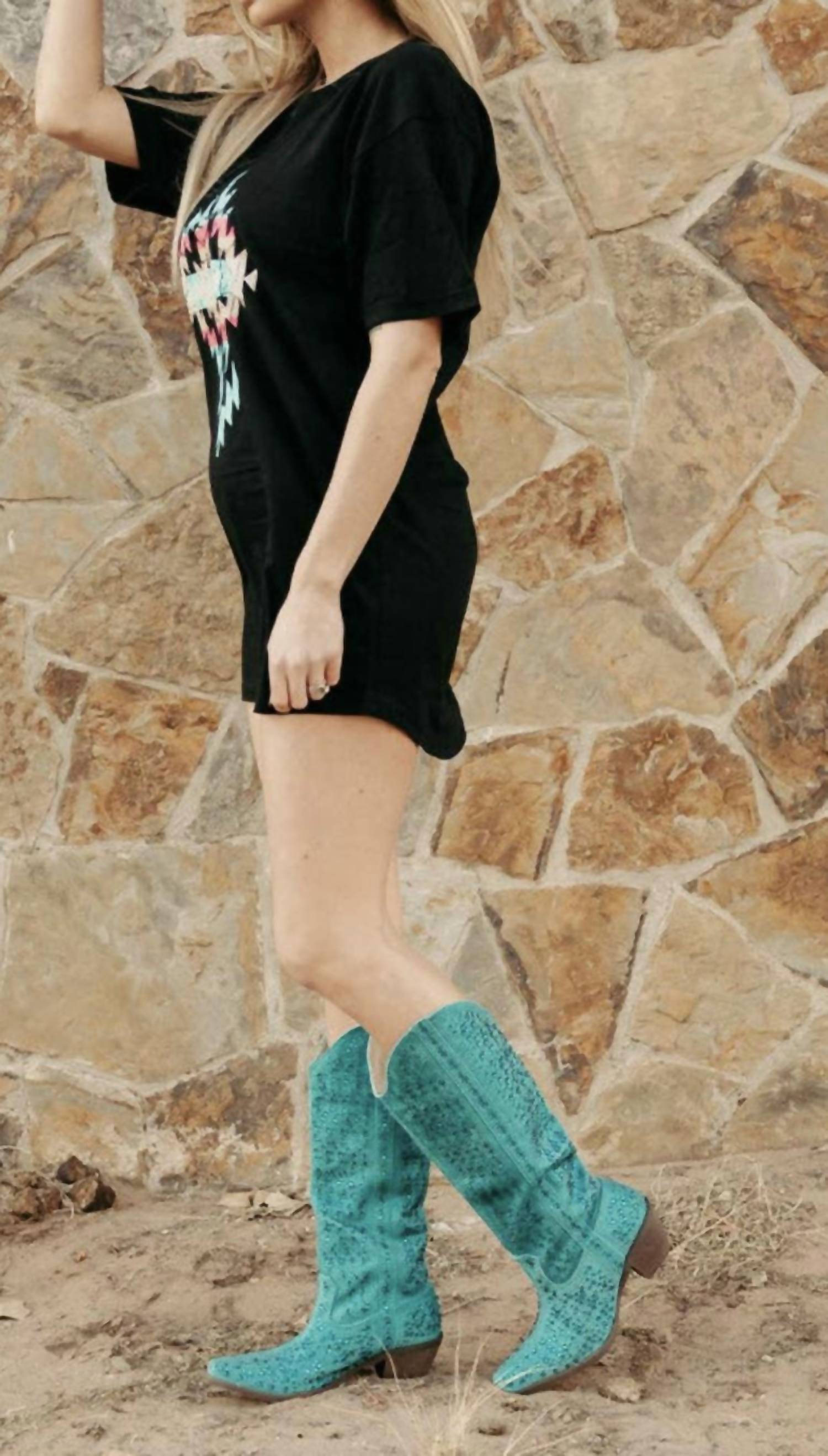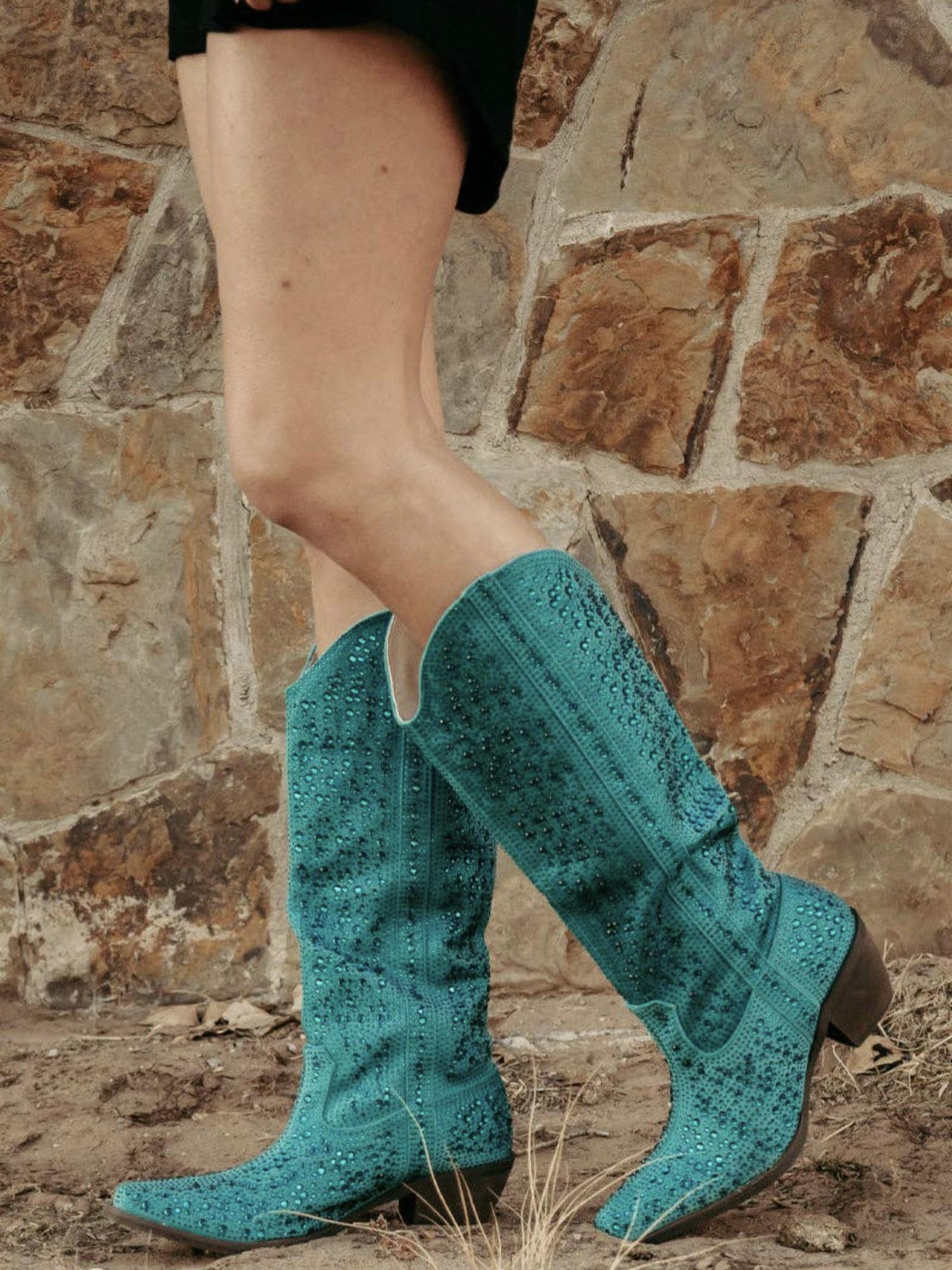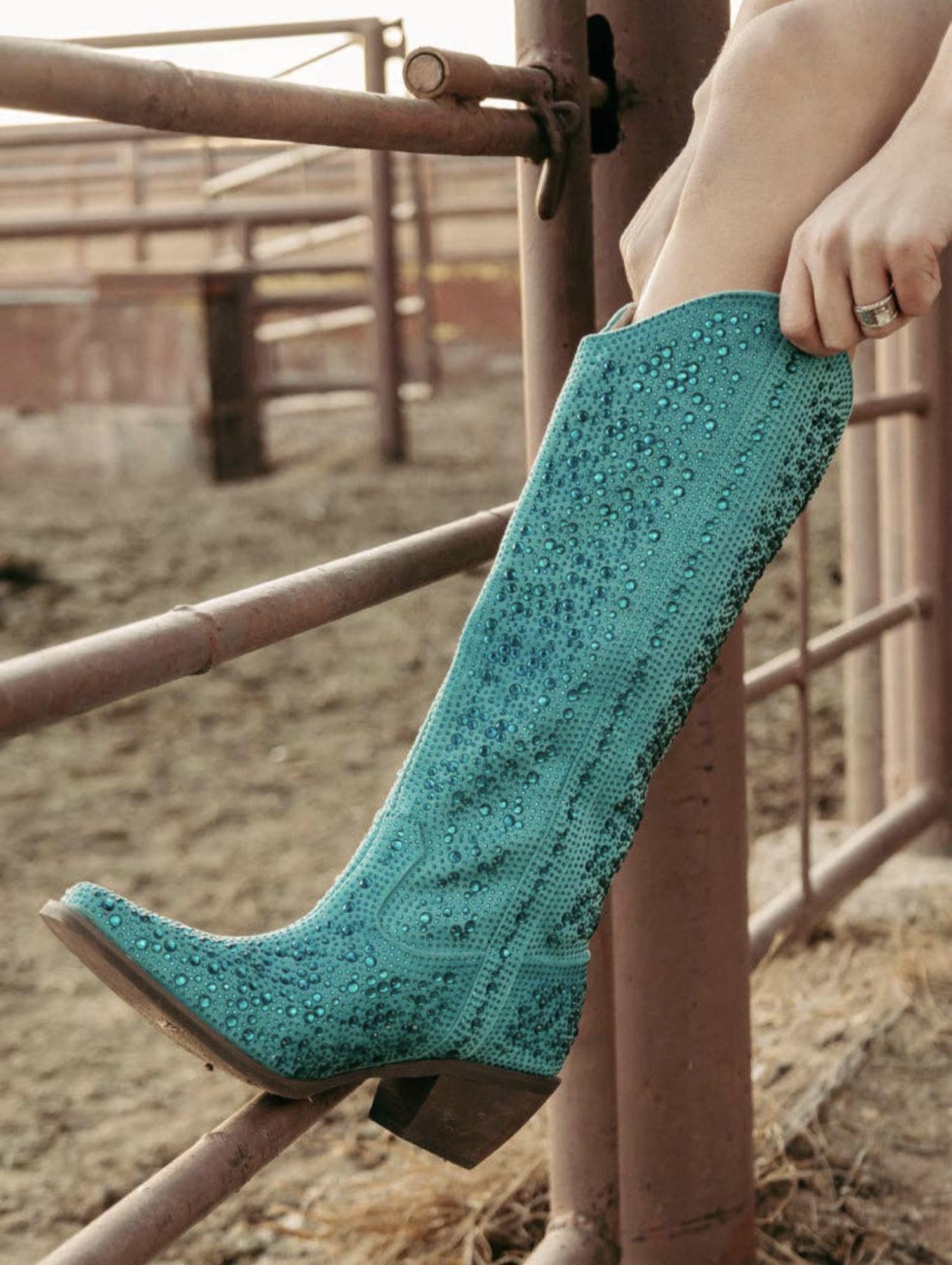 These over the knee boots are equal parts classic and cool. These enchanting bedazzled turquoise boots feature a sleek brown heel, with a 2.5" heel height, a boot height of 16", and a calf circumference of 8".