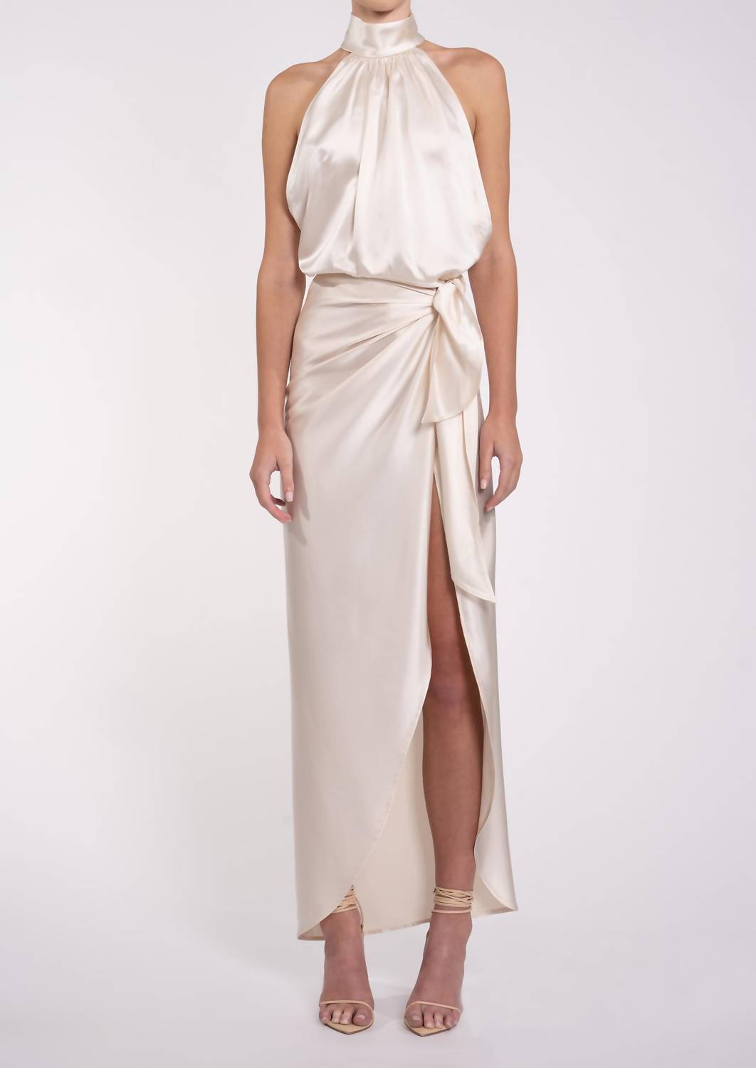 An unexpected twist on a classic style dress. In cooler weather, throw on your favorite blazer for a more sophisticated look. Introducing the Aulie Backless Dress by Nonchalant Label, a statement piece in a sophisticated champagne hue perfect for special occasions. This solid, sleeveless wrap dress features a halter neckline, high slit, and a chic backless design that embodies quiet luxury. Closure: Hook and eye closure. Ideal for summer engagements and Thanksgiving celebrations.