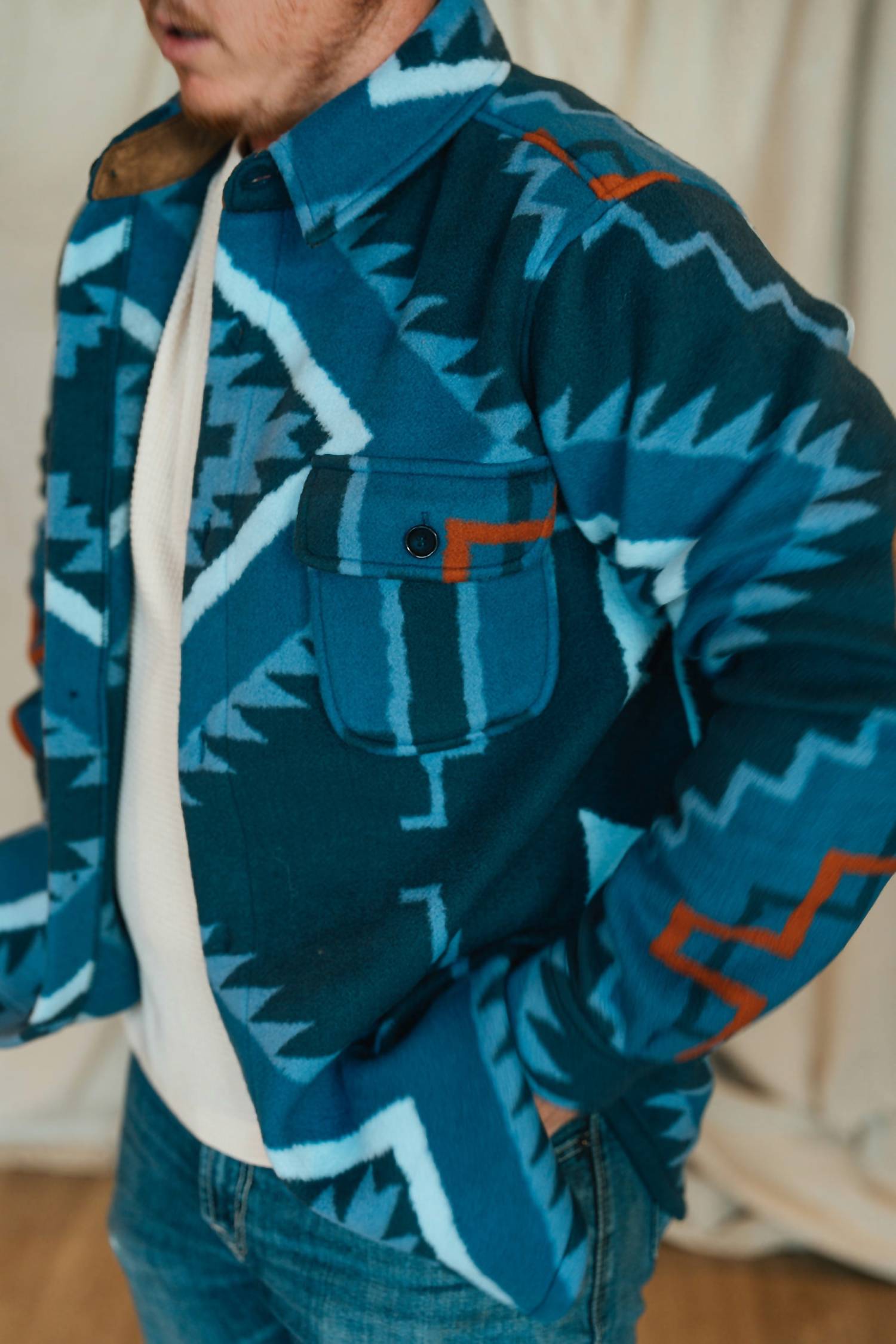 Stay cozy and stylish in the Navy Blanket Shirt by Tasha Polizzi. Crafted from fleece material, this casual button-down shirt features a statement Aztec print and practical elbow patch detail. Designed with long sleeves, a collared neckline, and convenient front pockets, it comes with a button closure. For care, simply hand wash the shirt to maintain its warmth and style.