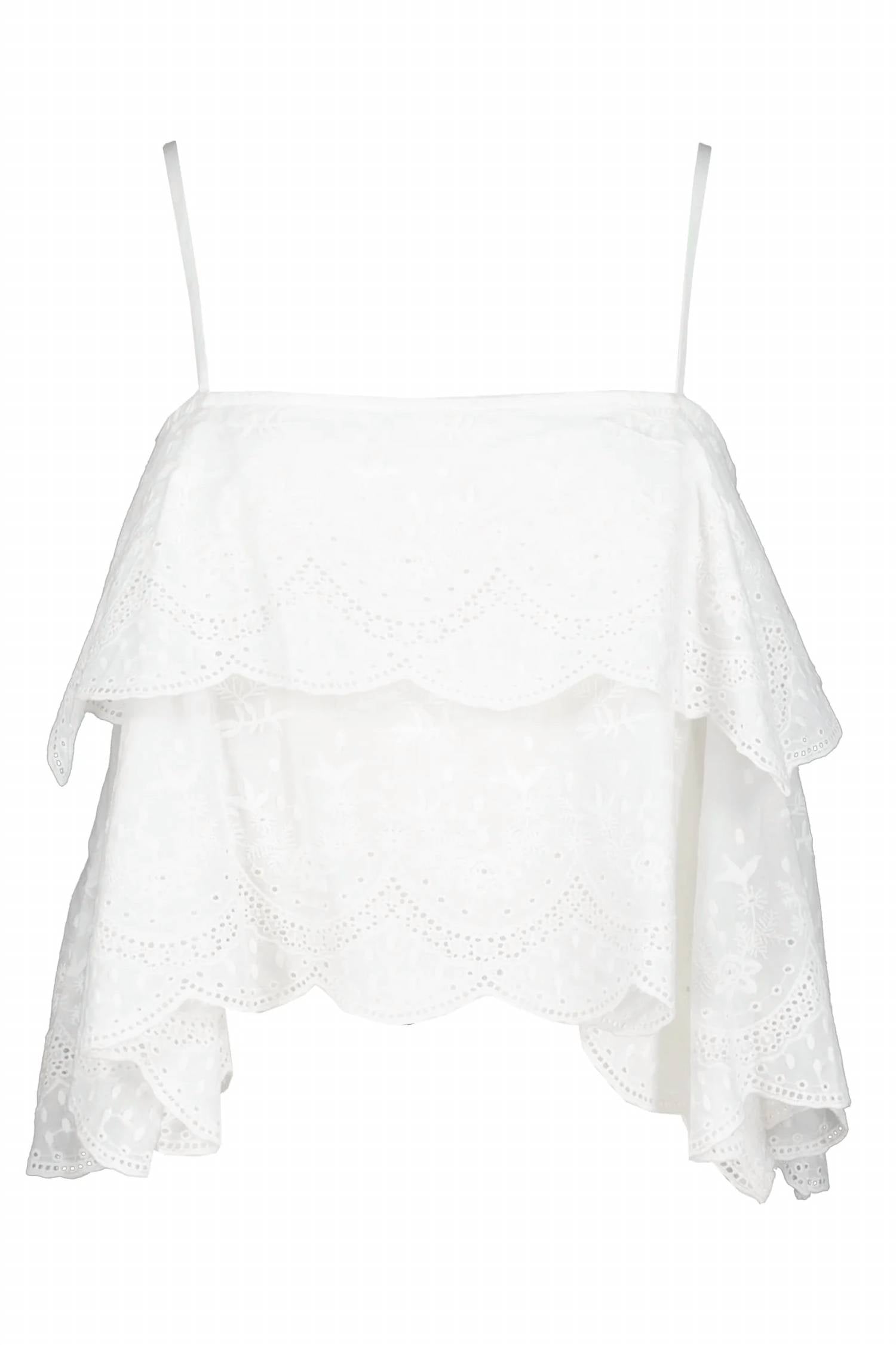 Tuck this cami into your favorite pair of jeans for a casual yet polished look. The bishop + young Capri Scalloped Cami Top in white is a boho chic essential for your summer wardrobe. Featuring delicate spaghetti straps and a squareneck, this camisole flaunts scalloped tiers of eyelet embroidery in a textured pattern. Its flowy silhouette adds a touch of elegance, while the pull-on closure ensures ease of wear. Care instructions include hand washing to maintain its intricate design.