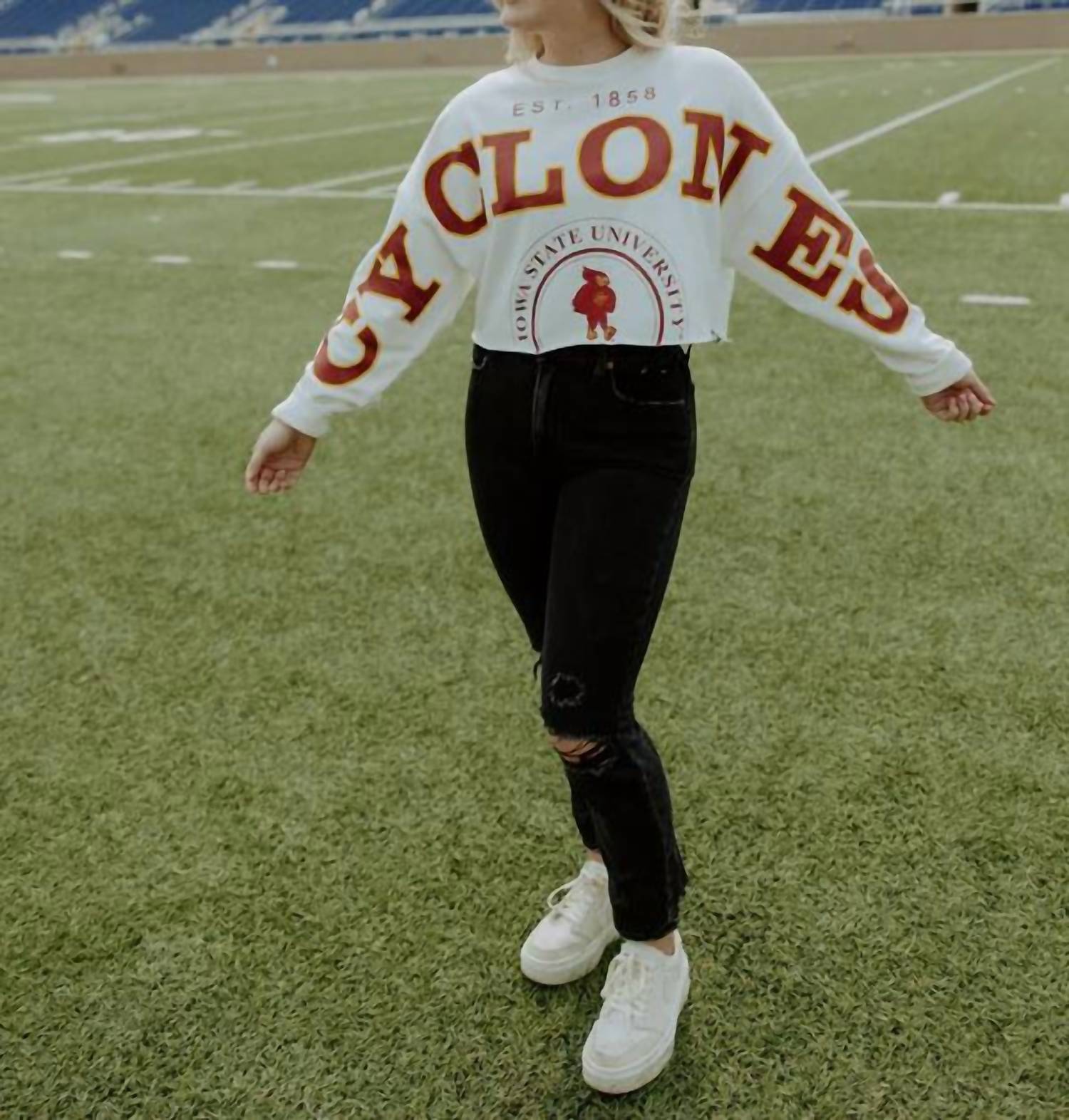 Show a little skin in this cute and casual crop top. Elevate your game day style with the ISU Split Sleeve Cropped Crew by Gameday Social, designed to show off your CYCLONE spirit. This white graphic crewneck features long sleeves and a trendy raw hem with a dropped shoulder for a relaxed fit. Closure: Pull on. Ideal for pairing with denim shorts and cowboy boots, this piece is a must-have for any collegiate wardrobe.