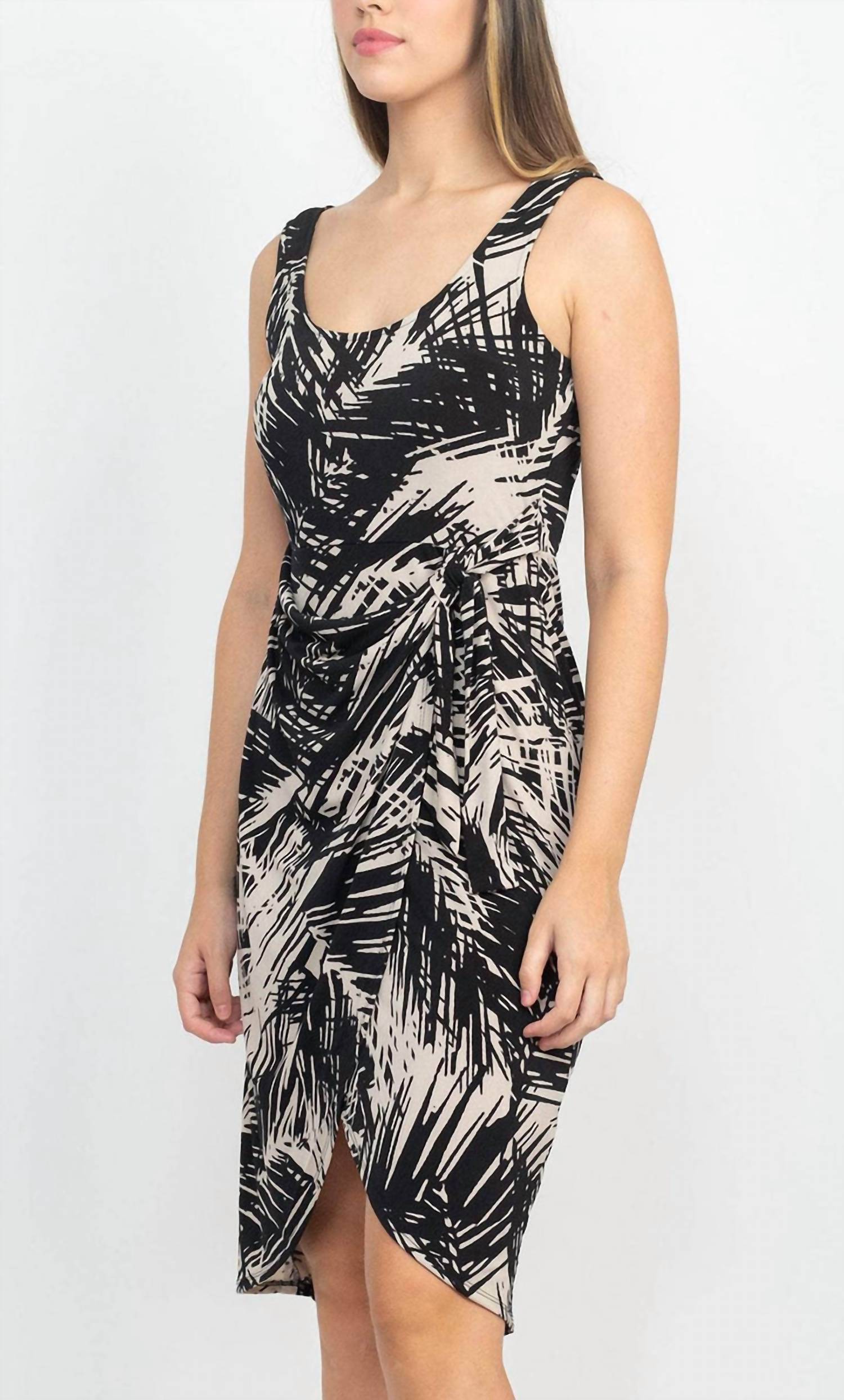 Show off just the right amount of skin in this adorable assymetrical dress. Elevate your summer wardrobe with the Andi Printed Sleeveless Dress by London Times, perfect for a dinner party with its elegant scoop neck and faux sarong design. This patterned A-line dress in taupe and black is crafted from 95% Polyester and 5% Spandex, offering a comfortable and stylish fit. Featuring a pull-on closure, this asymmetrical piece embodies quiet luxury and requires no special washing or drying instructions. Made for women who love a chic yet effortless look.