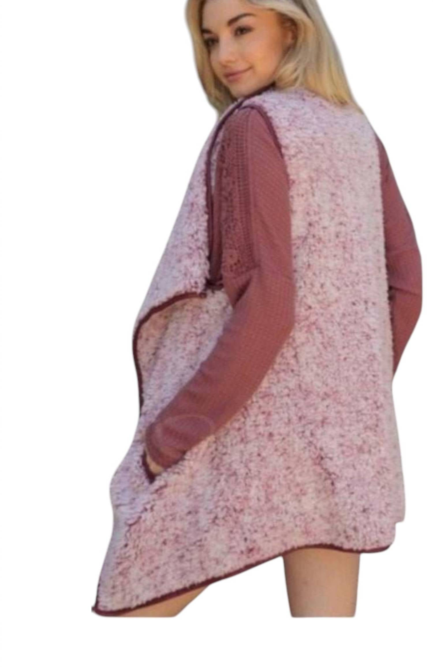 A vest so versatile you can mix and match it with almost any outfit and it will feel brand new every time. Elevate your layering game with the Vegan Faux Fur Sherpa Vest by Davi & Dani, crafted in a rich wine hue. This sleeveless vest features a chic wide collar and practical side slip pockets, making it both fashionable and functional. Made from a vegan-friendly blend of 75% polyester and 25% synthetic fiber, it offers durability and warmth. Enjoy the effortless pull-on closure as you add this solid-patterned faux fur piece to your wardrobe.