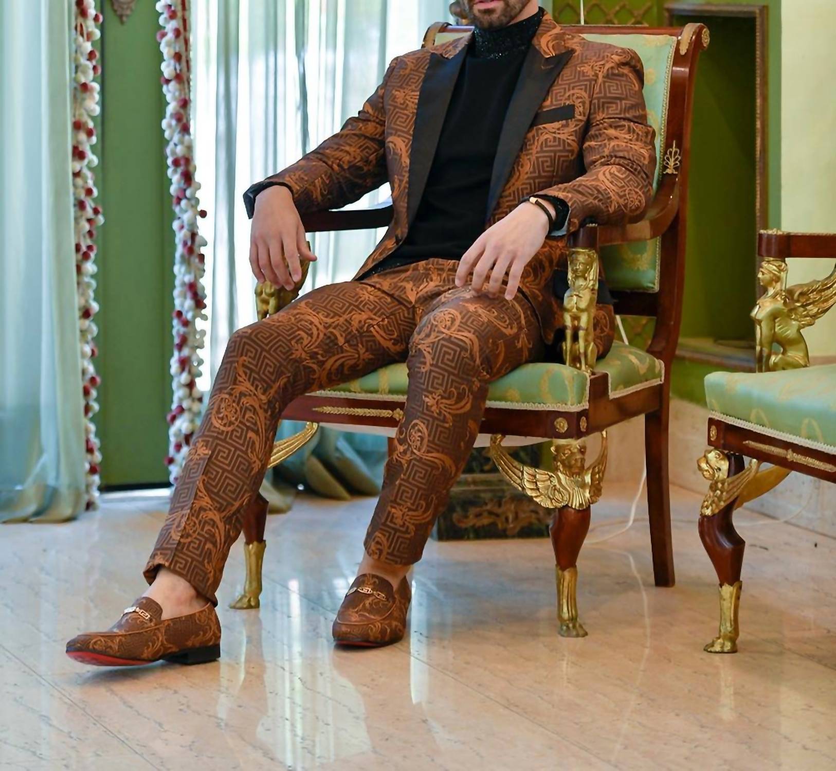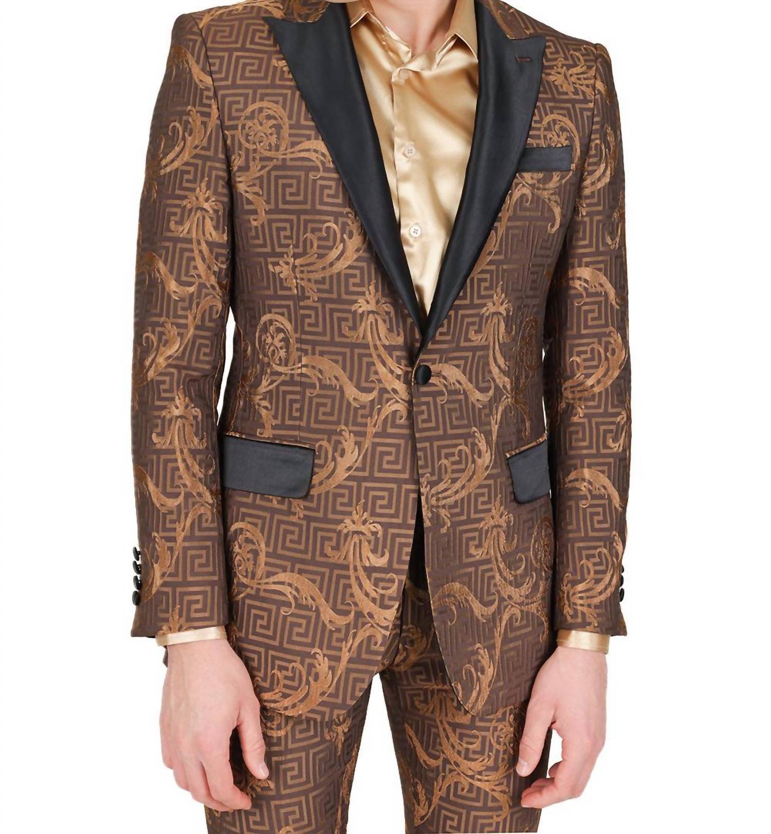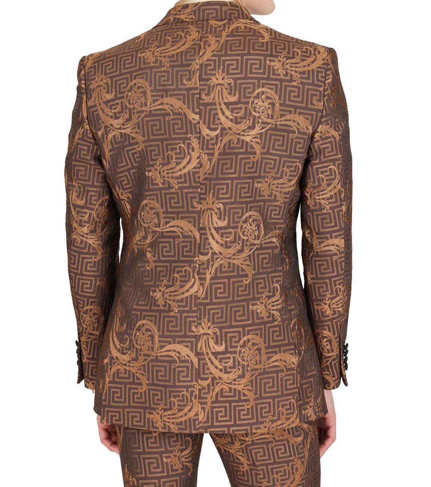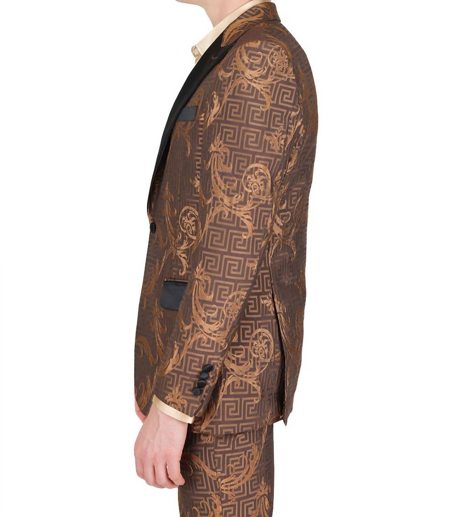 Step into sophistication with the Baroque Greco Blazer by BARABAS. Crafted with long sleeves and a regular length, this blazer is composed of 100% polyester, showcasing an ornate Greek key and baroque pattern. It features a slim fit with a satin notch lapel, button closure, and is beautifully finished with front welt chest and hip pockets, along with an interior pocket for a touch of functionality. For care, remember to dry clean only to maintain its impeccable quality.