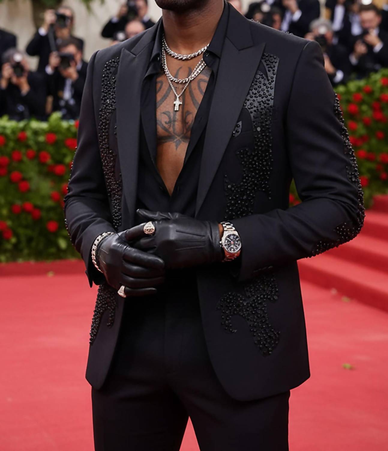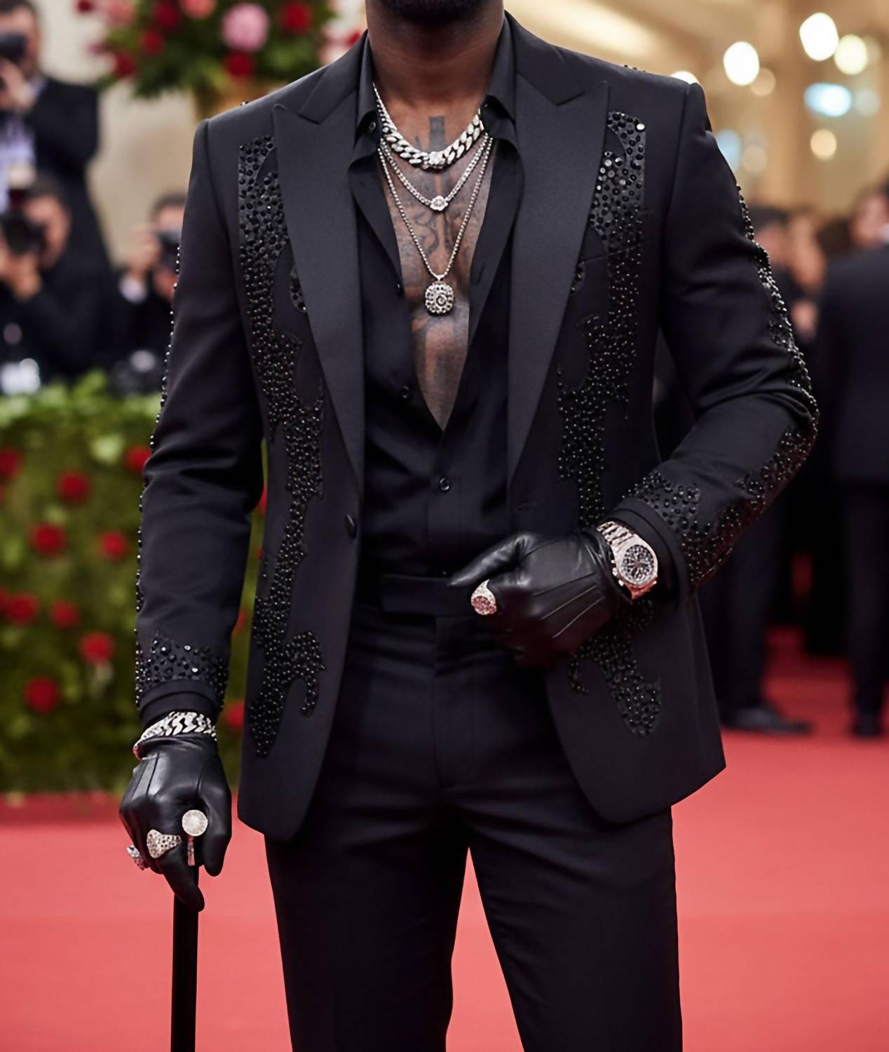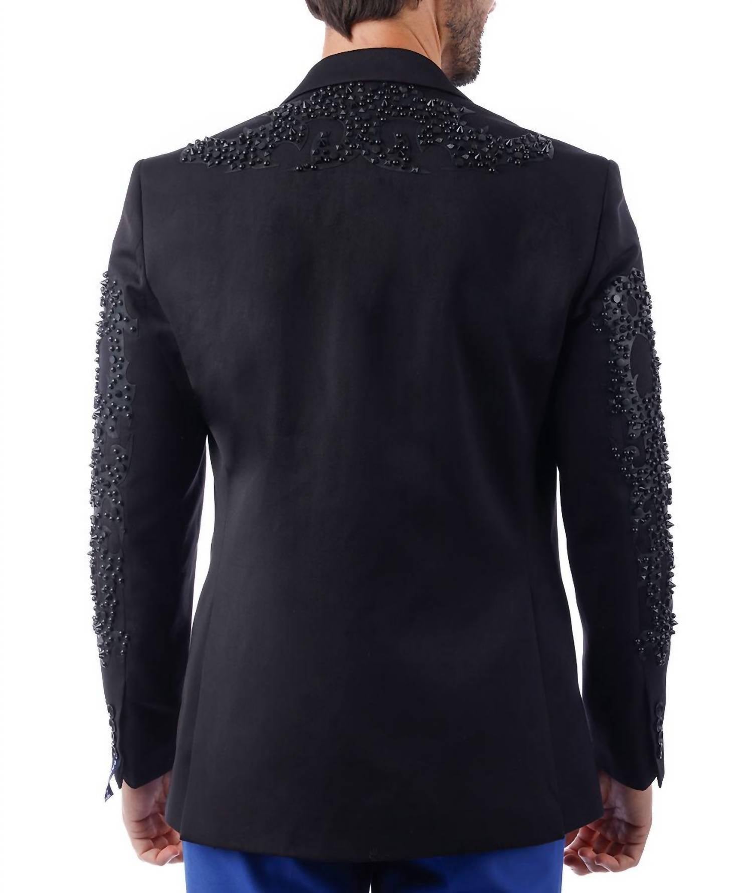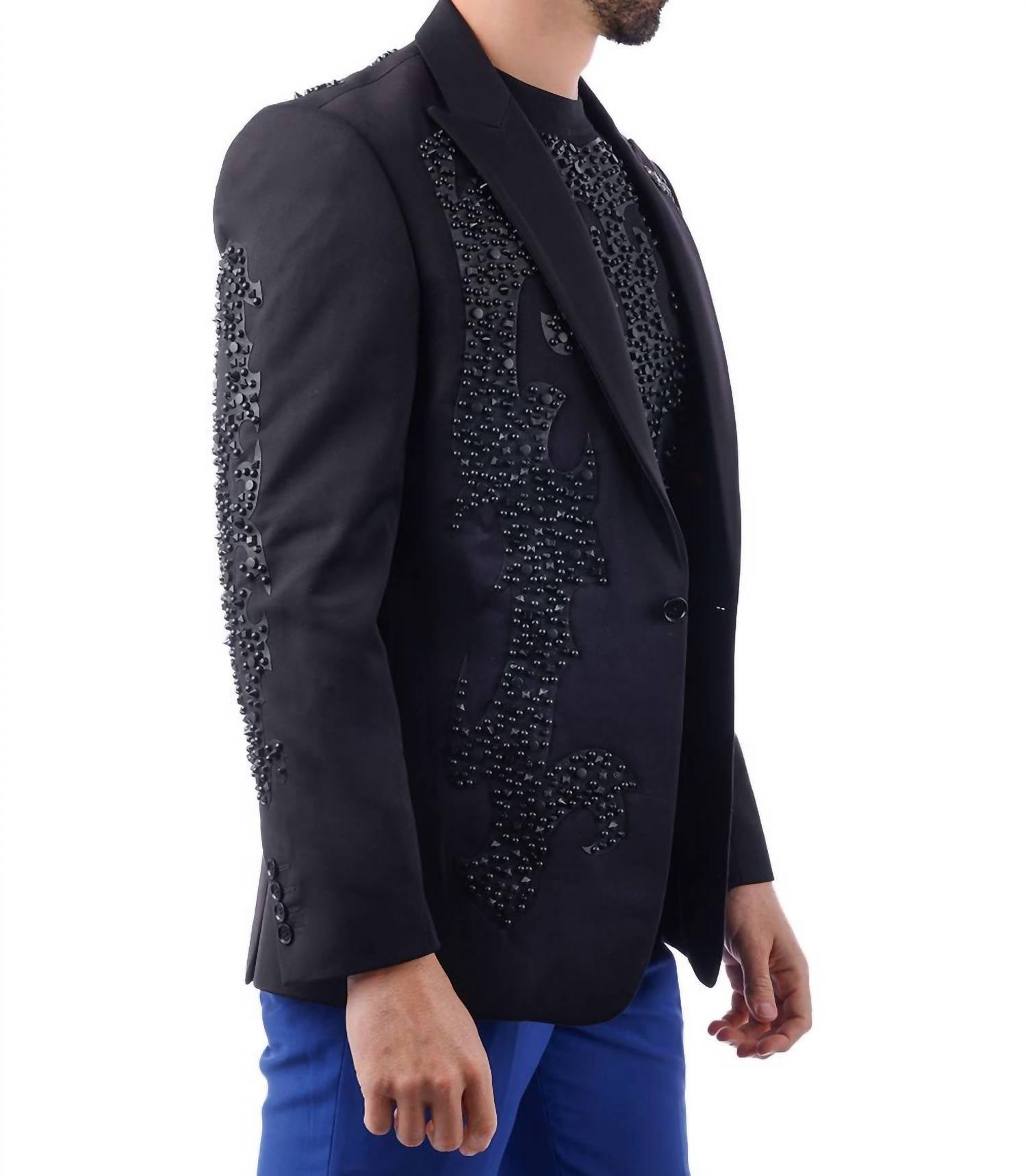 Elevate your wardrobe with the Edgy Trieste Blazer by BARABAS, a standout from the Elite blazer collection. This long sleeve slim-fit piece, in striking black, showcases an eye-catching rhinestone and stud geometric design with a decorative peak lapel collar. Crafted from 80% Regenerated fiber and 20% Rayon, it offers a regular length with a convenient one-button closure and is adorned with four-button cuffs, welt chest, hip pockets, and an interior pocket. Care for this luxurious blazer by dry cleaning only, ensuring its sophisticated charm remains intact.